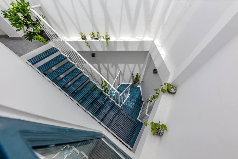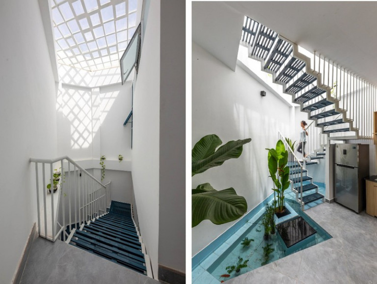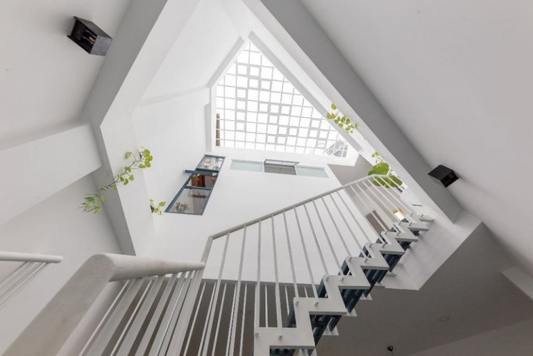 KTS đã thiết kế các không gian bên trong nhà cũng chồng chéo, đan xen lẫn nhau được ví như một trò chơi xếp hình. Hệ cầu thang thép bậc hở, khi ánh sáng rọi chiếu từ trên xuống tạo nên những khoảng chéo đan xen trên tường tạo tăng tính thẩm mỹ cho ngôi nhà.