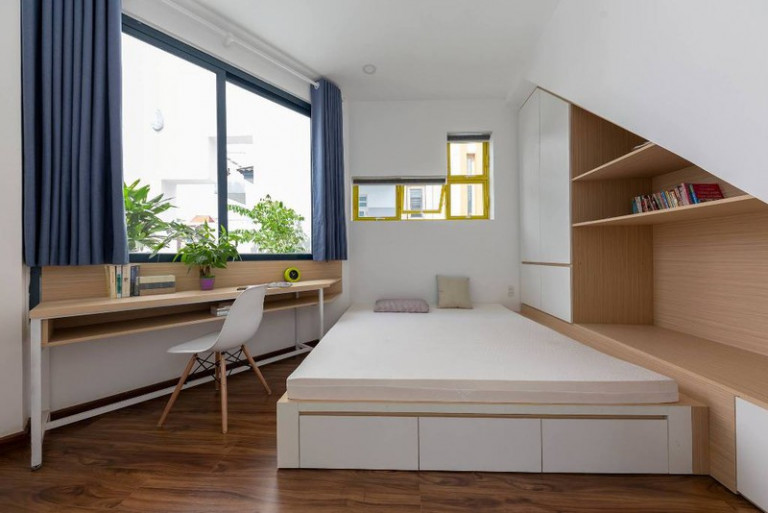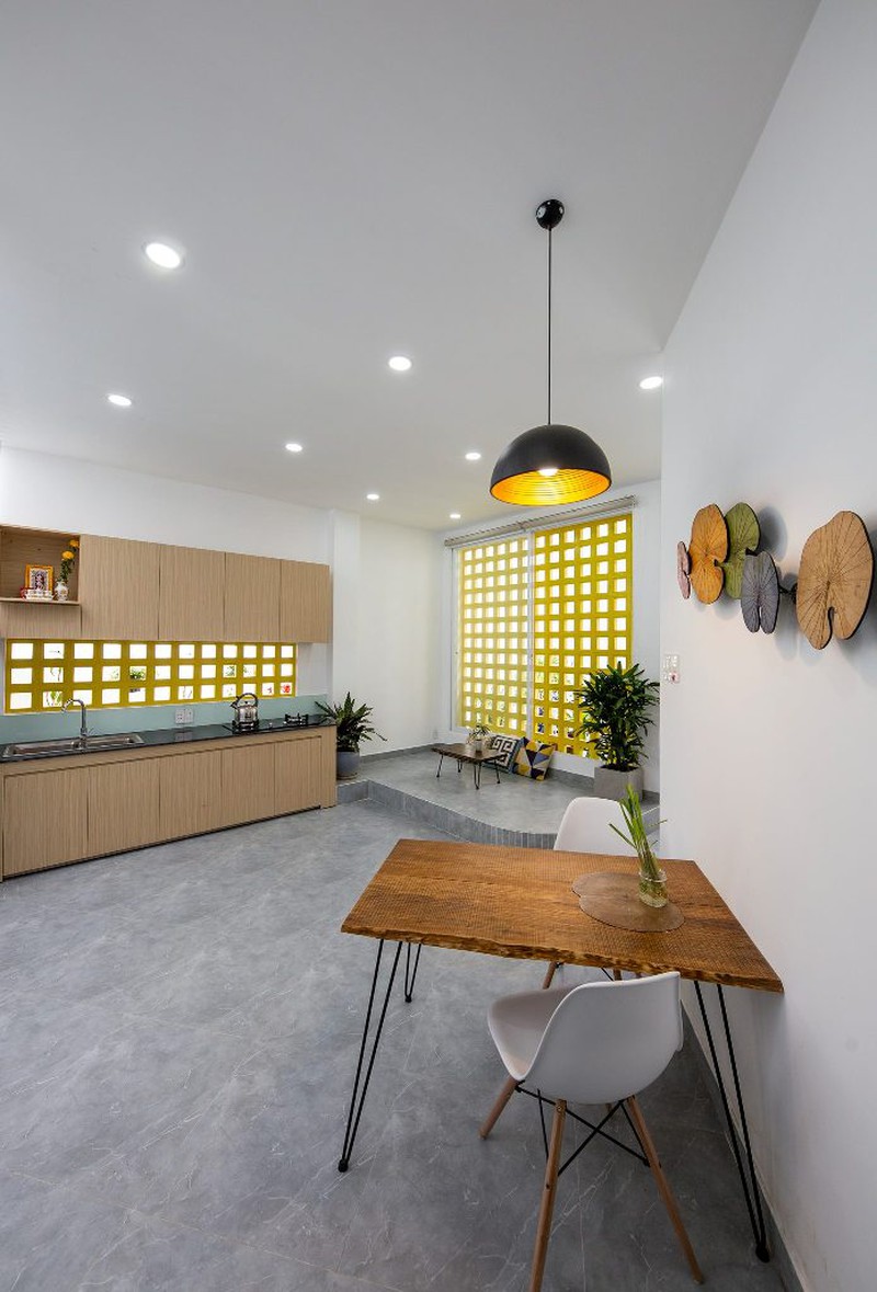 KTS của Khuôn studio cho biết, nhà của Phương có rất nhiều hạn chế về mặt kinh phí nên việc chọn các chất liệu hoàn thiện ngôi nhà khá khó khăn. Do vậy, KTS ưu tiên việc bố trí không gian, sắp xếp bố cục phòng ốc, đồ nội thất sao cho hợp lý nhất.