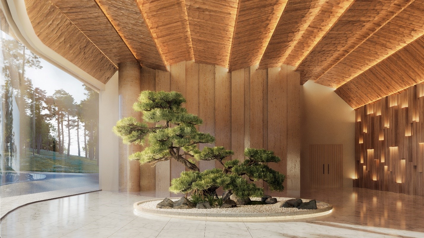 Trung tâm sảnh của tòa nhà với thiết kế được chia thành nhiều lớp xếp chồng lên nhau, gợi lên hình ảnh những tán cây trải rộng. Điều này không chỉ tăng tính thẩm mỹ mà còn cải thiện khả năng thông gió và che nắng tự nhiên. Đây vừa là biểu tượng thị giác, vừa định hình không gian ấm áp để chào đón cư dân trở về nhà.