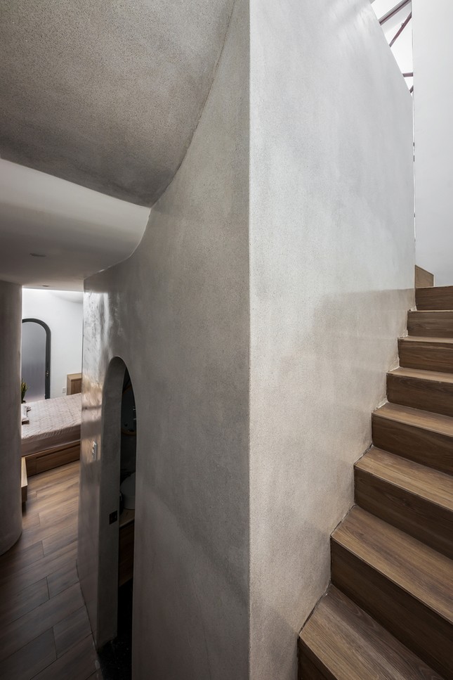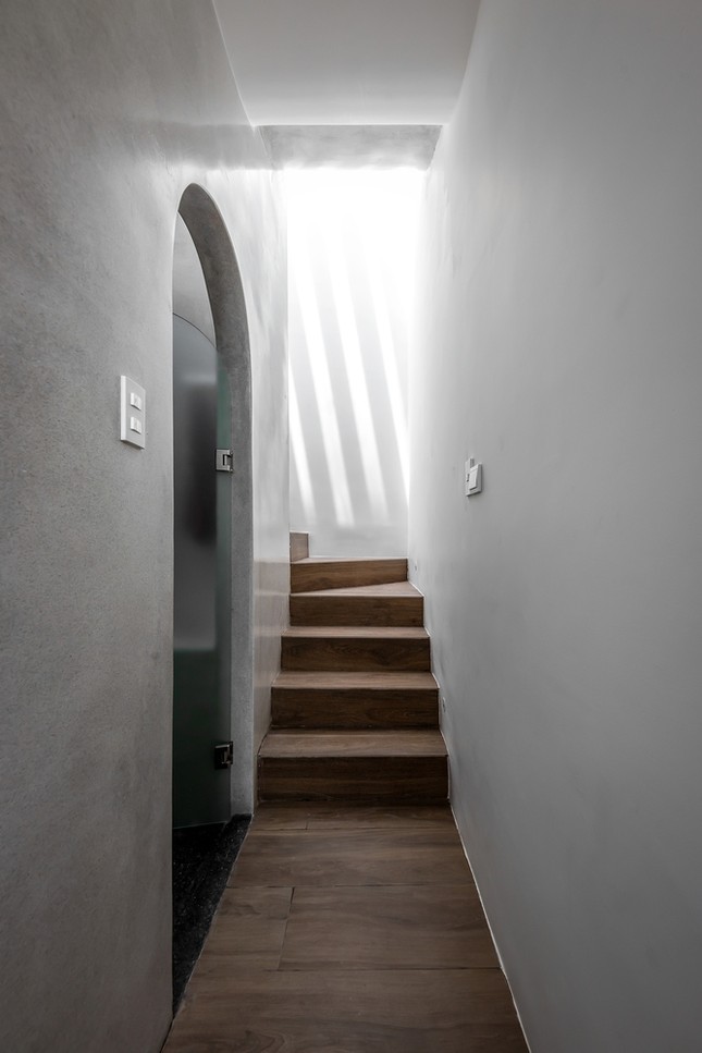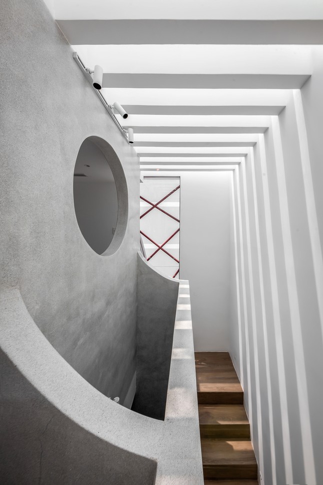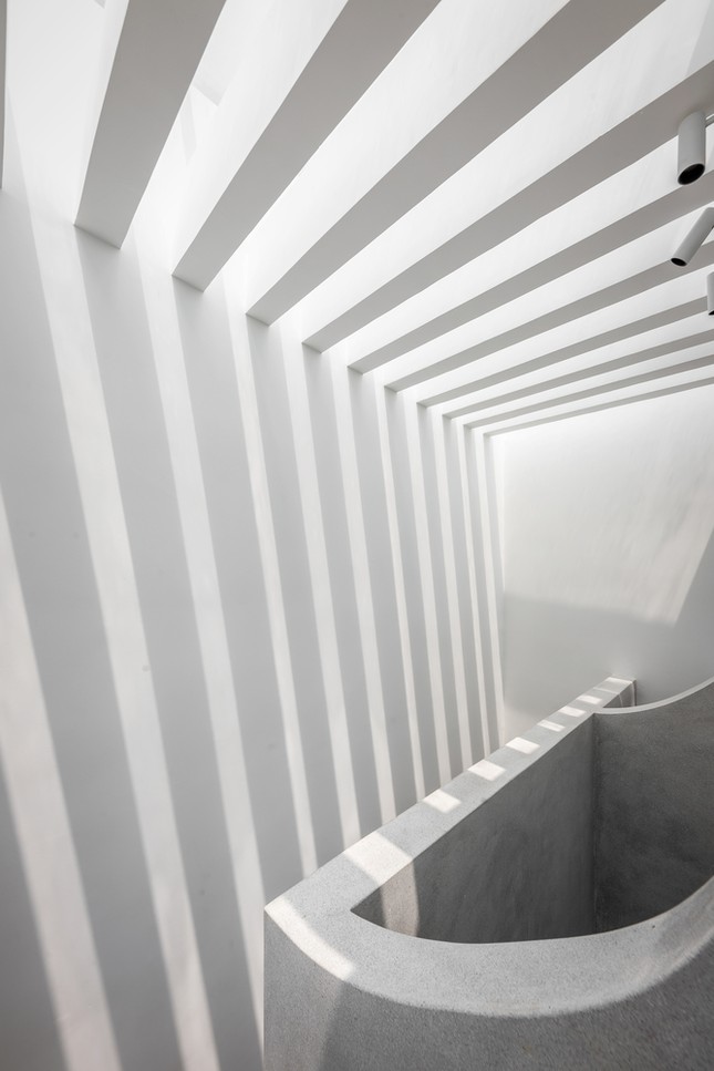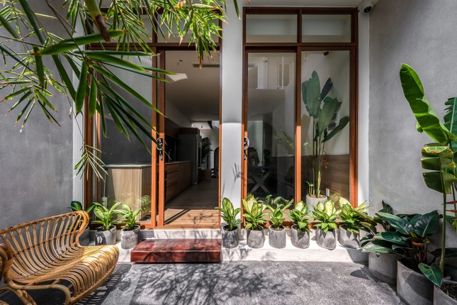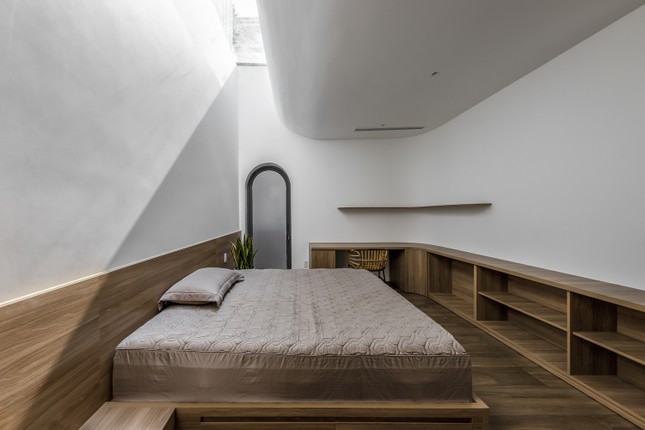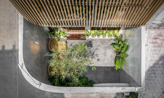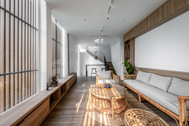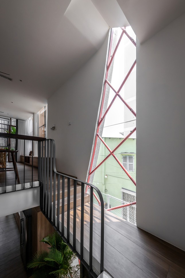 Nhờ các giếng trời và khe sáng bên trong nhà ống tràn ngập ánh sáng tự nhiên, tạo không gian sống thoải mái dù phía bên ngoài kín cổng cao tường.
