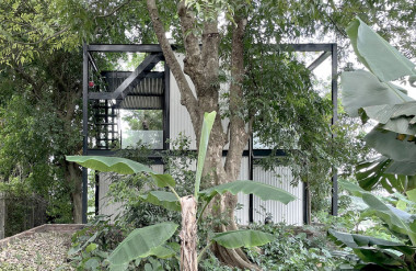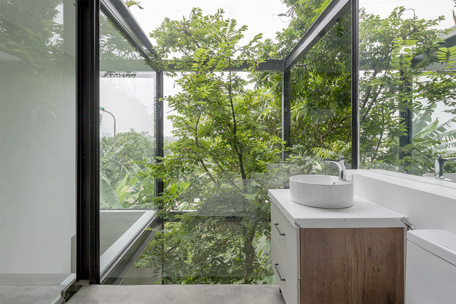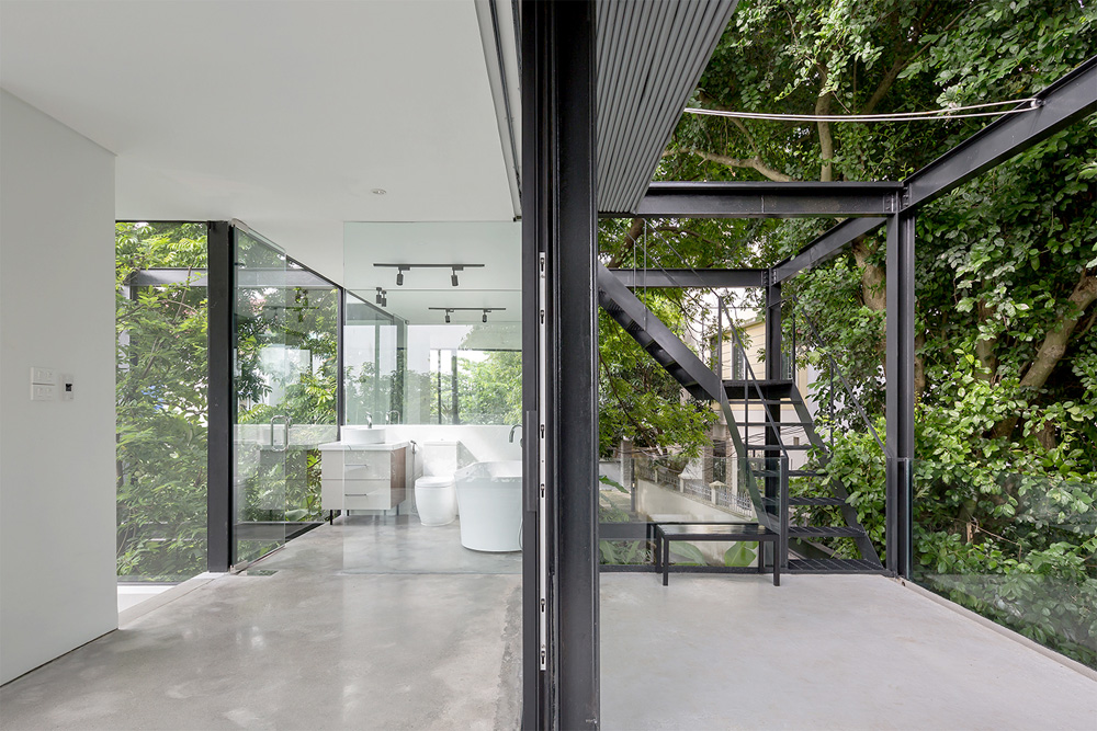 Diện tích mảnh đất nhỏ, lại có cây cổ thụ chiếm gần hết cả ba chiều không gian. Vì vậy, kiến trúc sư đã quyết định dựng một hệ kết cấu thép mảnh chỉ như gài vào tán cây. Thiết kế này giúp cho ngôi nhà “cộng sinh” được với cây to nhưng vẫn đủ các chức năng như hiên đón dưới sân, sân trước, hiên cạnh phòng ngủ, đường lên sân thượng, đồng thời bảo vệ được kính nếu cành cây bị quật khi có bão.
