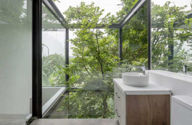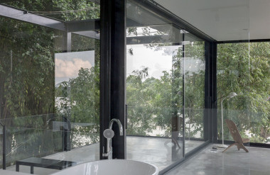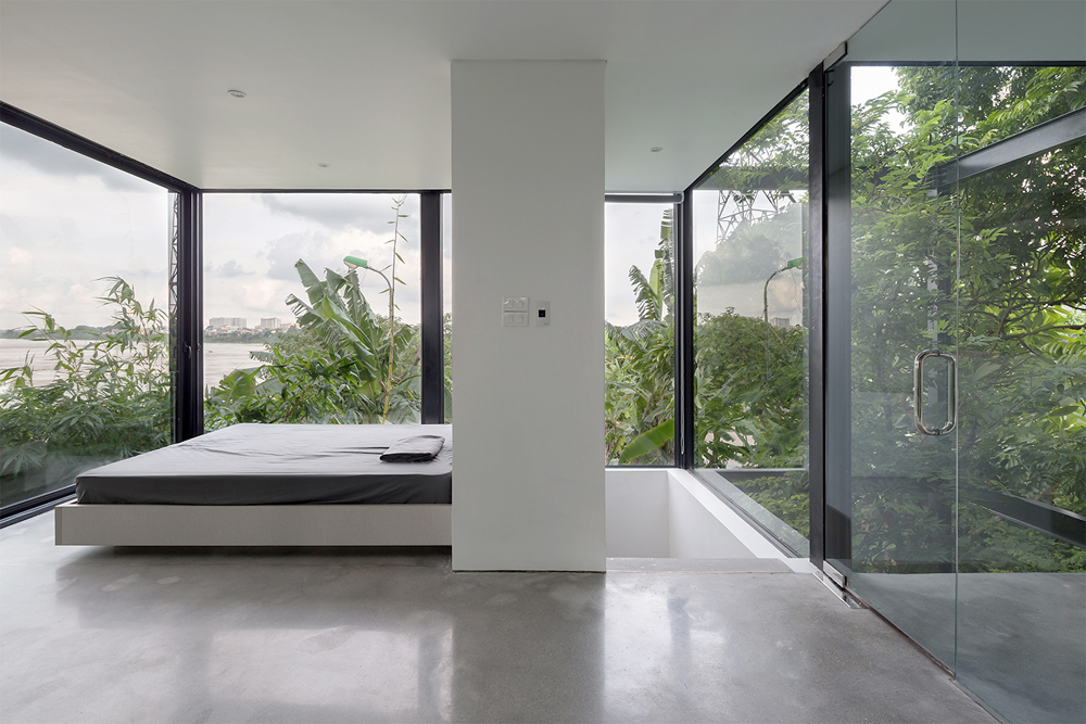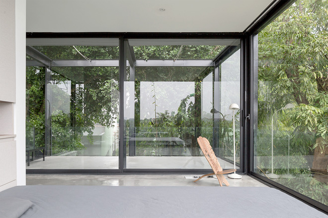 Thiết kế với 75% tường bằng vách kính là một ý tưởng táo bạo của cả kiến trúc sư và chủ đầu tư. Đồng thời, ngôi nhà trong suốt này cũng khiến nhiều người e ngại về khả năng chống nắng, nóng của công trình. Tuy nhiên, cây cối xung quanh đóng vai trò như là “lớp da” cho ngôi nhà và làm giảm bức xạ mặt trời. Ngoài ra, nhờ có gió sông và hệ vách trượt tự do nên ngôi nhà luôn có những luồng thông khí tối ưu lưu thông. Các lớp không gian dày chồng chéo làm cho ngôi nhà hòa tan vào thiên nhiên và trở thành một phần của thiên nhiên.