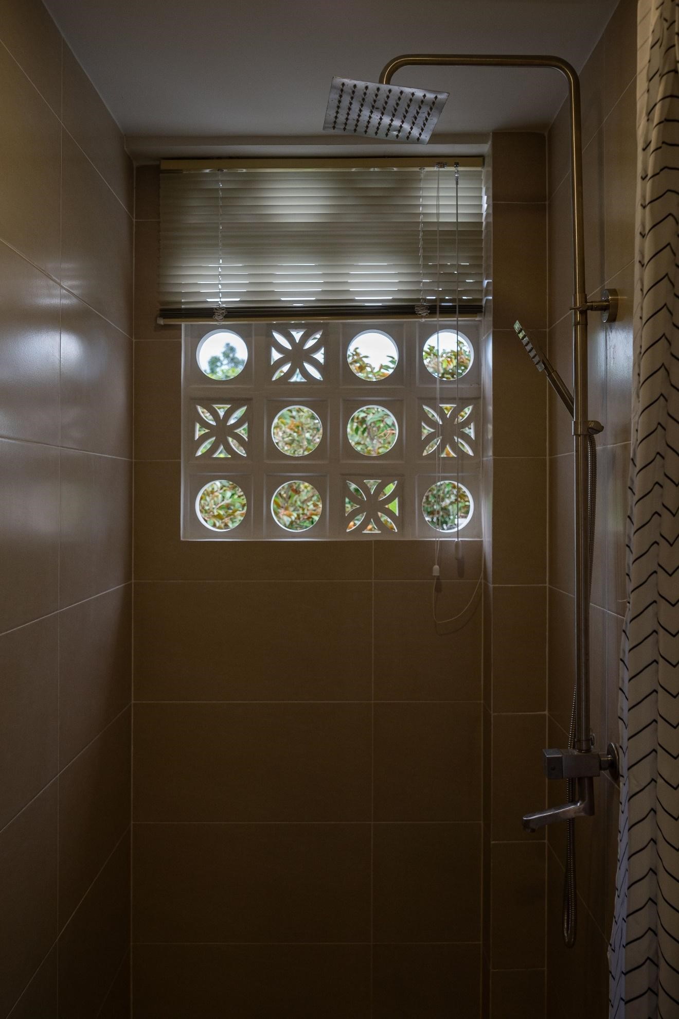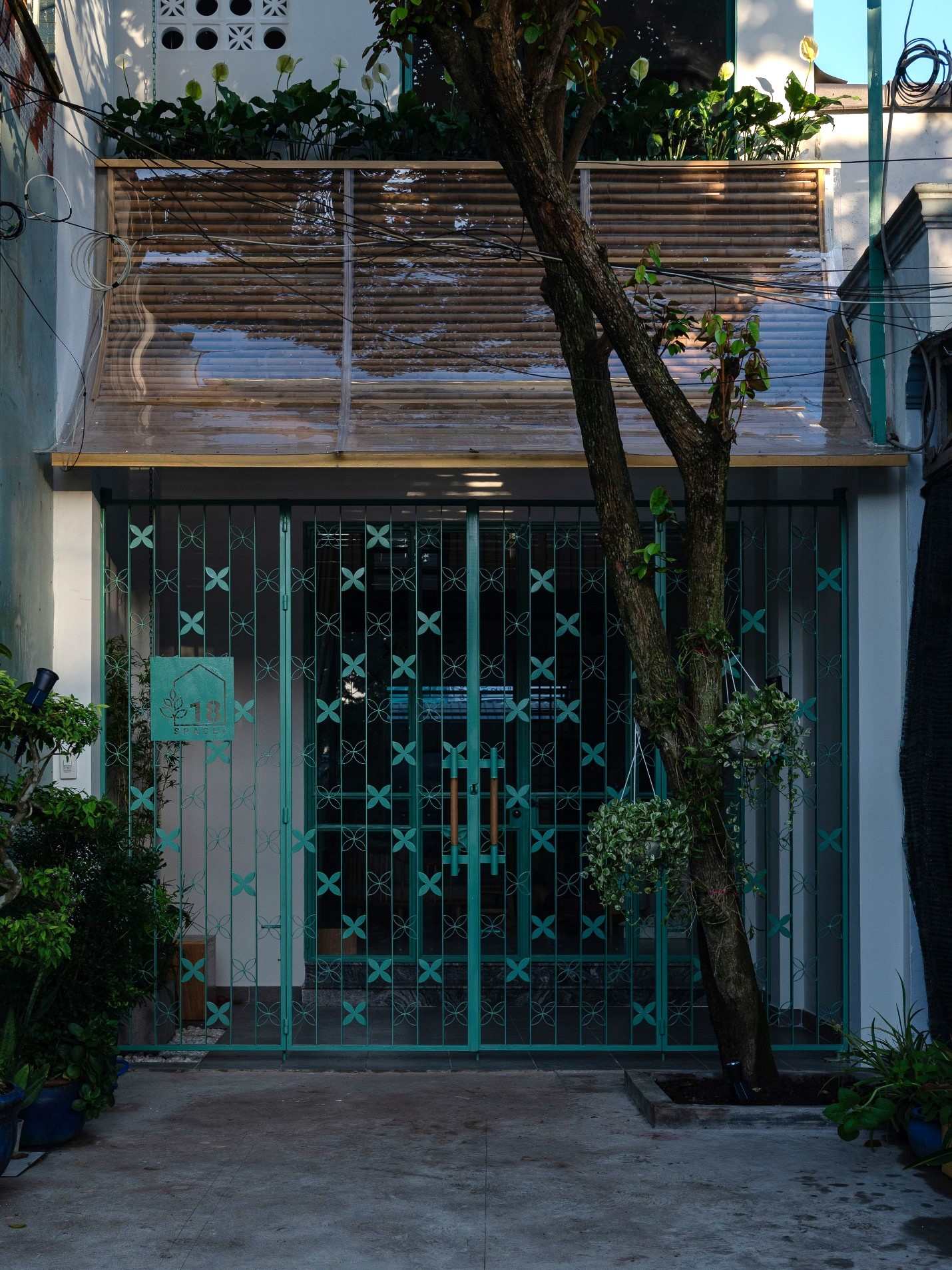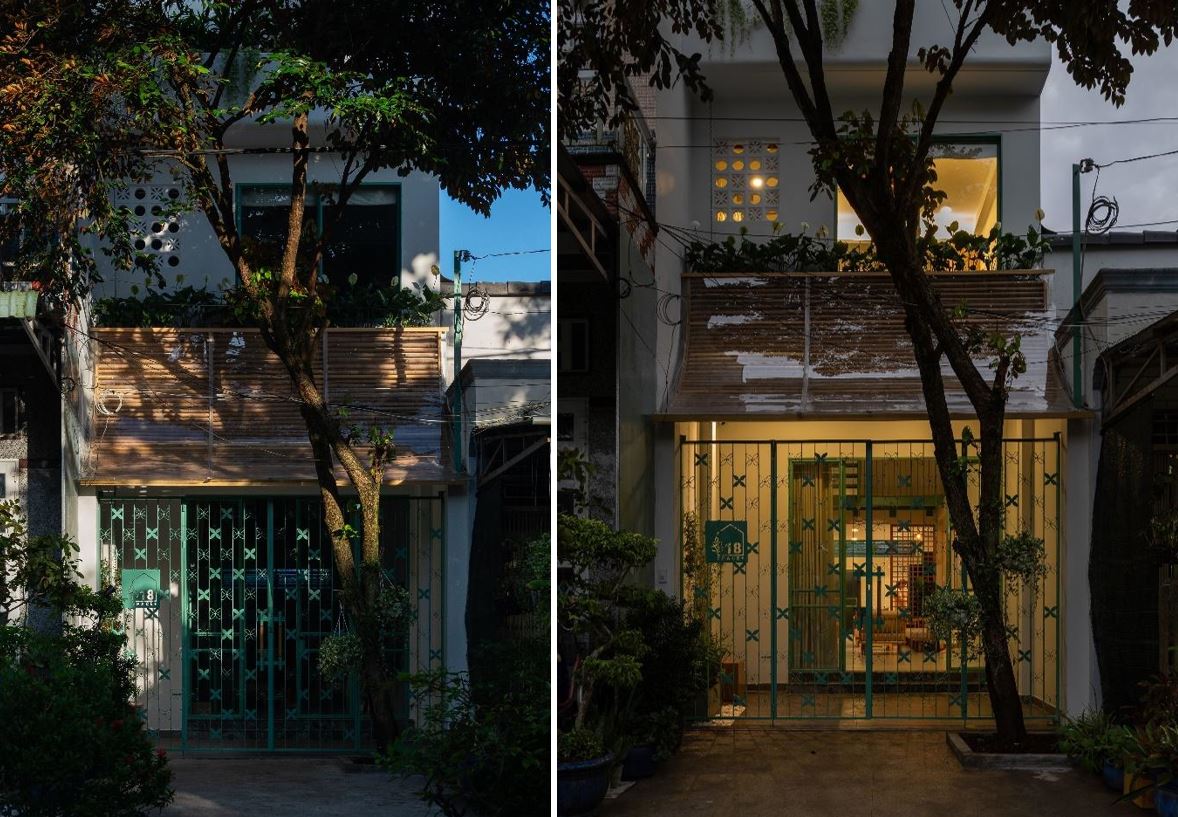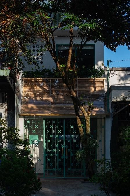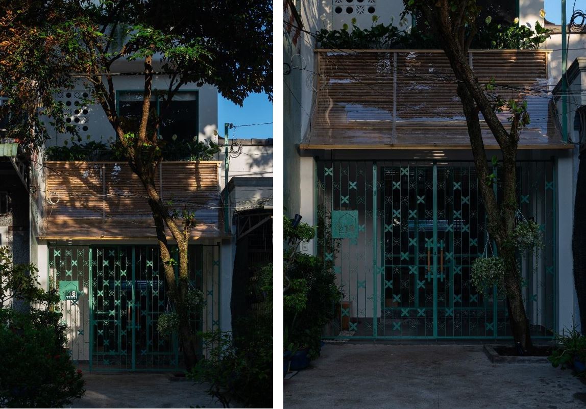Mặt chính ngôi nhà ở hướng Đông Nam, chịu ảnh hưởng bởi những tia nắng xiên buổi sáng có thể gây nóng và chói ảnh hưởng đến giấc ngủ và các sinh hoạt khác, do đó các giải pháp che chắn cũng cần được quan tâm. Ở tầng trệt, che chắn cho hàng ba là một mái hiên dạng cong, lợp tấm polycarbonate trong suốt, kết hợp với lớp lam bằng gỗ tre địa phương, lấy cảm hứng từ những tấm phên liếp truyền thống, có tác dụng khuếch tán ánh sáng, giảm độ chói, và đưa ánh sáng tự nhiên vào bên trong nhà một cách nhẹ nhàng hơn.