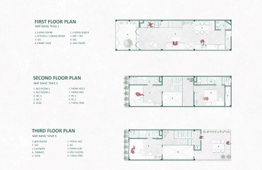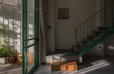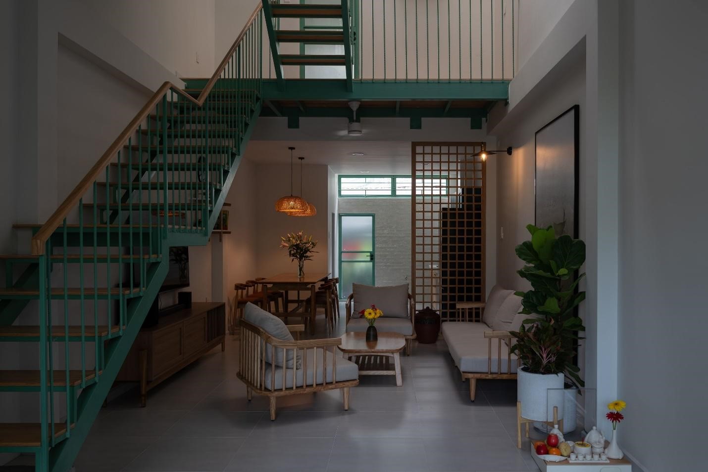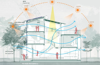 Vật liệu sử dụng trong thiết kế cũng được lựa chọn cẩn trọng, ưu tiên những vật liệu thân thiện với môi trường và có khả năng tái chế, như mái lợp tôn, cầu thang kết hợp thép và gỗ, gạch bông gió địa phương…. Những giải pháp này không chỉ đảm bảo tính bền vững mà còn mang lại hiệu quả cao về công năng và thẩm mỹ, đồng thời tối ưu hóa chi phí xây dựng.