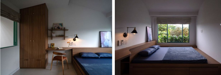Phòng ngủ chính cho ba mẹ được đặt ở phía sau nhà, tạo không gian nghỉ ngơi yên tĩnh, bên cạnh có góc thờ nhỏ thuận tiện cho việc đi lại thờ cúng. Một khoảng thông tầng bên cạnh phòng ngủ có chức năng một khoảng đệm hạn chế nắng Tây, giúp đối lưu không khí, đồng thời tạo sự riêng tư.