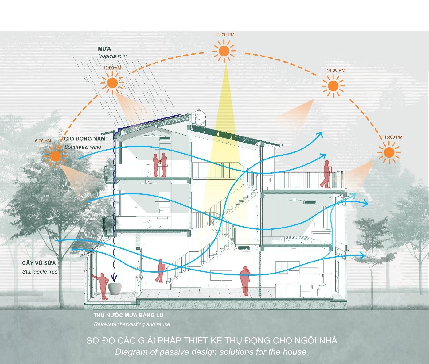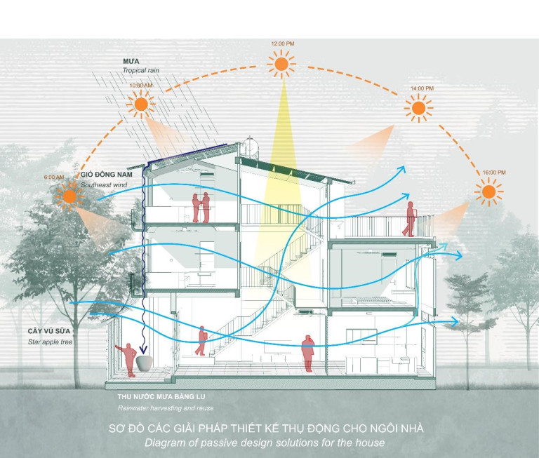 Ngôi nhà được thiết kế và xây dựng với sự chú trọng vào tính bền vững. Mái nhà với hai mái dốc ghép so le để thông gió, cách nhiệt cho hệ mái tôn, mái dốc cũng giúp thoát nước mưa nhanh chóng và hạn chế thấm dột, thích ứng với các cơn mưa lớn miền nhiệt đới. Các vật liệu thân thiện như mái lợp tôn có lớp cách nhiệt, cầu thang thép bậc gỗ, gạch bông gió địa phương, lam tre,…. không những tiết kiệm chi phí mà còn làm giảm tác động đến môi trường sống. Bên cạnh đó, các giải pháp thông gió và chiếu sáng tự nhiên cũng được thiết kế khéo léo, tạo cảm giác thoáng mát dễ chịu.