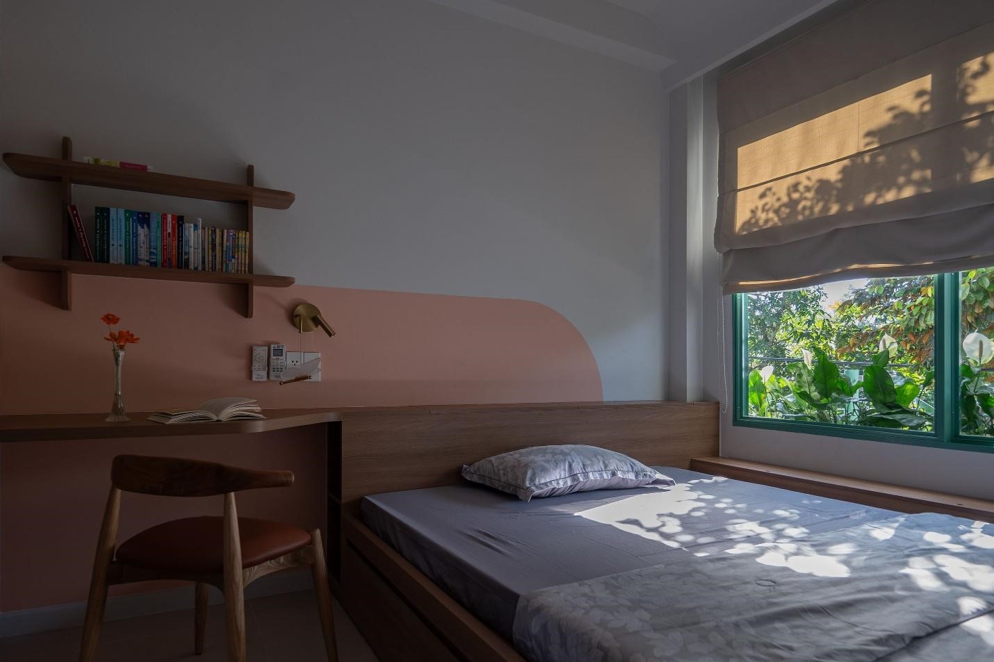 Ở tầng hai phía trước nhà, nhóm thiết kế đã tận dụng bóng mát của cây vú sữa sẵn có để lọc nắng và đưa ánh sáng vào nhà một cách tự nhiên, tạo nên những bóng đổ lá cây thú vị vào không gian bên trong nhà.