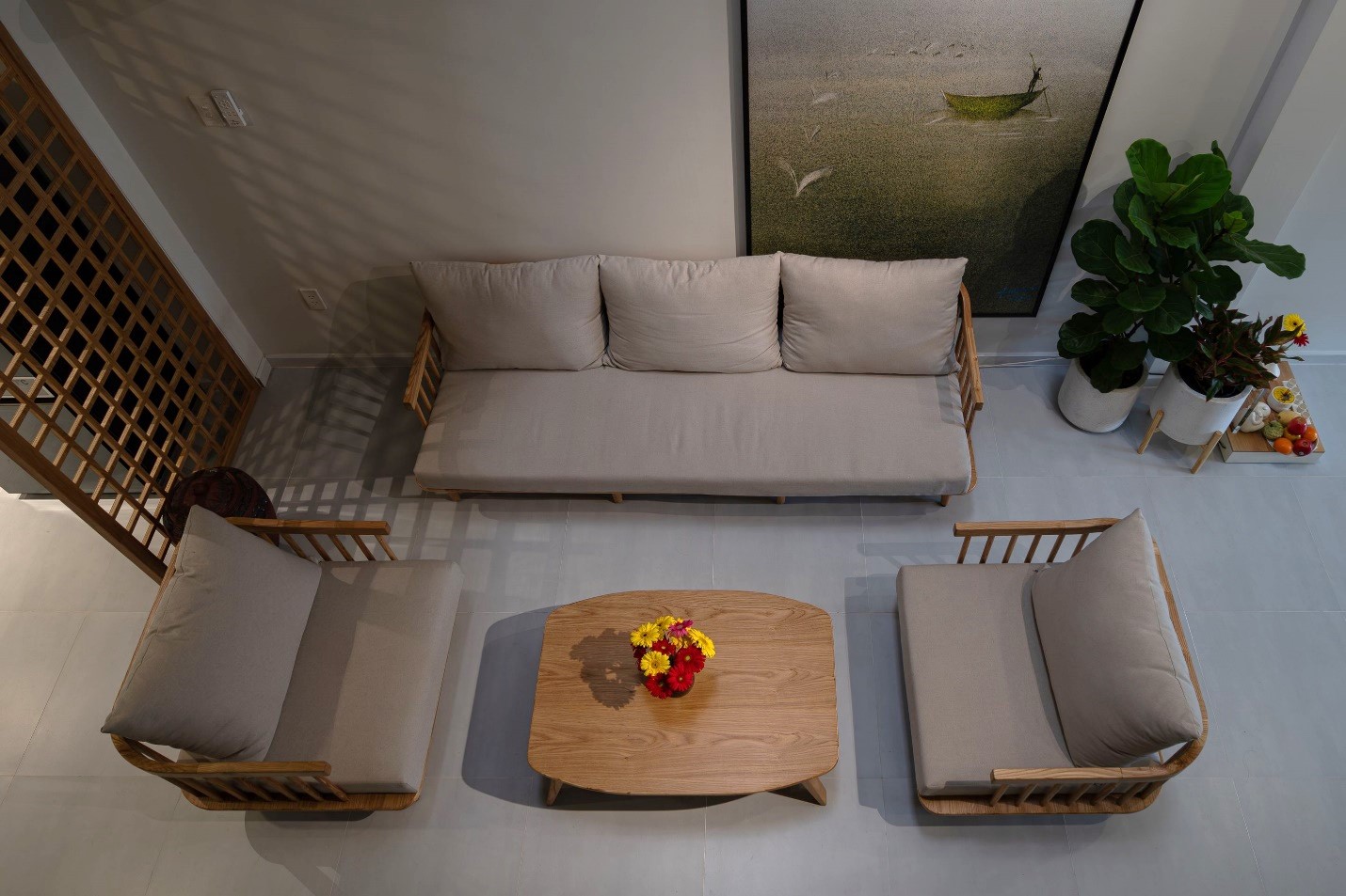 Không gian phòng khách đặt ngay trung tâm và phía dưới giếng trời nhằm giúp tăng sự tương tác của các giác quan theo chiều ngang và chiều đứng. Nơi đây khi những người con từ phương xa quay về có thể quây quần, nhìn thấy và trò chuyện với nhau từ mọi hướng cho dù đang ở dưới trệt hay trên các tầng lầu đều có thể cảm nhận được không khí ấm cúng của gia đình.
