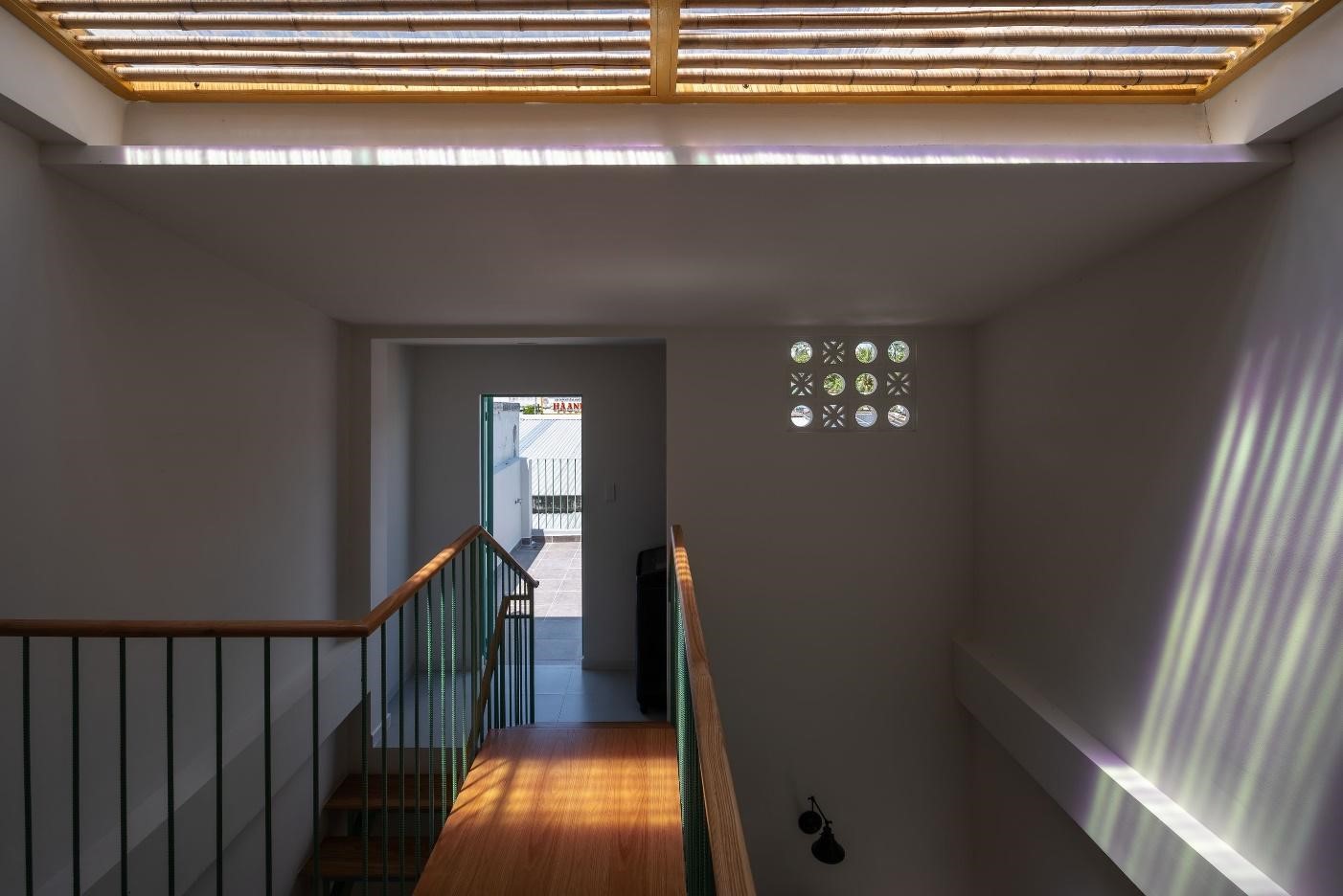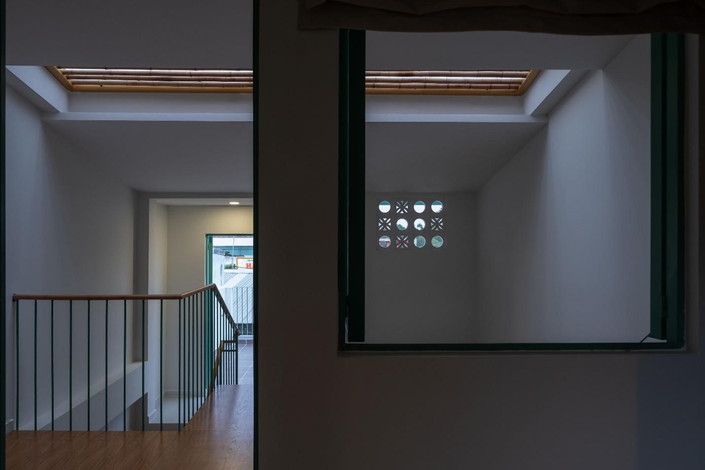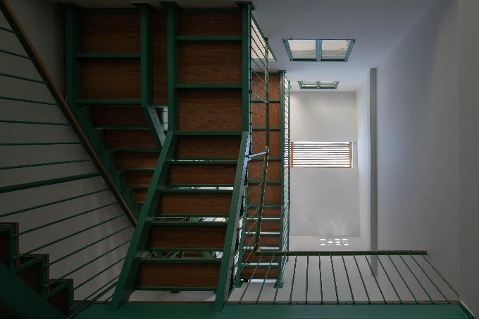 Một trong những nét đặc biệt của ngôi nhà là một khoảng thông tầng lớn với giếng trời “skylight” lấy sáng phía trên khu vực phòng khách. Toàn bộ trung tâm ngôi nhà sẽ được lấy được ánh sáng tự nhiên, giếng trời này cũng như một chiếc đồng hồ của tự nhiên ghi dấu dòng thời gian trôi qua trong ngày bằng những ánh nắng liên tục biến đổi trải dài lên những bức tường bên trong nhà. Phía dưới giếng trời cũng được lắp thêm lam tre để cân bằng ánh sáng tự nhiên và giảm bức xạ mặt trời.