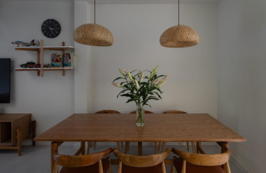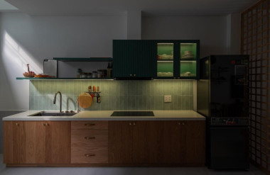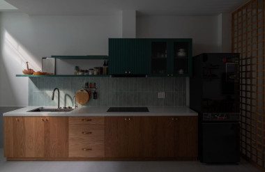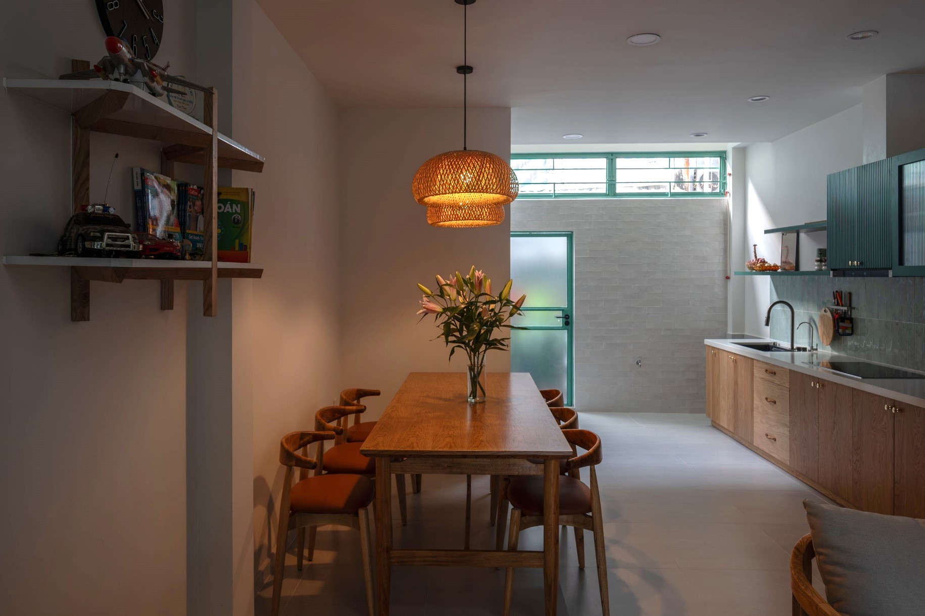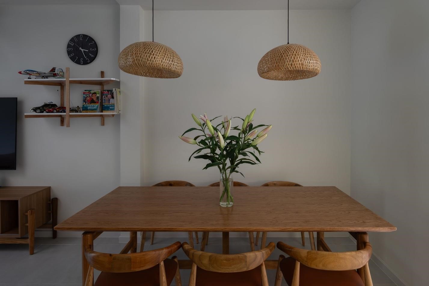 Khu vực bếp và bàn ăn được bố trí tích hợp, tối giản, ấm cúng, thuận tiện cho việc nấu nướng và ăn uống trong cùng một không gian.