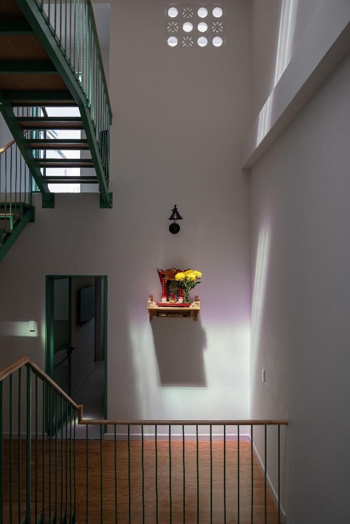 Góc thờ bố trí hướng về phía trước nhà phù hợp với phong thủy Á Đông và cũng là một nơi tĩnh lặng, cho những lúc thư giãn hay thiền định, gần bên phòng ngủ ba mẹ thuận tiện cho việc thờ cúng.
