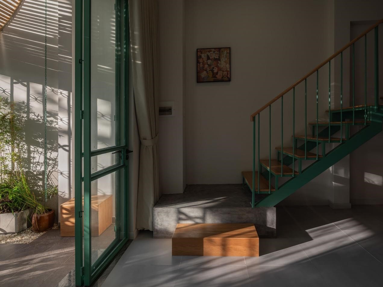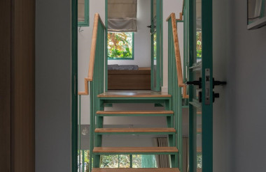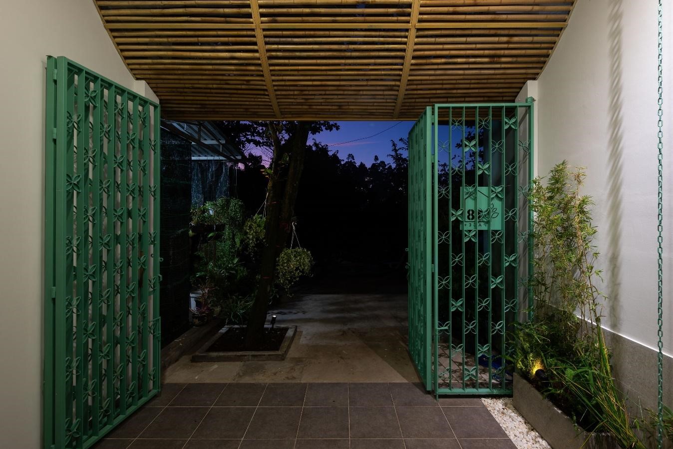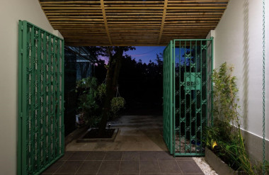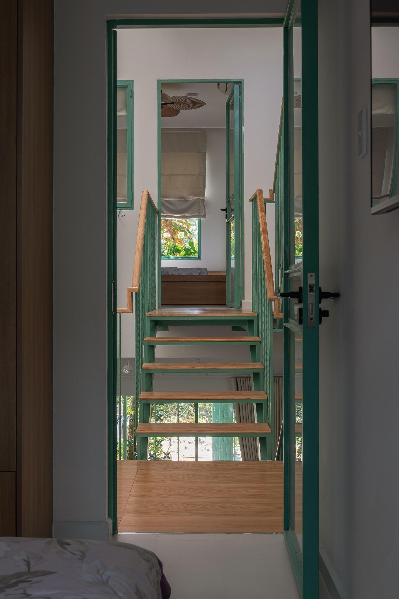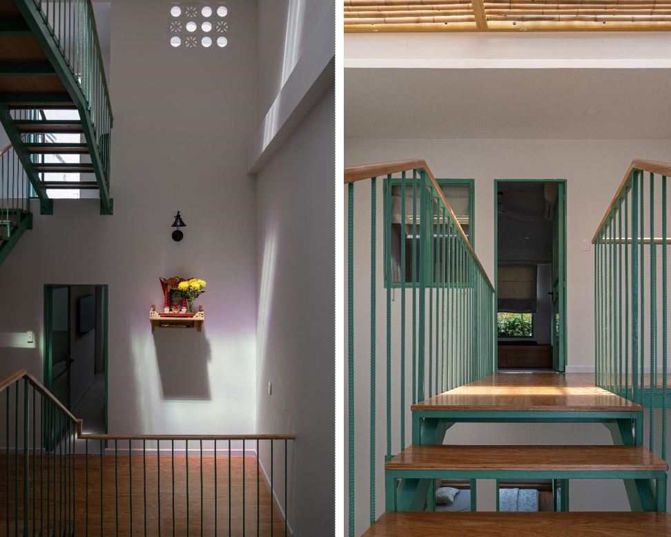 Hai không gian trước và sau nhà kết nối với nhau bằng một chiếc cầu treo thép sơn xanh gợi nhớ đến hình ảnh những chiếc cầu tre truyền thống của miền Tây Nam Bộ, mang đến cảm giác nhẹ nhàng khi di chuyển qua lại cũng như không cản trở sự đối lưu không khí và ánh sáng tự nhiên từ giếng trời.