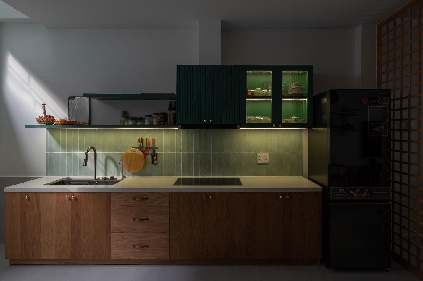 Điểm nhấn nổi bật là không gian phòng khách và bếp ăn, được đặt ở trung tâm ngôi nhà bên dưới giếng trời và khoảng thông tầng rộng mở. Như một trái tim của không gian sống, đây là nơi gia đình sum họp, cùng nhau nấu nướng, ăn uống và chia sẻ những câu chuyện thường ngày. Không gian thông tầng và giếng trời không chỉ mang lại ánh sáng tự nhiên mà còn giúp đối lưu không khí trong nhà, mang đến cảm giác thoáng đãng và dễ chịu ngay cả trong những ngày hè oi bức.
