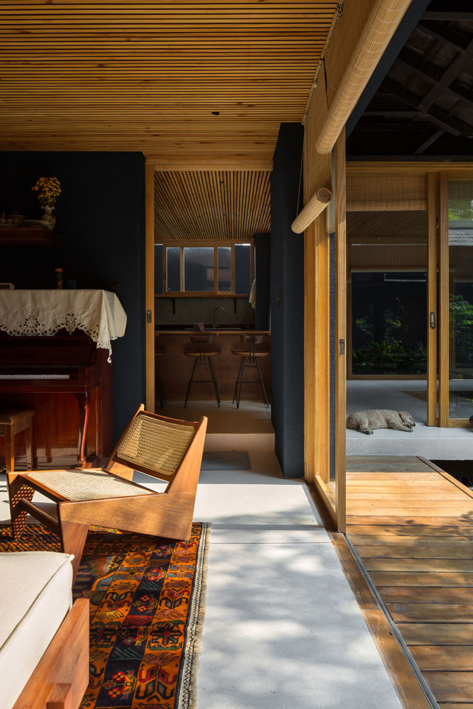 Các không gian chức năng ở tầng trệt ngôi nhà được nâng cốt cao hơn khu vườn rộng. Bằng cách đó, ngôi nhà không chỉ tăng khả năng chống chịu với lũ quét mà còn tạo thêm một không gian sử dụng mới. Ví dụ, trong phòng ăn, phần sàn vừa là sàn nhưng cũng vừa là băng ghế lớn đặt ngoài vườn, nơi mọi người làm việc theo nhóm, đồng thời cũng là băng ghế lớn nơi hàng xóm có thể ngồi trò chuyện.