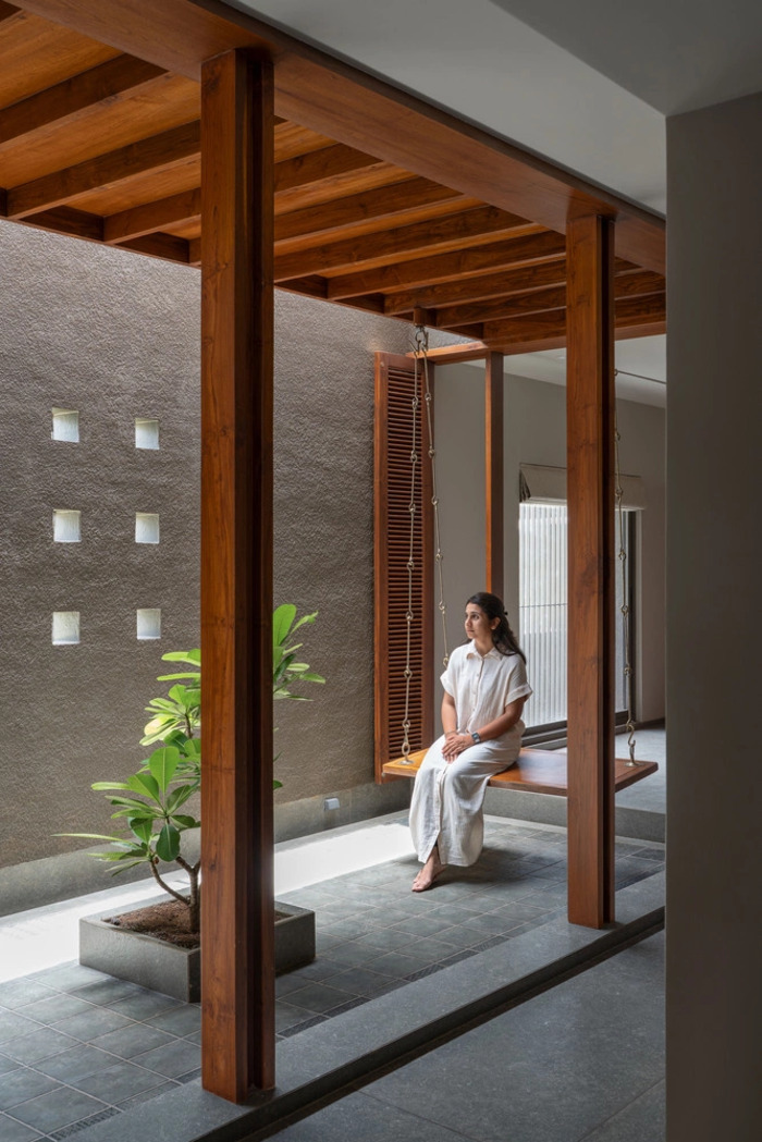 Điểm nổi bật của căn nhà là khoảng sân dài được bố trí dọc, đóng vai trò là “trục thở”. Phần sân được liên kết chặt chẽ với các không gian sinh hoạt bên trong, thúc đẩy thông gió chéo và đưa ánh sáng tự nhiên vào sâu trong nhà.