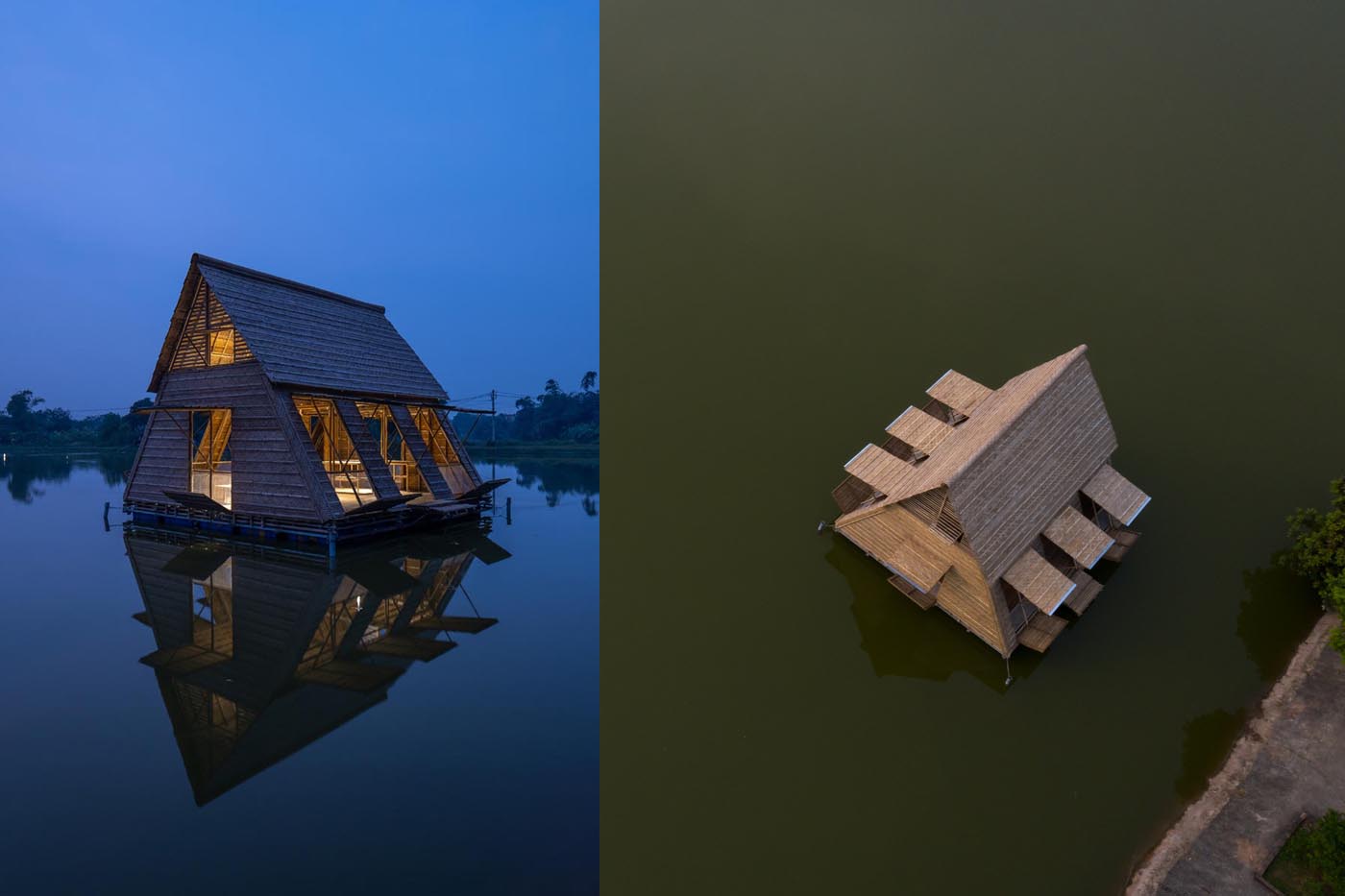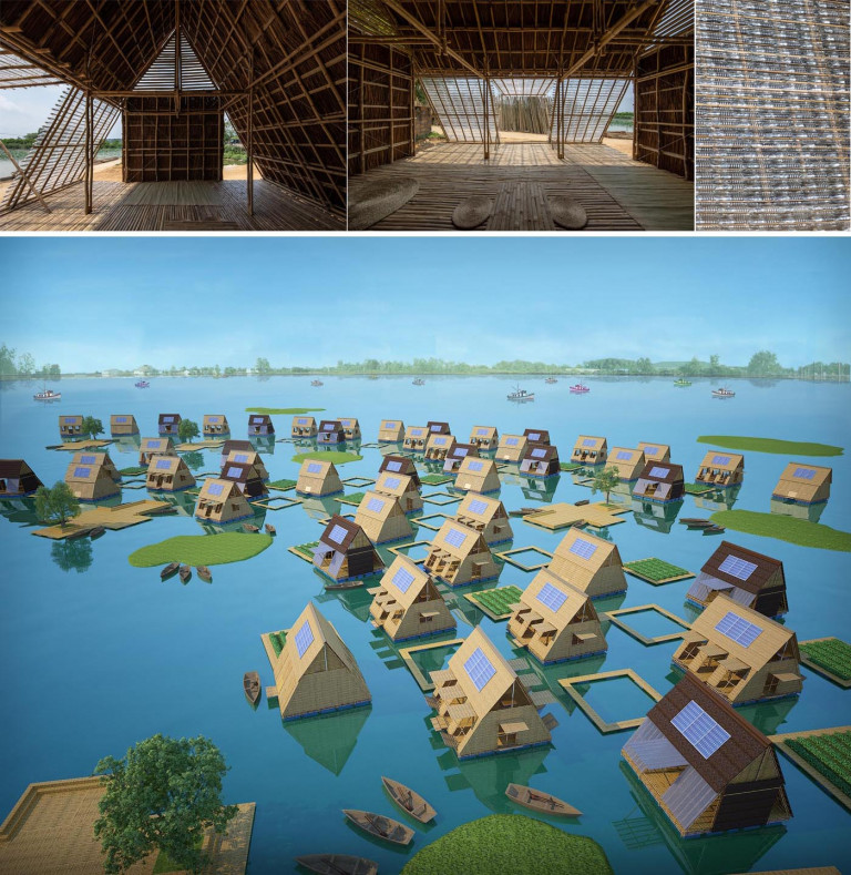 Nhà tre nổi trên mặt nước nhờ hệ thống thùng phuy nhựa buộc vào dưới sàn, ở giữa là các thùng dự trữ nước ngọt và thùng làm bể tự hoại. Ngôi nhà có mặt bằng hình vuông (6m x 6m), có hai tầng sử dụng và có thể nối dài thêm để tăng diện tích sử dụng. Khi gỡ bỏ các tấm sàn tầng hai thì ngôi nhà sẽ trở thành một không gian thông thoáng (làm nhà cộng đồng, lớp học, thư viện,..) gợi nhắc đến mái nhà Rông, mái Đình – Một nơi chốn đặc trưng của người Việt đã có từ lâu đời. Trong tương lai sẽ hình thành những quần cư nổi yên bình khi nhiều ngôi nhà được kết nối với nhau qua những sân chơi nổi, bè trồng rau, nuôi cá,..