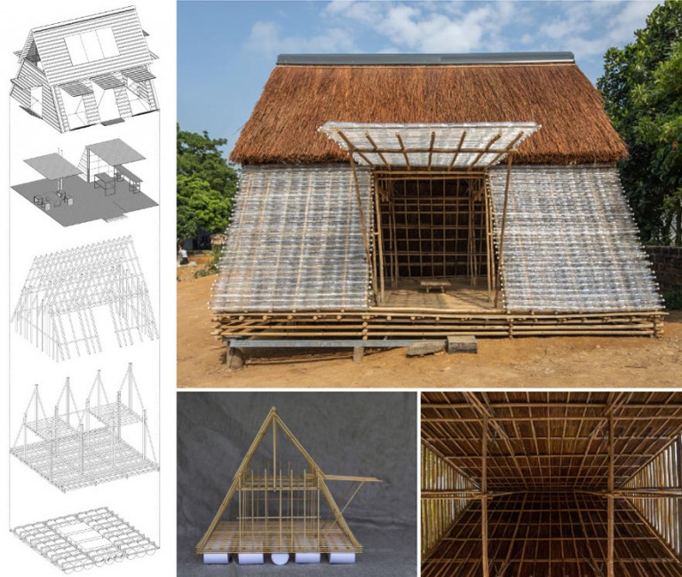 - Vật liệu chủ đạo: Tre, cót ép, lá guột, chai nhựa tái sử dụng