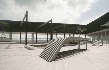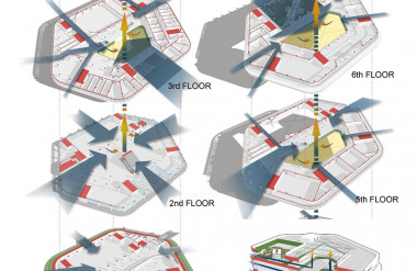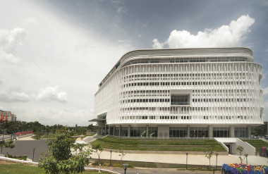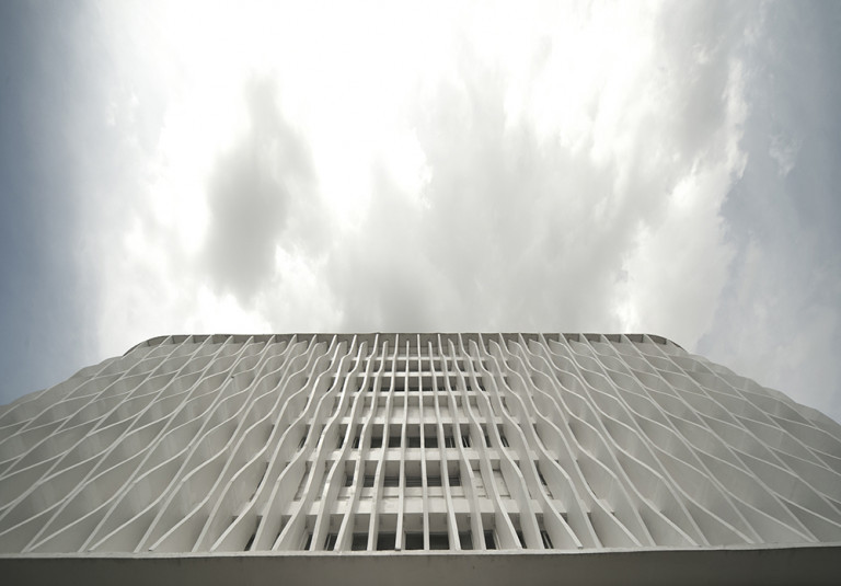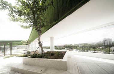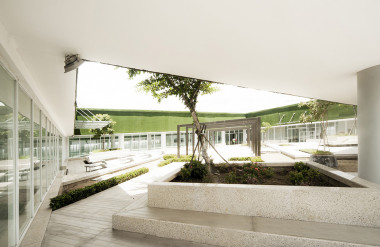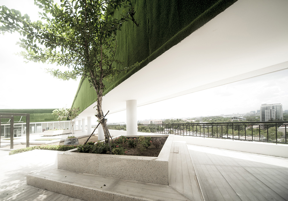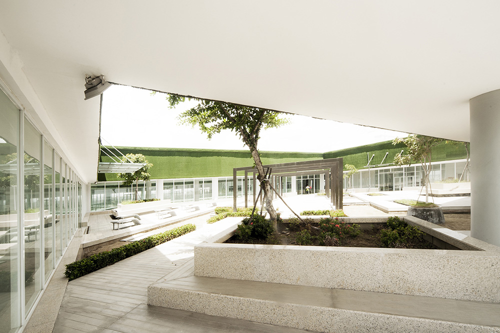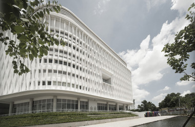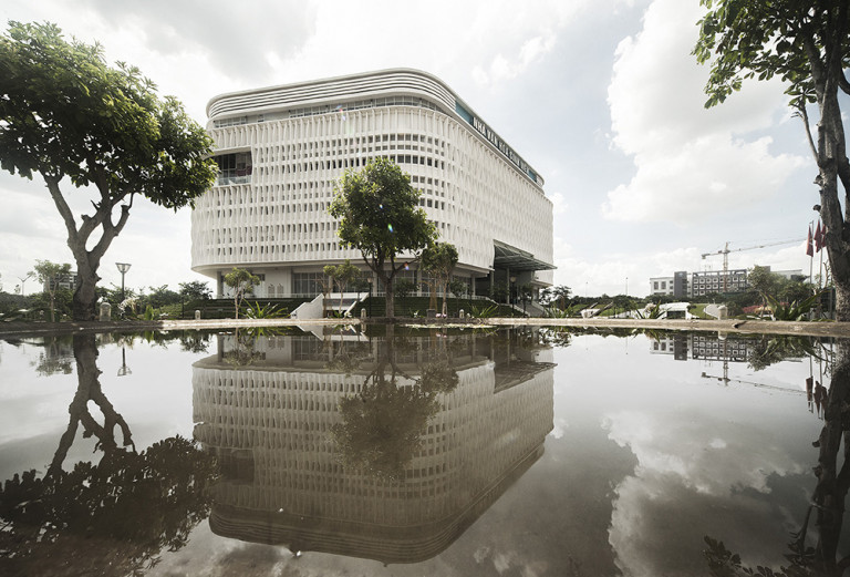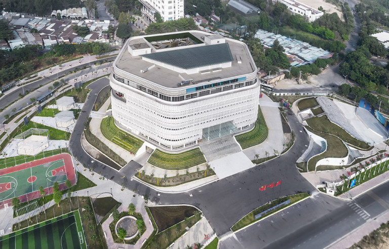 Thiết kế công trình hướng đến sự phát triển bền vững, hòa hợp với thiên nhiên. Những thanh lam bao quanh vừa là chi tiết tạo hình khối liên tục, vừa là hệ thống chắn nắng, cách nhiệt hiệu quả cho các không gian chức năng bên trong. Những thanh lam uốn lượn trên trên mặt đứng dường như giúp công trình trở nên mềm mại hơn. Hệ lam nhôm phía sau tạo khoảng trống để đối lưu không khí bên trong và ngoài công trình.