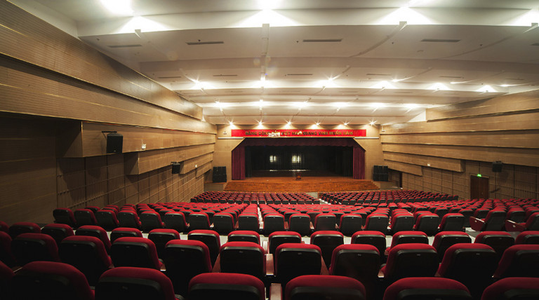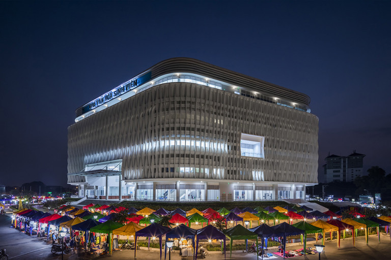 Nhà văn hoá sinh viên TP HCM – “Nhà Trắng của sinh viên” gây ấn tượng bởi thiết kế hình lục giác với 3.000 thanh lam bê tông nhẹ màu trắng bao quanh và giếng trời ở chính giữa toà nhà giúp công trình thông gió tốt, tận dụng ánh sáng tự nhiên mà không bị chói mắt.