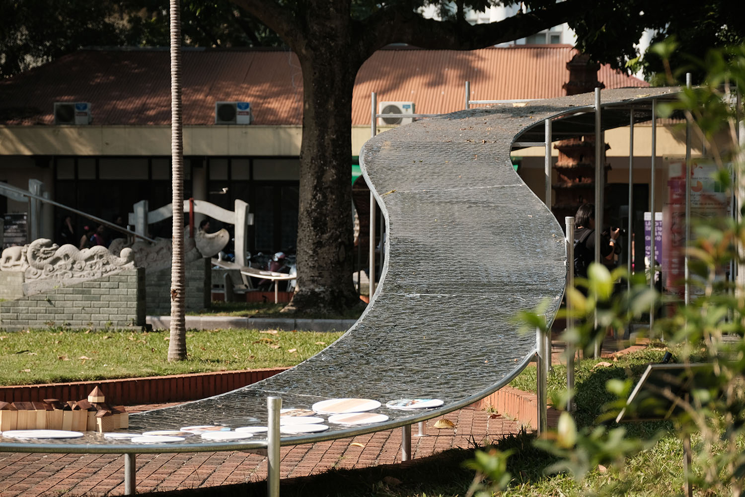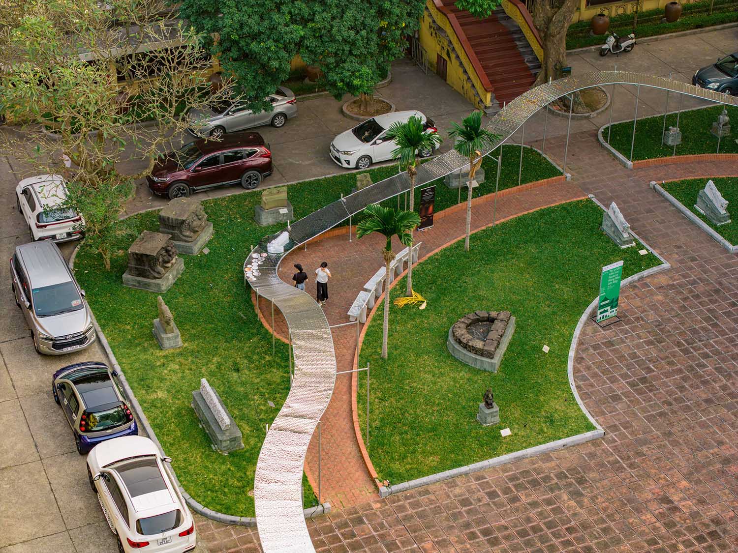 Bên cạnh đó, hầu hết các vật liệu xây pavilion được tái sử dụng các tấm inox gương từ Pavilion tên là “Bến chờ” ở Lễ hội Thiết kế Sáng tạo Hà Nội năm 2023 tại Nhà máy xe lửa Gia Lâm. Việc tái sử dụng các vật liệu cũng nằm trong ý tưởng của các KTS là chuyển tải xu hướng sáng tạo tái tạo trong tương lai.