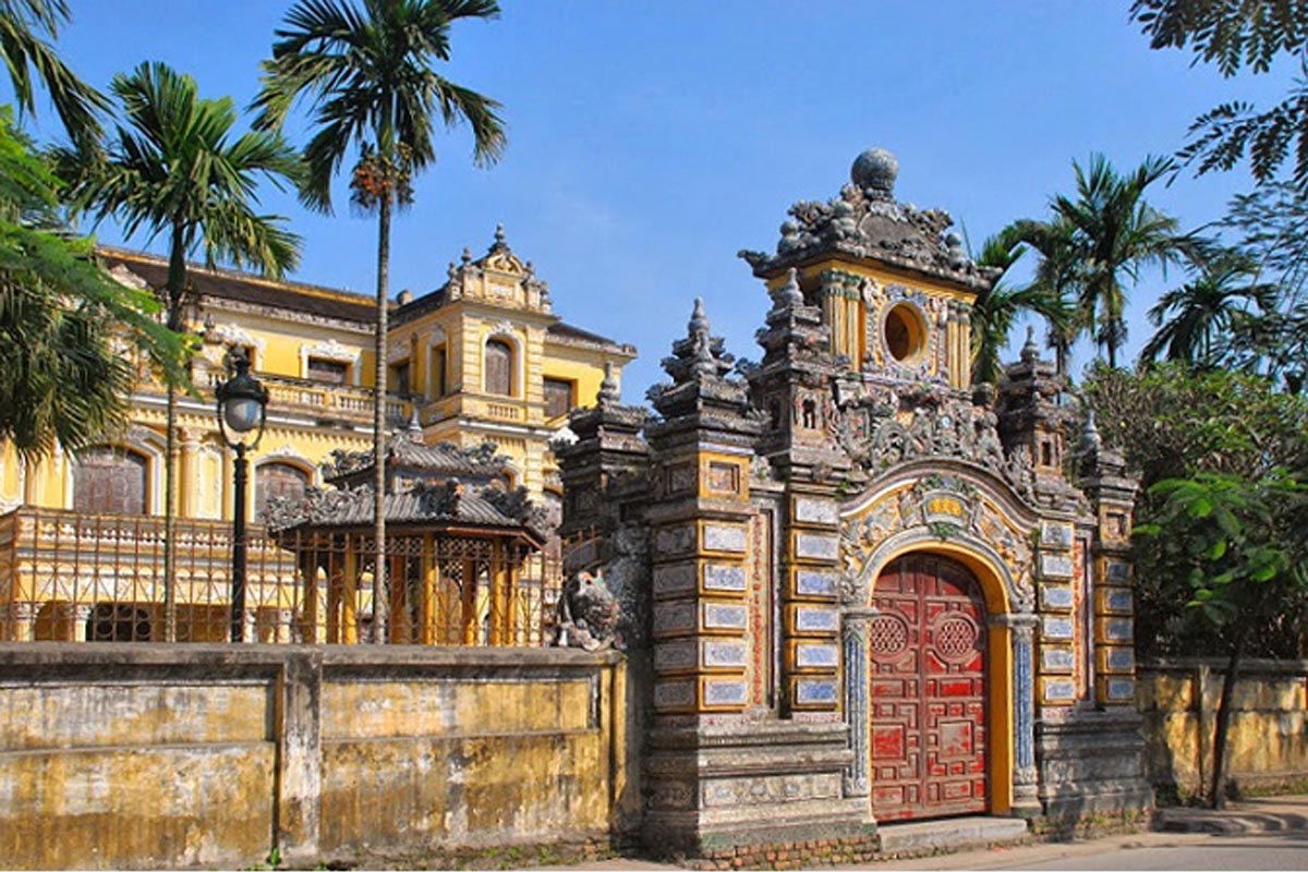 Cung An Định – Địa điểm: Số 97 Phan Đình Phùng, TP Huế; Xây dựng năm 1918 – giữa thập niên 1920. Tuy hung công trước ngày thành lập Sở Kiến trúc Q uy hoạch Đông Dương nhưng cung An Định đã hội tụ đầy đủ phẩm chất nghệ thuật Đông Dương. Cung điện này nguyên là phủ Phụng Hóa của hoàng tử Bửu Đảo. Năm 1916, hoàng tử lên ngôi vua – Khải Định, hai năm sau ngài cho cải tạo phủ thành cung An Định. Từ năm 1922, An Định trở thành cung riêng của Hoàng thái tử Vĩnh Thụy (vua Bảo Đại sau này). Sau ngày Bảo Đại thoái vị, Thái hậu Từ Cung chuyển về sống ở đây. Cung An Định trông hướng tí ngọ, nằm trên ruộng đất rất đẹp bên sông Hương, rộng rãi bằng phẳng và rộng tới 23.463m². Quần thể cung điện được bao bọc bởi la thàn là hệ thống tường xây gạch vồ dày 0,5m, cao 1,8m, trồng rào sắt bảo vệ bên trên. Quần thể gồm 10 hạng mục kiến trúc, bố cục phân tán nhưng bám lấy trục đạo Bắc – Nam cho hợp hướng Tý Ngọ. Mỗi công trình không kết thông với công trình bên cạnh mà độc lập khép kín như nhà cửa bên châu Âu. Trong khuôn viên rộng lớn của cung An Định có nhiều khoảnh vườn cảnh châu Âu, nhiều bức tượng xi măng đề tài nước ngoài do nghệ nhân Việt Nam tạo tác… Trong bài dẫn về cung An Định (Ngự chế An Định Cung dẫn), do Khải Định soạn tháng 8/1920, đắp nổi thành chữ trên bình phong trước hành lang tầng 3 lầu Khải Tường, có đoạn: “Trẫm trước khi lên ngôi, ở lâu đài tại điện riêng. Năm Nhâm Dần (1902), theo lệ ra phủ, chính nơi này, mùa hè năm Bính Tý (1916) làm lễ Tân Quang. Mùa thu năm Đinh Tỵ (1917) lấy bổng lộc Vua, nhân nền móng ấy, thuê thợ đổi dựng lại. Mùa đông năm Mậu Ngọ, cuối 1918 đầu 1919, thì xong”. “Nghĩ rằng đấy là nơi phát điềm lành nên cho đặt tên lầu Khải Tường. Sai mua đồ dựng để trang hoàng bày biện, nhất thiết không đụng đến kho nhà nước, bởi vì đây không phải là việc chung. Ban nó cho Hoàng tử trưởng Vĩnh Thuỵ làm của riêng để tỏ lòng yêu thương đặc biệt”. Kể từ bờ Nam sông Hương, đến cổng sau cung An Định có những hạng mục thành phần: Bến Thuyền, Chính môn; đình Trung Lập, lầu Khải Tường; đài Cửu Tư, chuồng thú, nhà sách, hồ nước, vườn cung. Ngoài ra còn có Hân Vinh từ, còn gọi là Nội từ đường ở bên trái và phủ Quốc Công và Ngoại từ đường của Thái Hậu Từ Cung, kiêm nơi thờ phụng tổ tiên, nằm bên phải lầu Khải Tường. Hai công trình này đều xây gạch tường rào, cổng riêng. Đến nay, cung An Định còn 6 hạng mục khá nguyên vẹn: Bến thuyền, Chính môn, đình Trung Lập, lầu Khải Tường, Nội từ đường, Ngoại từ đường và số ít công trình phụ xây dựng sau này: 1) Chính môn là tam quan hai tầng, trang trí ghép mảnh sành sứ cầu kỳ và đẹp; 2) Đình Trung Lập kiểu lầu bát giác, nền cao. Trong đình đặt tượng vua Khải Định to bằng người thật (làm năm 1920); 3) Lầu Khải Tường là công trình chính của cung An Định, chiếm một diện tích đất 745m² đằng sau đình Trung Lập. Tên chữ “Khải tường” (vua Khải Định đặt) có nghĩa là nơi khởi phát điềm lành. Lầu Khải Tường 3 tầng, kiểu lâu đài bên châu Âu. Trang trí rất cầu kỳ, nhất là nội thất tầng 1 với nhiều tranh đẹp treo tường. Tất cả cho thấy rõ sự kết hợp hiệu quả giữa kỹ thuật bê tông cốt thép với bản lĩnh thổ mộc của người Việt. Kiểu dáng mới mẻ, lại sở hữu kết cấu, dàn mái bền vững, không kém trữ tình; 4) Cửu Tư Đài, xưa là nhà hát rất đẹp nhưng đã sụp đổ, hiện chân móng nằm sâu chừng 0,7m dưới lòng đất.