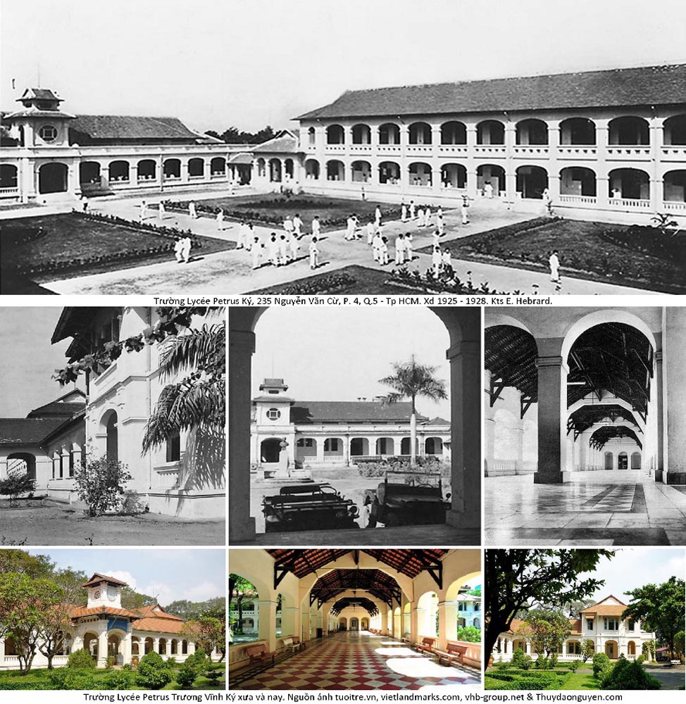 Trường Petrus Ký – Địa điểm: 235 Nguyễn Văn Cừ, Q.5 – TP HCM. Xây dựng năm 1925 – 1928. KTS Ernes Hebrard. Có lẽ đây là công trình phong cách Đông Dương đầu tiên tại Sài Gòn. Các nguyên tắc thông thoáng và chiếu sáng tự nhiên, tổ chức nhà chính, nhà ngang được xử lý khá giống kiểu dáng Văn Miếu – Quốc Tử Giám Hà Nội; đó là các dãy nhà nhóm trung tâm được bao quanh bởi ba mặt hành lang và mặt thứ tư mở ra sân lớn. Điều này có lý vì Hebrard là người rất thông thuộc Hà Nội. Khối nhà trên mái sảnh trông giống Khuê Văn Các: Cũng mái thu hồi, tường góc xây đậm rõ ra trụ nanh, mặt đồng hồ thay cho cửa tròn khuê văn. Riêng mái phía sau khối sảnh và tháp đồng hồ hơi nâng cao một chút, nhấn nhá tổ hợp trung tâm mặt tiền.