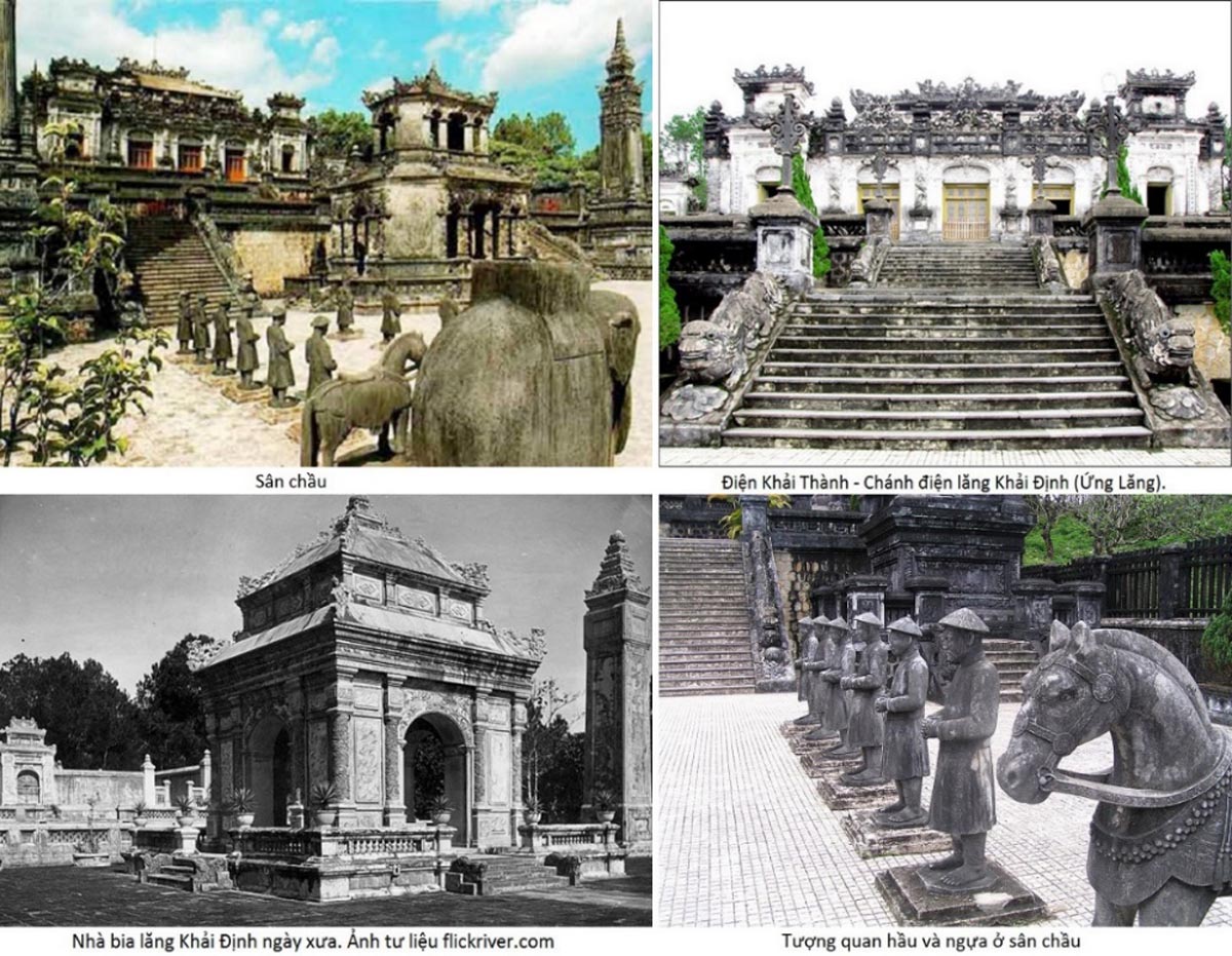 Lăng vua Khải Định (Ứng Lăng) – xã Thủy Bằng, huyện Hương Thủy, tỉnh Thừa Thiên Huế. Xây dựng năm 1920 – 1931. Chỉ huy xây dựng: Tiền quân đô thống phủ Lê Văn Bá. Chủ trì: Nguyễn Văn Khả; Trang trí: Họa sĩ Phan Văn Tánh (phụ trách), Ký Duyệt, Cửu Sừng, Tôn Thất Sa, Huỳnh Văn Đại. Paul Ducuing thiết kế kiến trúc và thể hiện hai pho tượng Khải Định. Lăng tọa lạc trên miền núi Châu Chữ (Châu Ê). Vua Khải Định sinh năm 1885, lên ngôi năm 1916, trị vì được 9 năm thì mất năm 1925, thọ 40 tuổi. Ngay hồi còn tại vị, nhà vua đã tham khảo ý kiến các thầy địa lý cao tay ấn và quyết định xây dựng sinh phần của mình trên triền núi Châu Chữ. Nơi ấy tuy hiếm hoi mặt nước, nhưng tất cả núi đồi, khe suối của cả một vùng cẩm tú trác tuyệt quanh lăng cho thấy đích thị trúng cát huyệt, đủ cả tiền án, hậu chẩm, hổ phục, rồng chầu, minh đường, thủy tụ. Người được giao trọng trách đôn đốc thi công là Tiền quân Đô thống phủ Lê Văn Bá. Có thể xem toàn bộ vùng rừng núi Châu Chữ bao bọc bốn bề chính là vườn lăng và sự chiếm lĩnh trời đất liền mạch của lăng khiến cho nó trở nên hùng vĩ, tráng lệ giữa đại ngàn. Lăng Khải Định bố cục hoàn toàn đối xứng, cái bề thế gia tăng liên tục theo đường hướng thượng vượt lên 127 bậc đá. Quan hệ triều tẩm phân minh nhờ 5 tầng sân đóng khung cho mỗi nhóm kiến trúc đậm đặc, lớp lang theo trục thần đạo “thâu ngắn” (vì dốc ngược). Có thể xem đây là một kịch bản đặc biệt: Lăng không phải là tập hợp những gian điện với đường và vu mà gồm nhiều tòa nhà trông như những lâu đài bên châu Âu, lại thêm nhiều stoupa lai tạp Ấn – Miến – Thái… So với lăng của các vua trước thì lăng Khải Định có diện tích nhỏ hơn rất nhiều (117m x 48,5m), tức là chỉ vẻn vẹn 5.670m², nhưng xây dựng xa xỉ. Do công trình nằm trên núi cao rừng hiểm đòi hỏi ức vạn công của. Vua Khải Định đã xin phép nhà cầm quyền Pháp cho tăng 30% thuế điền cả nước để thêm tiền xây lăng. Các chất liệu quý đầu nhập từ nước ngoài: Vua Khải Định cử người sang Pháp mua sắt thép, xi măng, ngói ardoise. Lại cho thuyền bè sang Trung Hoa, Nhật Bản cất hàng gạch cảo, đồ sứ thượng hạng, thủy tinh màu… Tuy nhiên, các chất liệu ngoại nhập đều phải qua tay các nghệ nhân Huế, kể cả được chế tác lại để kiến tạo, trang trí mỹ thuật theo cách rất độc đáo. Thoạt nhìn thì thấy quần thể lăng Khải Định dường như bị phân lập với tự nhiên, nhìn xa các hạng mục hầu như không bị cây cối che khuất. Về sau nhìn lại mới thấy ý hay: Các nhóm kiến trúc lớp lang đâu ra đấy, dồn dập trên cao, lần lượt từ bốn hàng tượng, trụ biểu, bi đình… Khải Thành điện ở trên nữa, rồi kết thúc bằng Thiên Định Cung. Chế ngự tầng cao nhất là Thiên Định cung 5 gian, đằng trước Thiên Định cung là điện Khải Thành, nơi có án thờ và chân dung vua Khải Định. Gian giữa là bửu tán, pho tượng nhà vua và một phần ở phía dưới (trong lòng đất, nơi táng thi hài nhà vua). Hai bên bố trí hai phòng trực của lính hộ lăng. Gian sau cùng là điện thờ. Toàn bộ nội thất của ba gian giữa Thiên Định cung đều được phủ kín tranh ghép sành sứ và thủy tinh màu thể hiện tứ quý, bát bửu, ngũ phúc. Kể cả khay trà, mũ mãng, đồng hồ tây, vợt tennis cũng được bày ở đây. Những chất liệu khô cứng, rời rạc qua bàn tay tài nghệ của các xảo thủ đã trở thành những bức tranh, những tác phẩm nghệ thuật lộng lẫy . Đặc biệt bửu tán tán lơ lửng trên trần Thiên định cung che tượng nhà vua trông vô cùng thanh thoát mềm mại, khiến người chiêm ngưỡng cứ ngỡ nó được bọc từ gấm lụa, đang khẽ lung linh trước làn gió thoảng mà quên đi rằng đó là một khối xi măng cốt thép nặng gần 500 kg. Nhà điêu khắc Paul Ducuing danh tiếng là người thể hiện tượng vua Khải Định; “Trong lăng Khải Định hiện nay có hai pho tượng bằng đồng tạc hình nhà vua với tỉ lệ 1/1: Một pho tượng ngồi trên ngai vàng và một pho tượng đứng. Sự có mặt của tượng vua trong lăng là một điều đặc biệt so với các lăng khác. Pho tượng ngồi trên ngai được thực hiện ở Paris vào năm 1920, do hai người Pháp là P. Ducuing (tạc tượng) và F. Barbedienne (đúc tượng). Trong lòng tượng rỗng nên không nặng lắm, sau khi chuyên chở về đến Huế thì mới mạ vàng bên ngoài. Còn pho tượng đứng thì đúc ngay tại Huế do một người lính thợ, quê ở Quảng Nam, thực hiện. Làm xong ông cũng được tặng hàm bát phẩm. Tượng này nguyên đặt trong ngôi nhà bát giác xinh xắn mang tên là Trung Lập Đình ở trong sân trước của cung An Định. Di hài vua Khải Định nằm sâu dưới pho tượng ngồi, năm xưa được đưa vào huyền cung qua đường tọai đạo ngầm dài 30m (lối vào chỗ sau nhà bia). Người Huế truyền tụng, ở các lăng khác có thể nghi hoặc thi hài có hay không có tại huyền cung, chứ ở lăng K