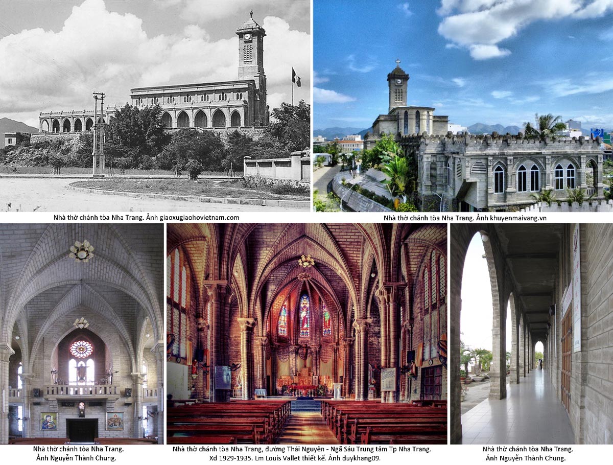 Nhà thờ chánh tòa Nha Trang – Địa điểm: Ngã Sáu, trung tâm TP Nha Trang, tỉnh Khánh Hòa; năm xây dựng 1928 – 1941; thiết kế và chỉ huy thi công: Linh mục Louis Vallet. Khi người Pháp đến Nha Trang đã cho xẻ đôi núi Hòn Một. Nửa phía Tây của núi được san phẳng bởi 500 quả mìn để có diện tích 4.500m2 xây nhà thờ. Cái tên nhà thờ Núi cũng do đó mà có. Đứng nhìn từ xa, nhiều người vẫn lầm tưởng công trình kiến trúc đồ sộ này được xây dựng bằng đá chẻ. Nhưng thực tế đá chẻ chỉ được dùng lát nền và sân, còn toàn bộ các bức tường nhà thờ xây bằng táp lô xi măng. Chính linh mục Louis Vallet cùng các cộng sự đã đúc nên các khối táp lô ấy. Riêng phần mái bằng của hành lang chạy dọc hai bên dược đổ bê tông cốt thép, còn mái vòm thánh đường làm xi măng lưới thép. Đặc biệt ở chỗ đan cốt tre cật với lưới thép mắt cáo. Kiểu dáng nhà thờ đậm phong thái gothic với mặt đứng phân vị thành ba tầng bậc (khớp với mặt bằng ba dãy dọc của nhà thờ này). Dưới cùng là các cửa ra vào, giữa là ô cửa sổ hoa hồng, trên cùng là hai dãy hành lang và tháp chuông nhô cao. Ba quả chuông đồng treo trên tháp chuông do hãng đúc Bourdon Carillond danh tiếng của Pháp thực hiện. Trong đó có một quả đúc năm 1934, hai quả đúc năm 1939. Trên tháp chuông có gắn một chiếc đồng hồ lớn, 4 mặt quay ra bốn hướng. Thánh đường rộng mênh mông.