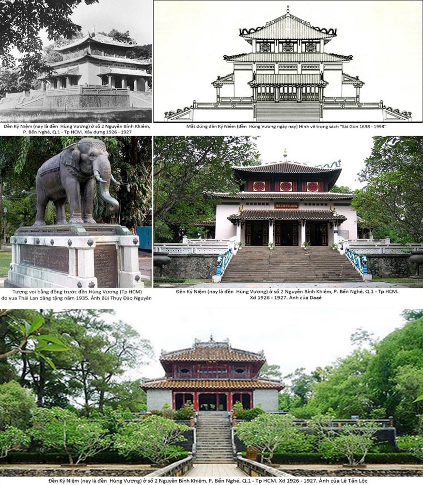 Đền Kỷ niệm (nay là Đền Hùng Vương) – Địa điểm: Số 2 Nguyễn Bỉnh Khiêm, P. Bến Nghé, Q.1 – TP HCM. Xây dựng năm 1926 – 1927. Đền Kỷ Niệm do người Pháp xây dựng tại Sài Gòn để tưởng niệm những người Việt đi lính cho họ, bị tử trận bên châu Âu trong chiến tranh Thế giới I. Từ 1956, chính quyền Sài Gòn cải thành đền Quốc Tổ Hùng Vương. Đền tọa lạc trên khu đất rộng 730m2 của Thảo Cầm Viên, trông hướng Tây Bắc. Kiểu dáng đền Hùng Vương mô phỏng Thế miếu của cố đô Huế. Ba lối vào từ đằng trước và hai bên đều rộng 11m. Riêng hai bên bố trí hai vườn hoa xinh xắn cỡ 5,4m x 2,8m. Mỗi lối vào có các tầng bậc vượt ba cấp dẫn lên. Cấp nền thứ nhất cạnh dài 26,66m, cao 2,15m gồm 14 bậc thềm, hai bên có đôi rồng chân bốn móng kiểu thời Nguyễn. Cấp nền thứ hai cạnh dài 19,44m, cao 0,7m gồm 6 bậc. Cấp nền thứ ba cạnh dài 13,68m, cao 0,42m gồm 3 bậc. Bên các lối đi xây tường bao cao 1m, dày 0,3m trang trí gạch ô vuông, ô tròn giả như la thành cho thành tăng vẻ uy nghi. Toàn bộ khối đế ba tầng bậc của đền chính cao 3,27m (tượng trưng thiên, địa, nhân)?! Lại được thu nhỏ dần khi lên cao, tạo thế hướng thượng cho ngôi đền. Bên trên phần đế nhà đổ mặt bê tông làm sàn. Đền chính mặt bằng vuông, tổng diện tích sàn hơn 220m2. Toàn bộ tòa nhà cao 9m được 12 cột gỗ sao và hệ thống vì kèo, cột gạch, tường gạch chắc chắn chống đỡ. Mái đền lợp ngói âm dương. Ngoại thất gồm hai phần kiến trúc dưới gạch trên gỗ vươn lên cao hai tầng mái chồng diêm. Từ bậc cửa lên đến tầng mái dưới (độ cao xấp xỉ 3m) có làm thêm một khung mái nhô ra với 4 cột xi măng chống đỡ tạo thành tiền sảnh ở cả ba mặt (đằng trước và hai bên). Mặt sau xây bít làm hậu cung. Phía bên trái điện chính đặt tượng voi lớn bằng đồng rất đẹp, cao 1,5m nặng chừng 3 tấn. Đây là quà quý của vua nước Xiêm Paramindr Maha Prajadhipok tặng, nhân dịp ngài đáp chuyến tàu biển tới Sài Gòn hồi 1930. Nhiều người cho rằng đây là tượng voi đồng lớn nhất nước ta với cách tạo hình sở trường của Thái Lan.