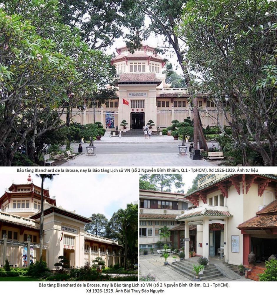 Bảo tàng Lịch sử Việt Nam (tên ban đầu Blanchard de la Brosse) – Địa điểm: 2bis Nguyễn Bỉnh Khiêm, P. Bến Nghé, Q.1 – TP HCM. Xây dựng năm 1927 – 1929. KTS Delaval. Năm 1927, nhà sưu tầm cổ vật Holbé qua đời, để lại nhiều cổ vật trị giá 45.000 đồng Đông Dương (số tiền rất lớn ngày bấy giờ). Để mua lại số cổ vật này, Hội nghiên cứu Đông Dương (Société des Etudes I Indochinoises) đã tổ chức phiên họp bất thường, quyết nghị xin 5 hội viên hảo tâm cho mượn trước số tiền trên, đồng thời xin phép chính quyền cho mở lạc quyên để lấy tiền hoàn lại các nhà hảo tâm. Hội NCĐD cam kết sẽ tặng lại nhà nước số cổ vật mua được. Tiếp đó, đề nghị chính quyền xây nhà bảo tàng, và dành cho Hội phòng làm trụ sở và thư viện chứa hơn 5.000 tài liệu về Đông Dương và các nước Viễn Đông. Ngày 28/11/1927, Thống đốc Blanchard de la Brosse ký quyết định thành lập Bảo tàng mang tên ông, đặt dưới quyền kiểm soát trực tiếp của chính quyền Nam Kỳ và sự giám sát khoa học của Viễn đông Bác cổ. Đến 20/10/1945 Bảo tàng Blanchard de la Brosse được đổi tên thành Gia Định bảo tàng viện. Từ năm 1956, được gọi là Bảo tàng Lịch sử Việt Nam. Năm 1960, bảo tàng được mở rộng thêm phía sau theo phong cách có từ trước và cùng với đền thờ Quốc tổ Hùng Vương gần đấy hợp thành quần thể văn hóa lịch sử đặc biệt. Công trình nằm trong khuôn viên Thảo Cầm Viên, trên nền đất dinh Tân Xá cũ. Ban đầu, công trình dự định làm nơi triển lãm lúa gạo, sau đổi thành nhà bảo tàng kiêm nơi nghiên cứu nhân chủng, khảo cổ và dân tộc học hướng vào văn hóa Việt Nam và một số nước trong khu vực Đông Nam Á. Bảo tàng Blanchard de la Brosse khá đồng điệu với Viễn đông Bác cổ Hà Nội ở sự dàn trải các mô típ Á đông trong bố cục châu Âu. Sảnh có dạng hình bát quái với mái nhô tám cạnh vút cong ở các góc. Mái lợp ngói âm dương, được đấu củng đỡ lấy. Khối trung tâm, kiến trúc kiểu vọng lâu, cao vượt hẳn mặt nhà, chạy ngang bên dưới với hàng ngang liên hoàn trụ, lan can. Nhà bảo tàng Lịch sử Việt Nam ở Sài Gòn trông giông giống cung điện tân cổ điển châu Âu (Nguồn tài liệu: Sài Gòn 1698 – 1998, NXB TP HCM – 1998, trang 117).