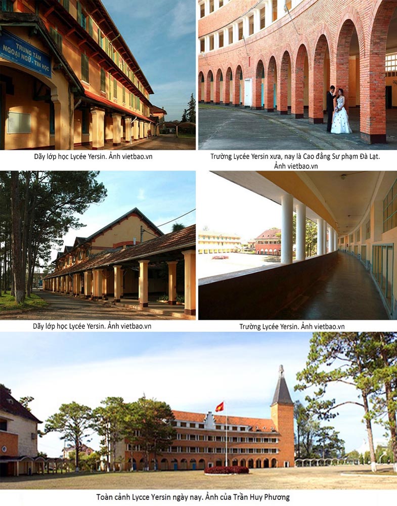 Trường Petit Lyce’e Dalat – Địa điểm: 29 Yersin, TP Đà Lạt. Xây dựng năm 1929 – 1937. KTS Moncet. Trường thành lập 1927, dành cho con em người Pháp và một số học sinh người Việt thế gia vọng tộc. Tên ban đầu của trường là Petit Lyce’e Dalat, năm 1932 đổi thành Grand Lyce’e Yersin de Dalat. Ngày xưa đất trường rộng gần 30 ha, phía Đông giáp suối ngàn, phía Tây giáp hồ Đà Lạt, phía Bắc giáp đường Sương Nguyệt Ánh và phía Nam giáp đất Sở địa dư Đông Dương. Nay đất cát chỉ còn chưa đầy một nửa, do bị dân chiếm dụng, thành thử nhà trường phải mở thêm con đường làm ranh giới riêng. Trường Petit Lyce’e Dalat xây dựng kinh qua 2 giai đoạn. Giai đoạn I (1929 – 1932) theo mẫu trường học bên Pháp; giai đoạn II (trong năm 1937) xây thêm dãy lớp học hình vòng cung rất đẹp, đầy ấn tượng, nay đã thành thương hiệu kiến trúc của nó. Gạch xây tường chuyên chở từ châu Âu sang, màu đỏ để trần không trát; mái trường lợp bằng ngói đặt cũng hàng bên Pháp. Nay lớp ngói lợp xưa đã được thay thế. Điểm nhấn của dãy nhà hình vòng cung là tháp chuông. Phía bên ngoài tháp trước đây có 1 đồng hồ lớn. Bên trên tháp chuông cũng không còn chuông, do bị tháo dỡ từ trước 1975. Cũng trong giai đoạn II xây thêm khối Hiệu trưởng, nhà văn phòng, các phòng thí nghiệm và giảng đường lớn. Hành lang nối các dãy nhà thì sau 1955 mới có. Theo nguồn tin từ Hội KTS tỉnh Lâm Đồng, trường Yersin được Hiệp hội KTS Thế giới (UIA) xếp hạng trong số 1.000 công trình đặc sắc nhất Thế kỷ 20. Có lẽ dựa trên bối cảnh Việt Nam mà nhiều ý kiến cho rằng trường này mang phong cách kiến trúc Đông Dương; còn nhìn chung trường Yersin biểu hiện sự cách tân xuất sắc nghệ thuật trung cổ và truyền thống Bắc Âu.
