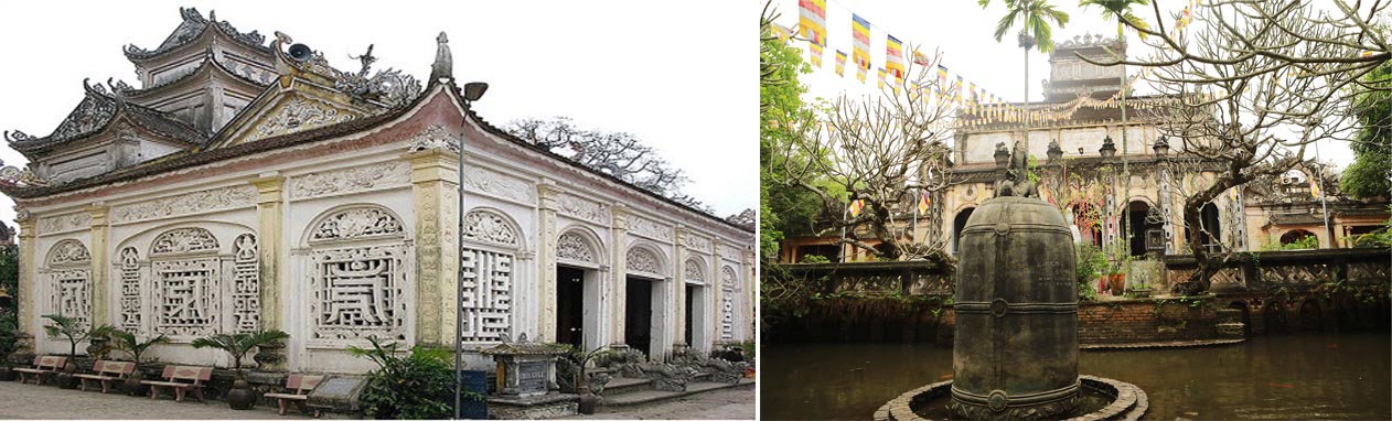 Chùa Cổ Lễ – Địa điểm: Thị trấn Cổ Lễ, huyện Trực Ninh, tỉnh Nam Định. Xây dựng mới và bổ sung 1920 – 1927. Thiết kế: Hòa thượng Phạm Quang Tuyên. Chùa Cổ Lễ tên chữ là Thần Quang tự, vốn có từ thời Lý do Nguyễn Minh Không lập ra. Minh Không chính là người chữa bệnh hóa hổ cho vua Lý Thần Tông và được phong Quốc sư. Chùa Cổ Lễ vừa thờ Phật, vừa thờ Nguyễn Minh Không. Ngoài ra thờ đức thánh Trần và 2 vị đại khoa người làng Cổ Lễ. Năm 1920, chùa được xây mới hoàn toàn. Vật liệu chính là gạch, vữa, xi măng. Gò đất giữa hồ nước trong chùa là nơi để quả chuông lớn, đường kính miệng chuông xấp xỉ 2m. Chuông cao 4m, nặng gần 9.000kg. Khu thờ cúng xây lầu cao toàn bằng gạch, giữa hai cột xây vòm cuốn. Tòa Phật giáo hội quán, đúng như tên gọi của nó, ra vẻ kiến trúc đạo quán hơn là chùa. Mái vòm chùa chính tạo không gian hẹp ngang nhưng vươn cao và hút sâu, lộ rõ hệ thống cột và các thanh giằng bê tông kiểu khung sườn gothic sơ kỳ. Bởi thế ở chùa Cổ lễ, người xưa không câu nệ bày tượng phật ở nơi nào có thể, kể cả trên các thanh giằng bê tông mà không kèm theo đài bệ ban thờ. Khác nào coi thần phật như các thánh tông đồ bên Công giáo(?) Nếu ngắm mấy cái đầu cột thì đồ rằng Hòa thượng Phạm Quang Tuyên lấy cảm hứng từ nghệ thuật Orissa (Trung cổ Bắc Ấn Độ), trong khi trên thân các cột cái lại tô vẽ dày đặc chữ nho. Dễ đến cả quyển kinh chứ không ít. Quãng năm 1926 – 1927, lại dựng trước chùa tòa tháp Cửu phẩm Liên hoa 12 tầng hình bát giác, cao tổng cộng 32m. Cả tòa Cửu phẩm đồ sộ ấy đặt trên lưng một con rùa vĩ đại, đầu rùa hướng vào phía chùa. Có thể thấy tháp Cổ Lễ ít nhất hòa trộn 2 kiểu dáng là tháp Đế Thiên bên Campuchia và kiểu tháp “đụn gạo” vùng Bắc Ấn Độ. Có điều tháp chùa Cổ Lễ lại được xây chất ngất kiểu “nhất trụ kình thiên”. Phải chăng bởi thế mà Phạm hòa thượng lấy hình rùa làm hoành địa (?)…Chưa kể trong chùa, tượng phật được tôn trí chênh vênh trên dầm, xà dưới chỗ có vòm cuốn. Tượng chư Phật an tọa trên cao như thể ngồi trong hốc tường không có hậu chẩm, cũng chẳng đóng khung bao lam. Thành thử thân dựa hẳn vào cột cái, cột trốn, xà nhà (mà thể theo cung cách gothic ở chùa này thì đích thị đó là những contreforce, arcbutan ẩn phía trong tường, dưới mái) nhưng xem ra chư Phật chẳng mấy tĩnh tại, lại có phần vắt vẻo là lạ….Hậu thế phải kính nể người vẽ nên chùa Cổ Lễ. Hòa thượng Phạm Quang Tuyên đã khéo hòa trộn mảng miếng Phật giáo Bắc Ấn Độ và cấu trúc vòm cột, nếp cuộn châu Âu với sở trường Phật giáo bản địa. Hơn nữa ngài còn nhấn mạnh cả biểu trưng, bố cục hình khối lẫn trang trí sao cho kiểu dáng truyền thống Việt luôn nổi bật và chiếm thế thượng phong cả bên trong lẫn bên ngoài cửa Phật. Đành rằng phật tử và khách thập phương còn bắt gặp đâu đó các thủ pháp dễ dãi, ngộ nghĩnh ở chùa Cổ Lễ. Thế nhưng cho đến nay chưa thấy ai than phiền chuyện ấy. Vì lẽ vượt trên tất cả, Cổ Lễ bao giờ cũng là ngôi chùa Việt đích thực. Phải chăng từ chỗ cảm mến vẻ đẹp của nó mà tín đồ thêm rốt ráo chấp kinh (?)