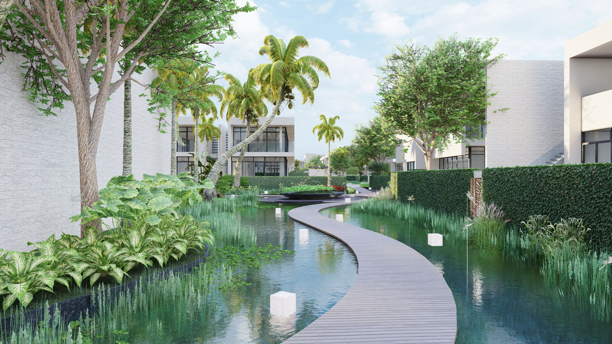 Các KTS của LSS đã tạo ra một dòng chảy cảnh quan liên tục giữa các khối công trình của dự án, đồng thời kết nối tất cả các khu chức năng cùng với trục cảnh quan chính hướng thẳng ra bãi biển. Có thể kể đến các cụm cảnh quan đặc trưng xuyên suốt theo dòng sông như thác nước, cảnh quan thu hoạch mùa vụ, đèn đom đóm, chỗ nghỉ chân mang hình tượng cánh buồm lênh đênh trên hồ….