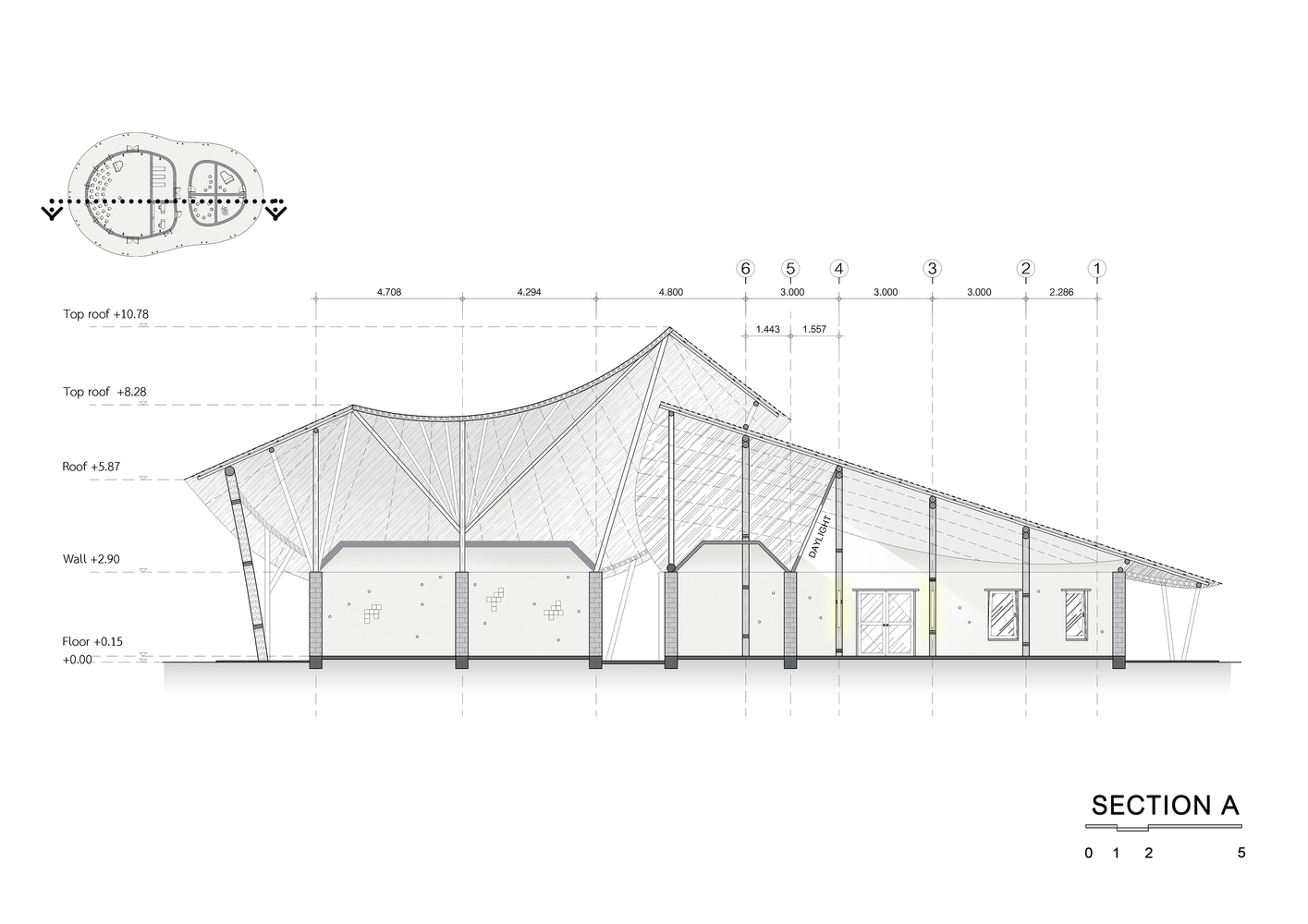 Phòng thí nghiệm Khoa học bao gồm 3 phòng thí nghiệm, hóa học, vật lý và sinh học, được trang bị các thiết bị hiện đại như máy hút khói, hệ thống làm sạch không khí, vòi hoa sen khẩn cấp,… Tòa nhà có hình chữ L, do cách mái nhà tre được thiết kế trông giống như một trái tim từ trên cao. Ngăn giữa đóng vai trò là phòng cung cấp, lưu trữ và phân phối trung tâm cho khí gas và tất cả các vật liệu trong phòng thí nghiệm. Tòa nhà thu hút trí tưởng tượng của người dùng bởi sự tương phản bất thường nhưng đồng thời cũng là sự kết hợp êm ái bất ngờ giữa cấu trúc tre và tường đất với công nghệ tiên tiến được trưng bày trong không gian phòng thí nghiệm.