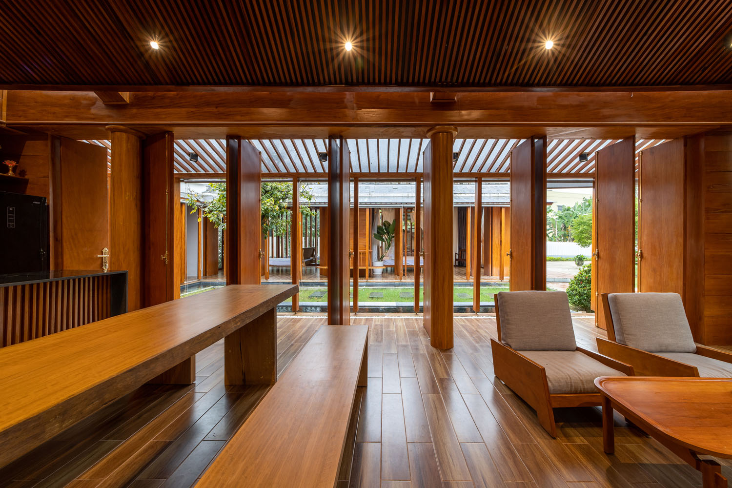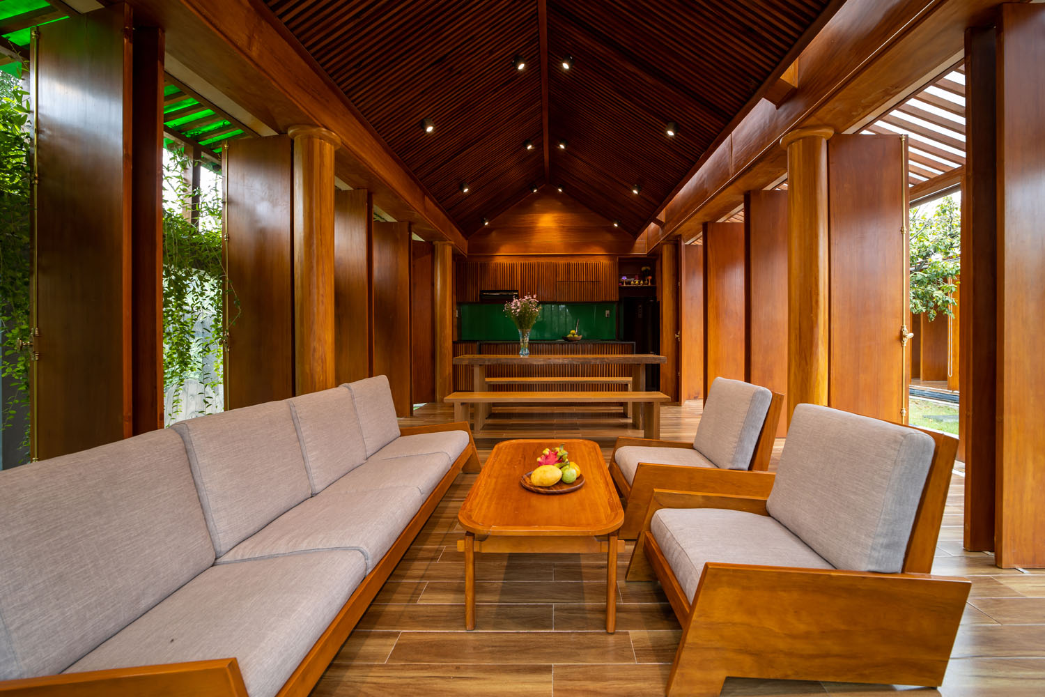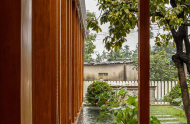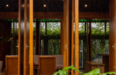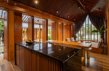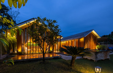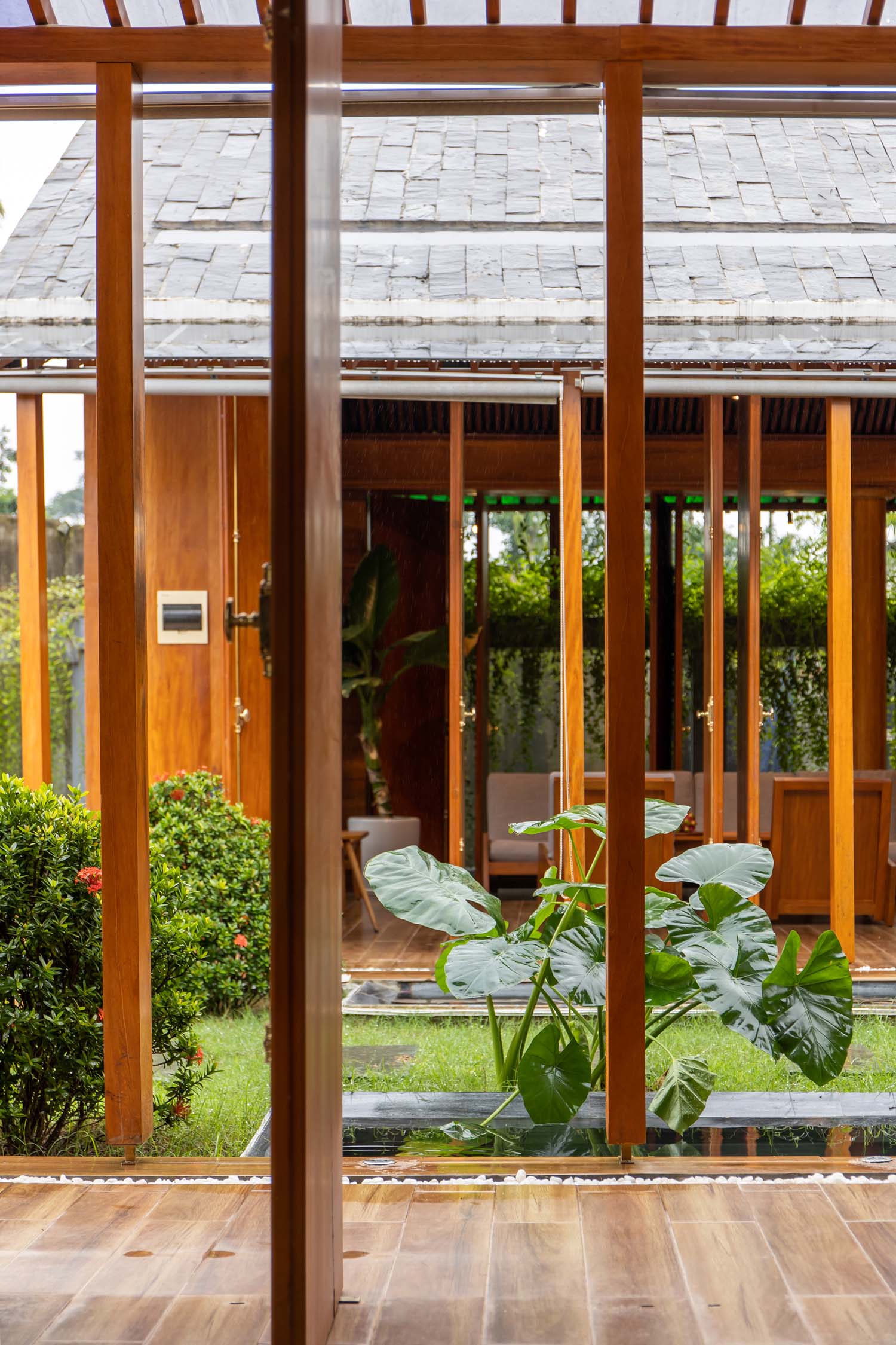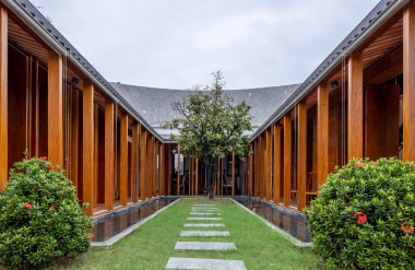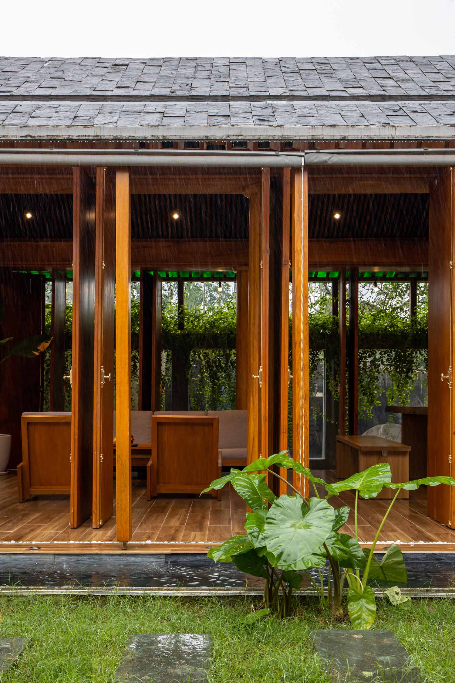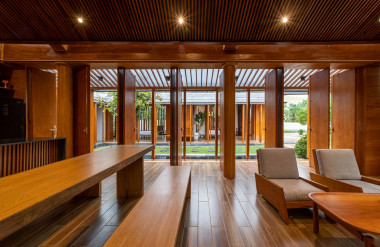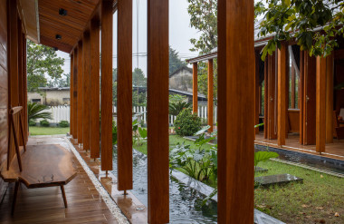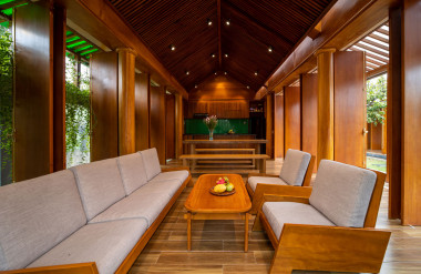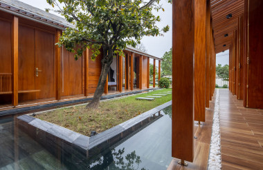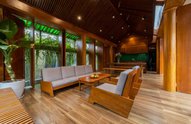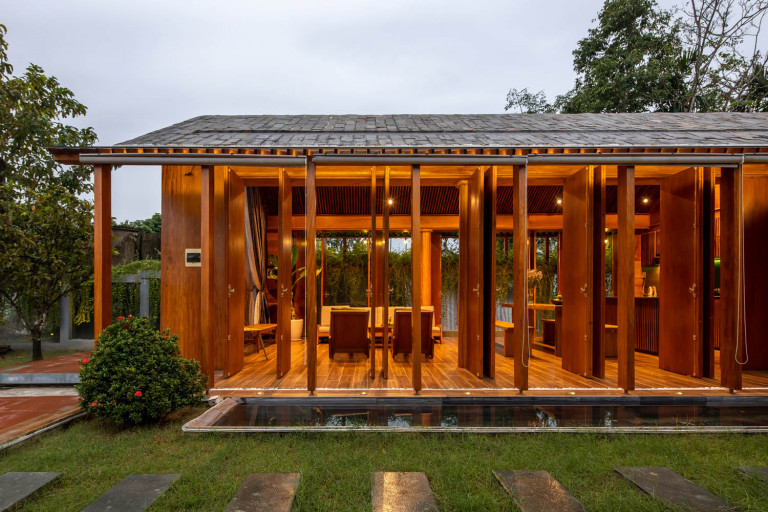 Kết hợp những vật liệu bền vững như bê tông cốt thép chịu lực, lợp mái đá tự nhiên, sử dụng gỗ mít ta để làm tường bao che, vách lam che nắng, vách gỗ, trần đóng gỗ keo vàng , đặc biệt đội ngũ KTS hạn chế xây tường và sử dụng 50 bộ cửa bức bàn , hàng hiên bọc quanh hồ nước trung tâm giúp kết nối các không gian chặt chẽ.