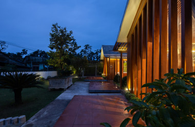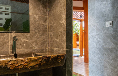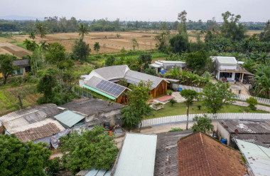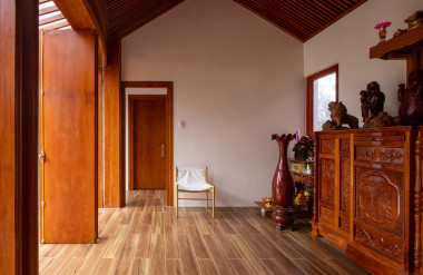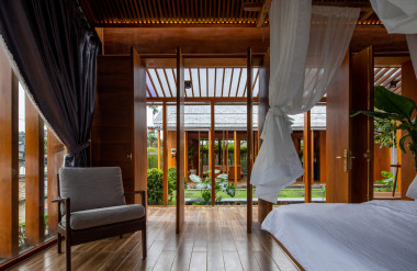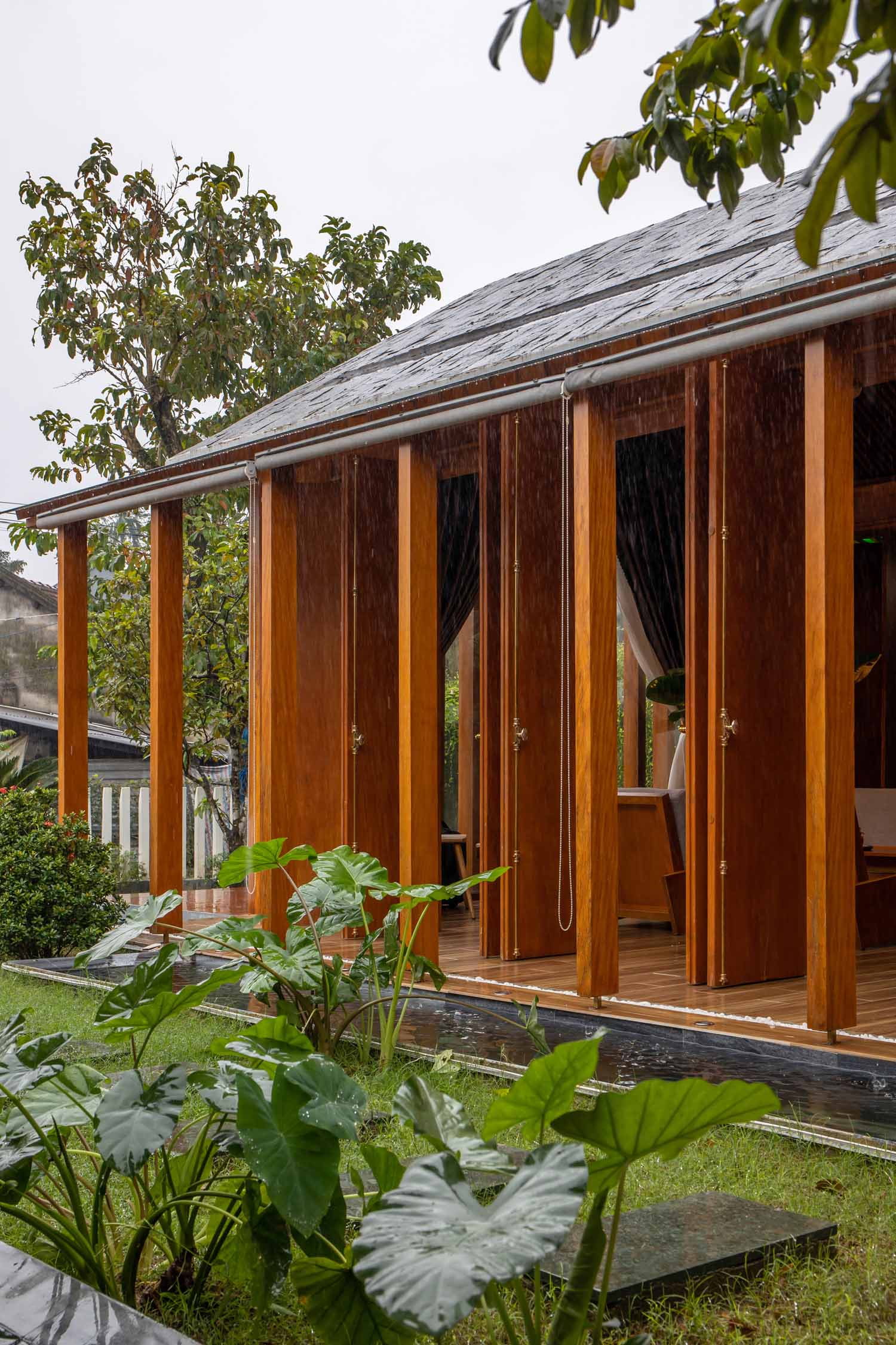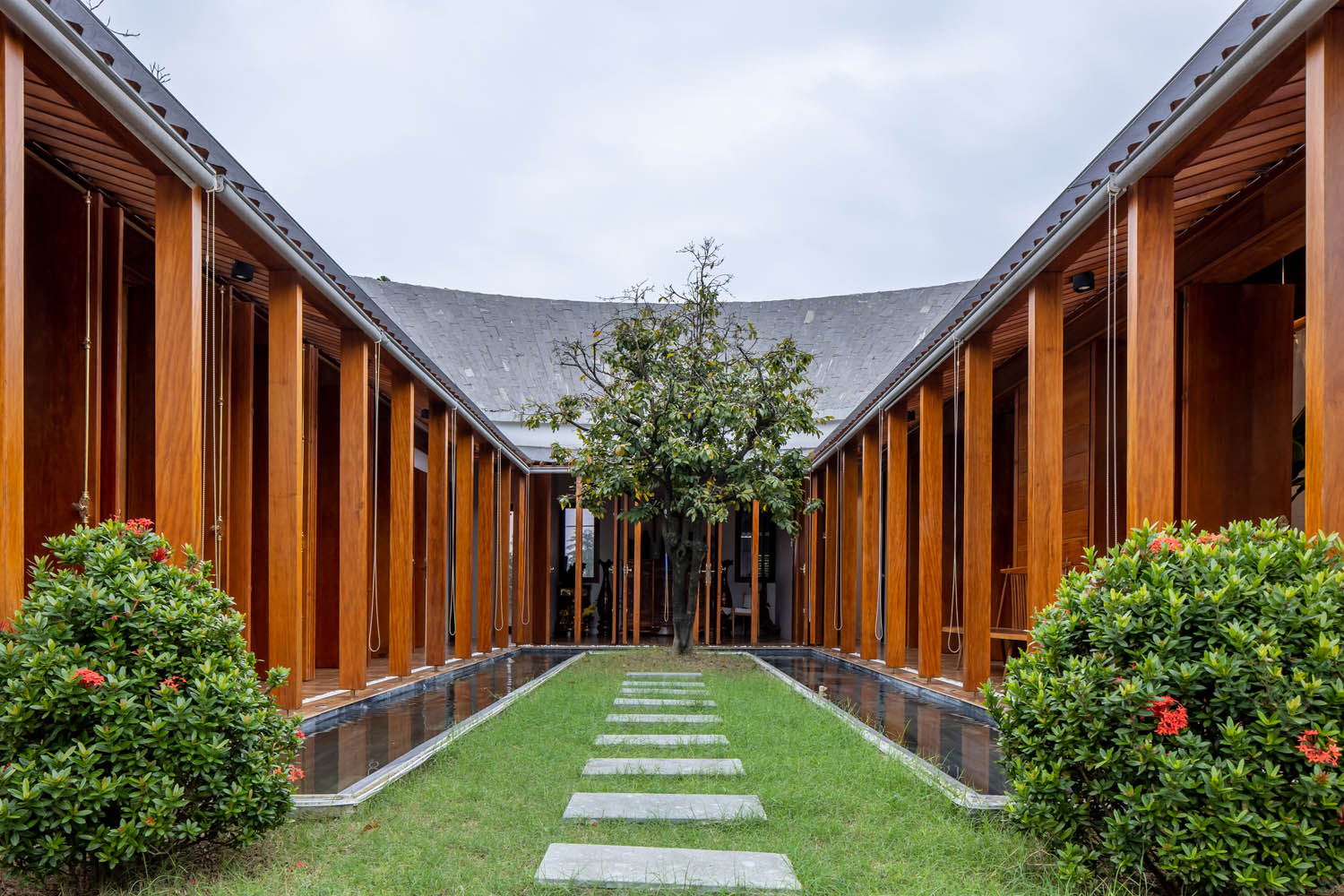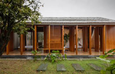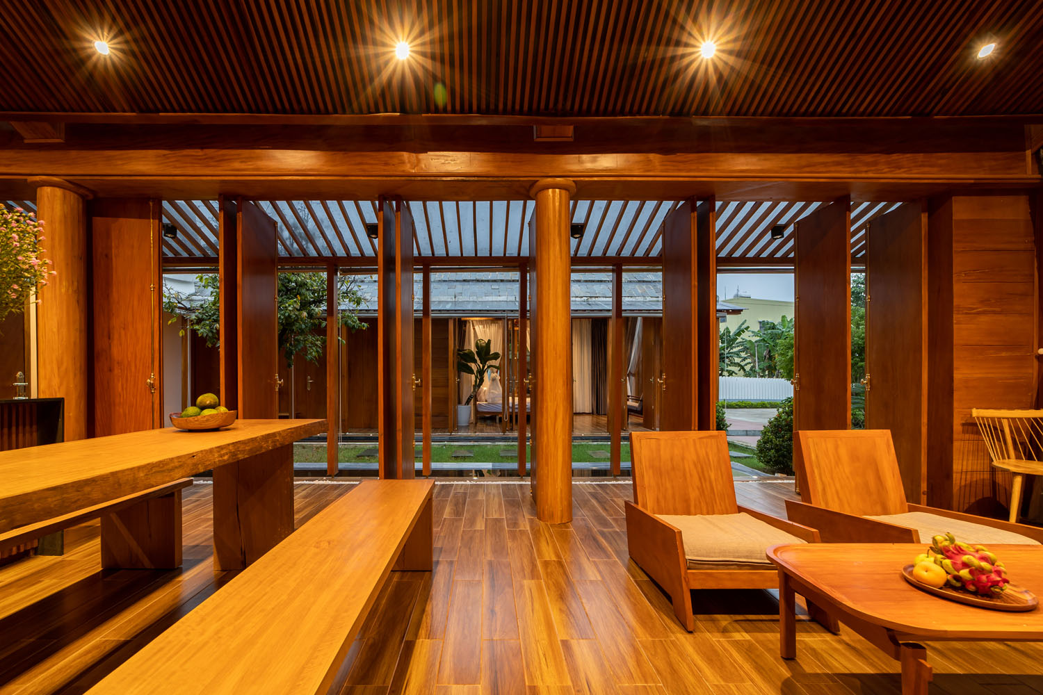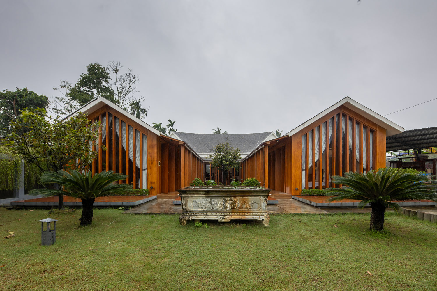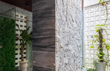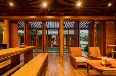 Kết hợp những vật liệu bền vững như bê tông cốt thép chịu lực, lợp mái đá tự nhiên, sử dụng gỗ mít ta để làm tường bao che, vách lam che nắng, vách gỗ, trần đóng gỗ keo vàng , đặc biệt đội ngũ KTS hạn chế xây tường và sử dụng 50 bộ cửa bức bàn , hàng hiên bọc quanh hồ nước trung tâm giúp kết nối các không gian chặt chẽ.