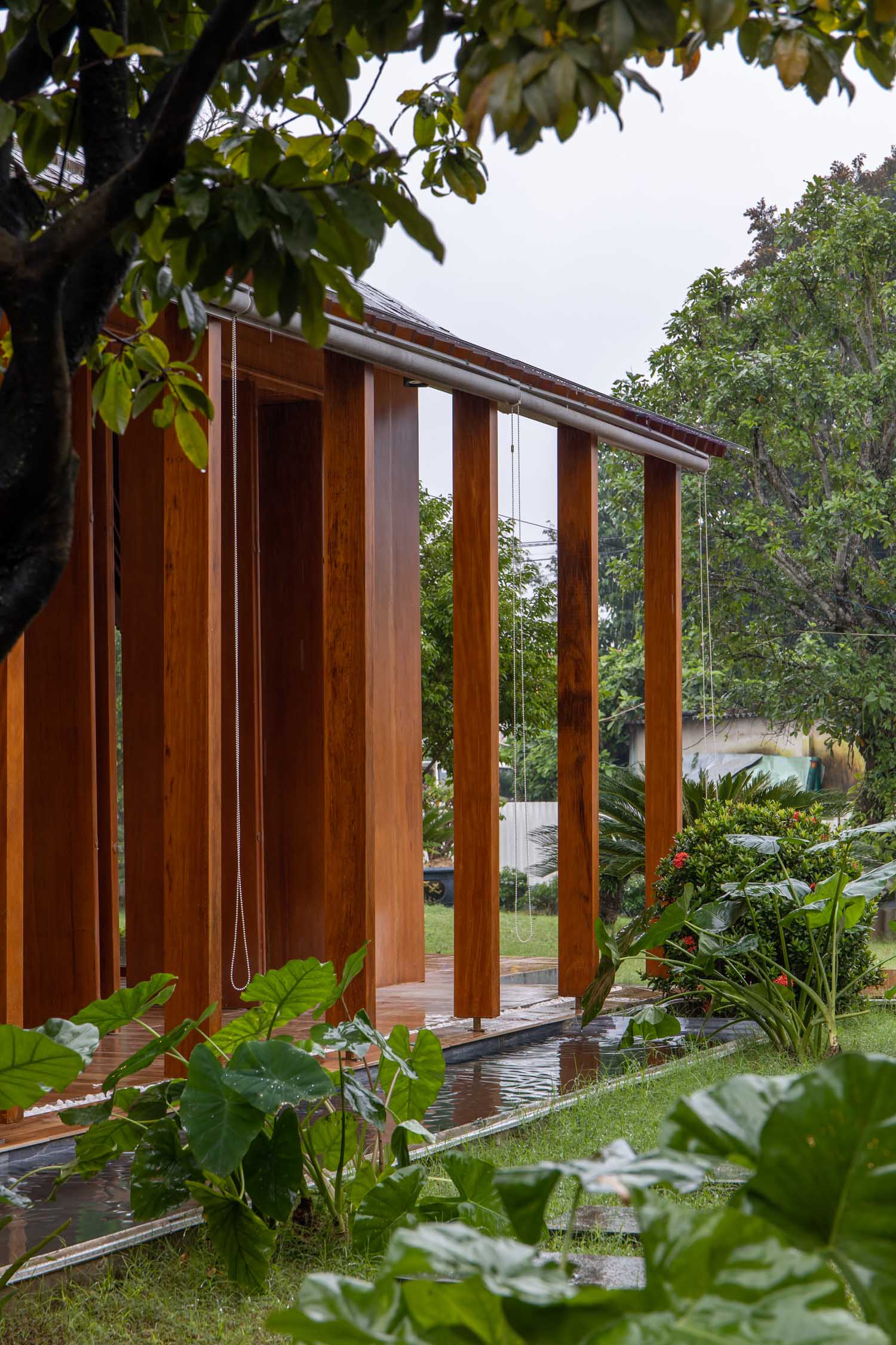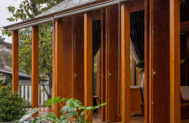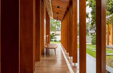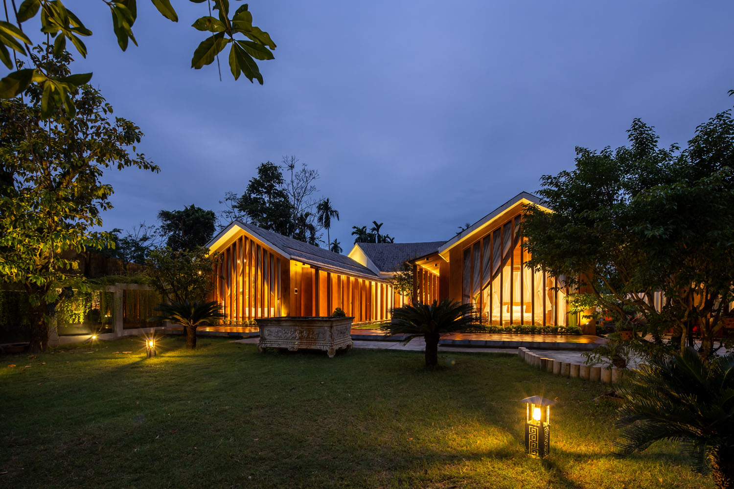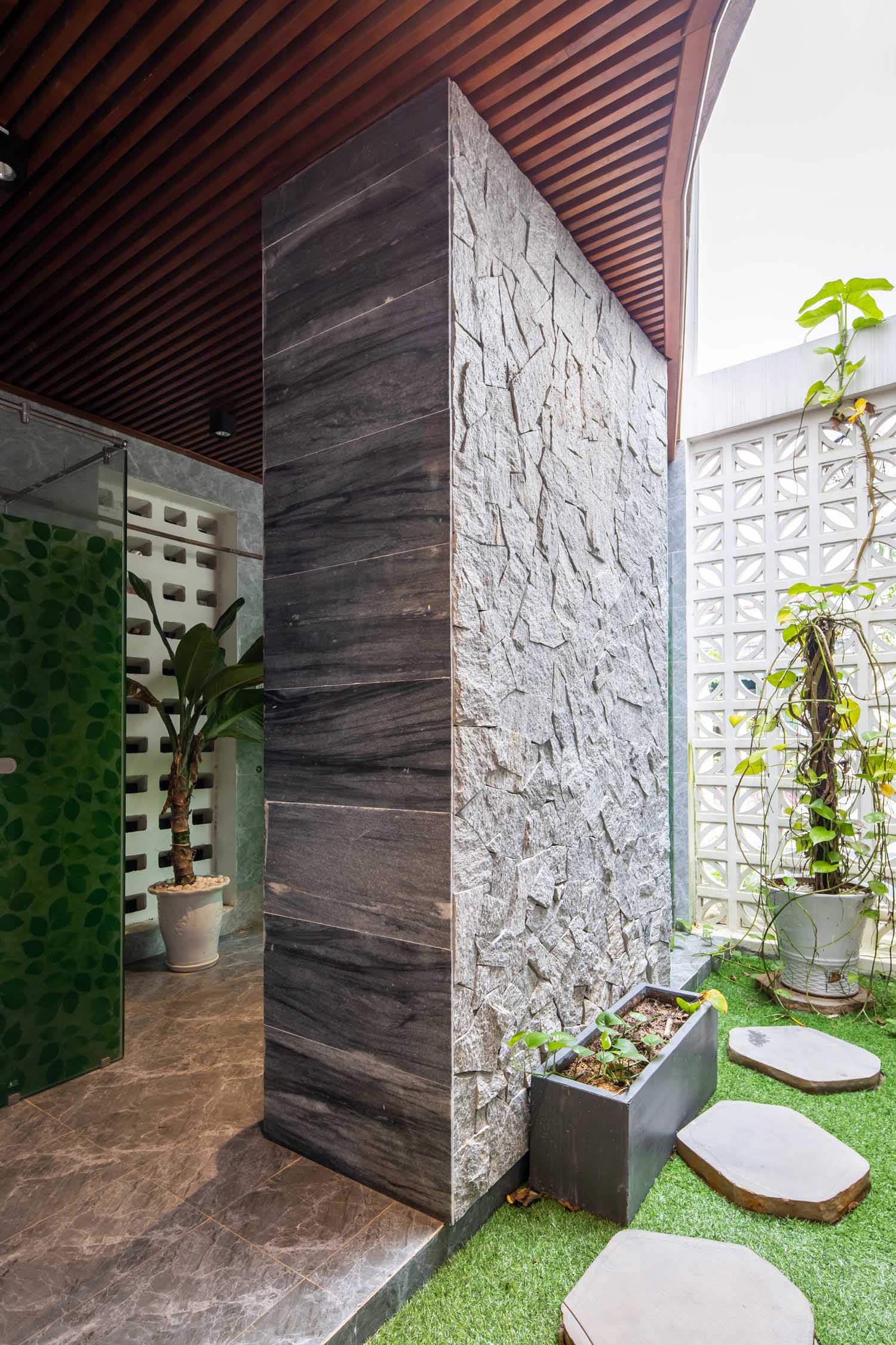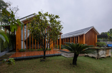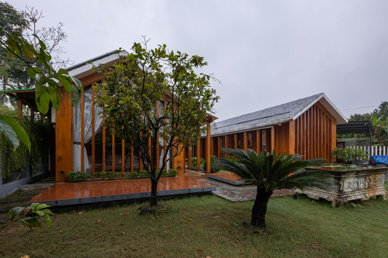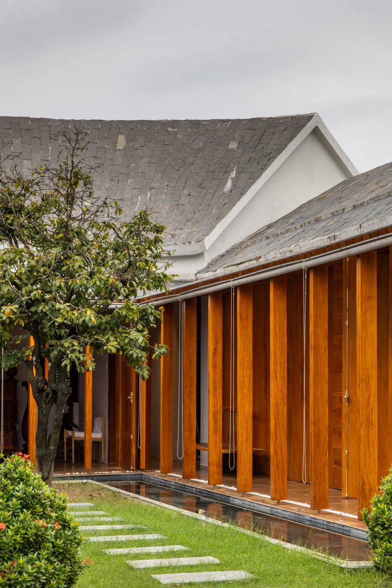 Kết hợp những vật liệu bền vững như bê tông cốt thép chịu lực, lợp mái đá tự nhiên, sử dụng gỗ mít ta để làm tường bao che, vách lam che nắng, vách gỗ, trần đóng gỗ keo vàng , đặc biệt đội ngũ KTS hạn chế xây tường và sử dụng 50 bộ cửa bức bàn , hàng hiên bọc quanh hồ nước trung tâm giúp kết nối các không gian chặt chẽ.