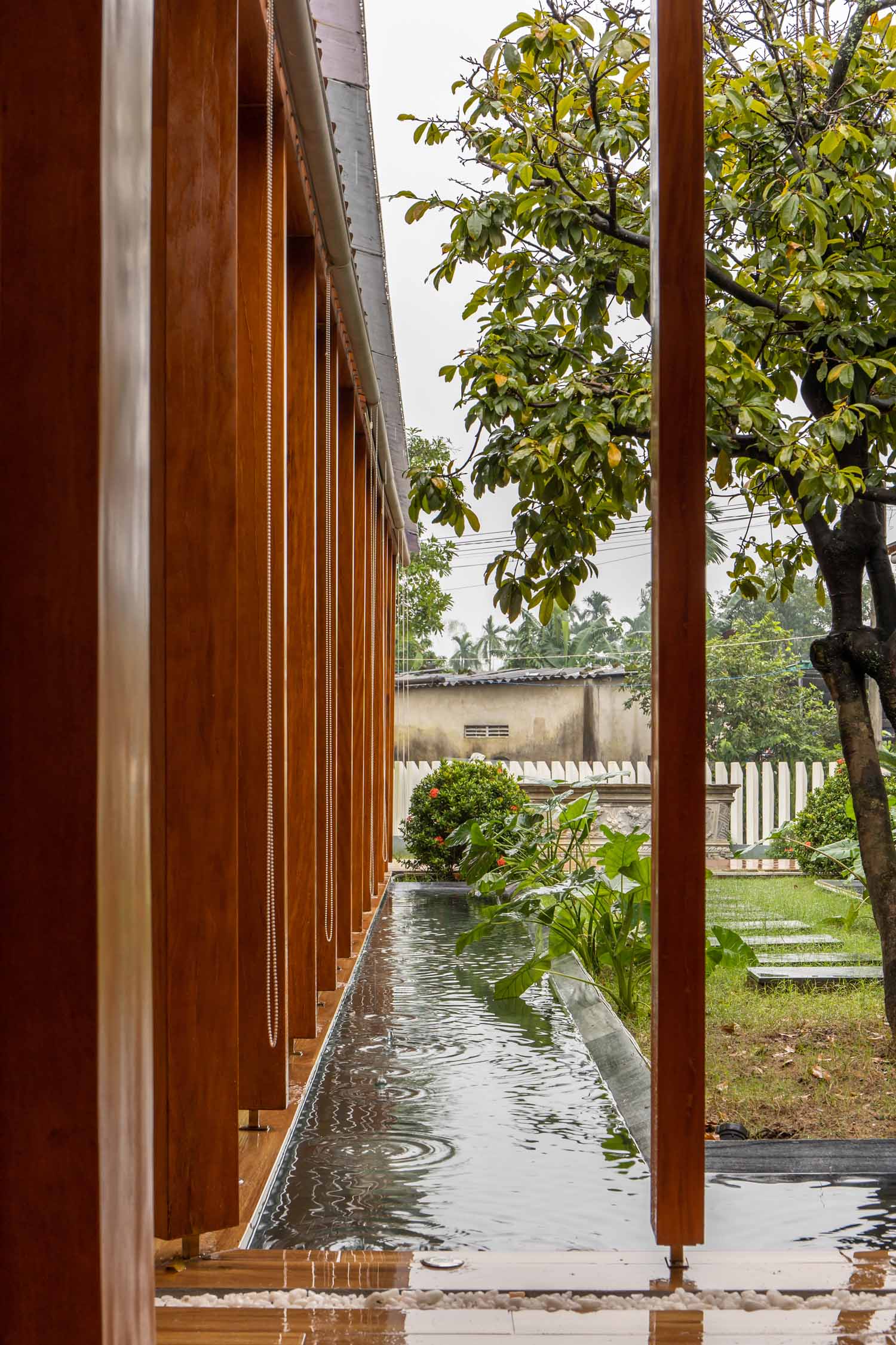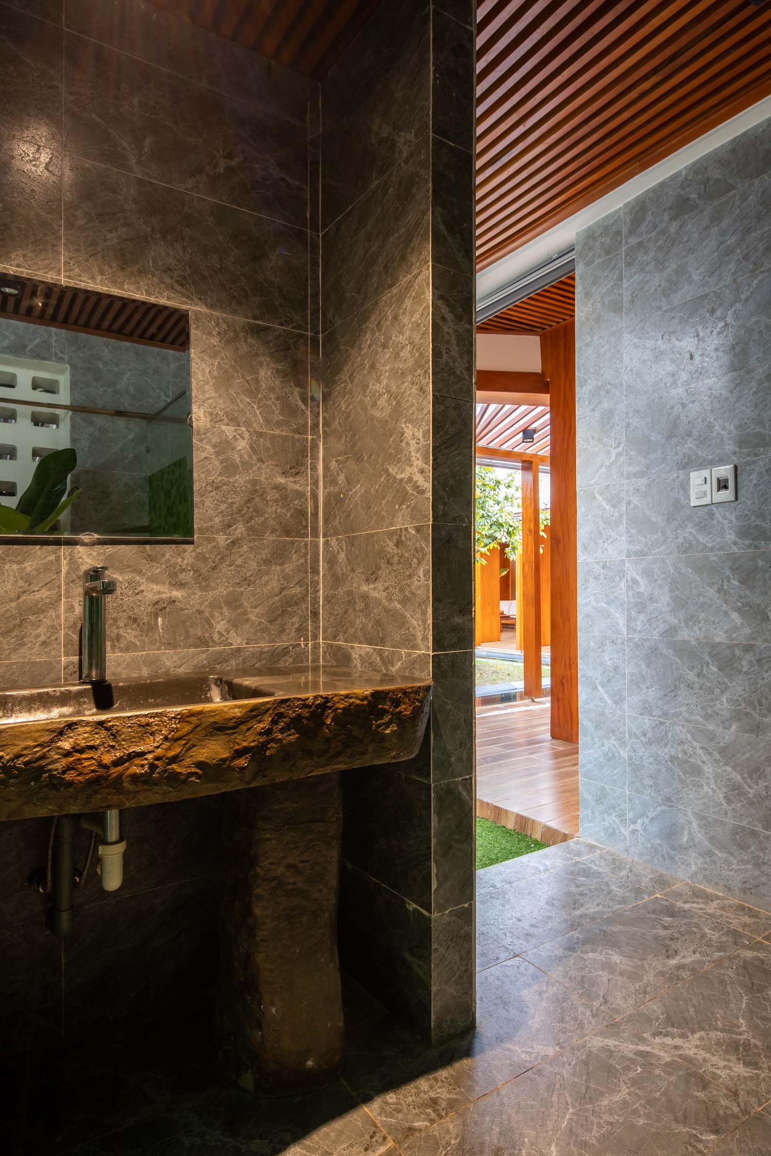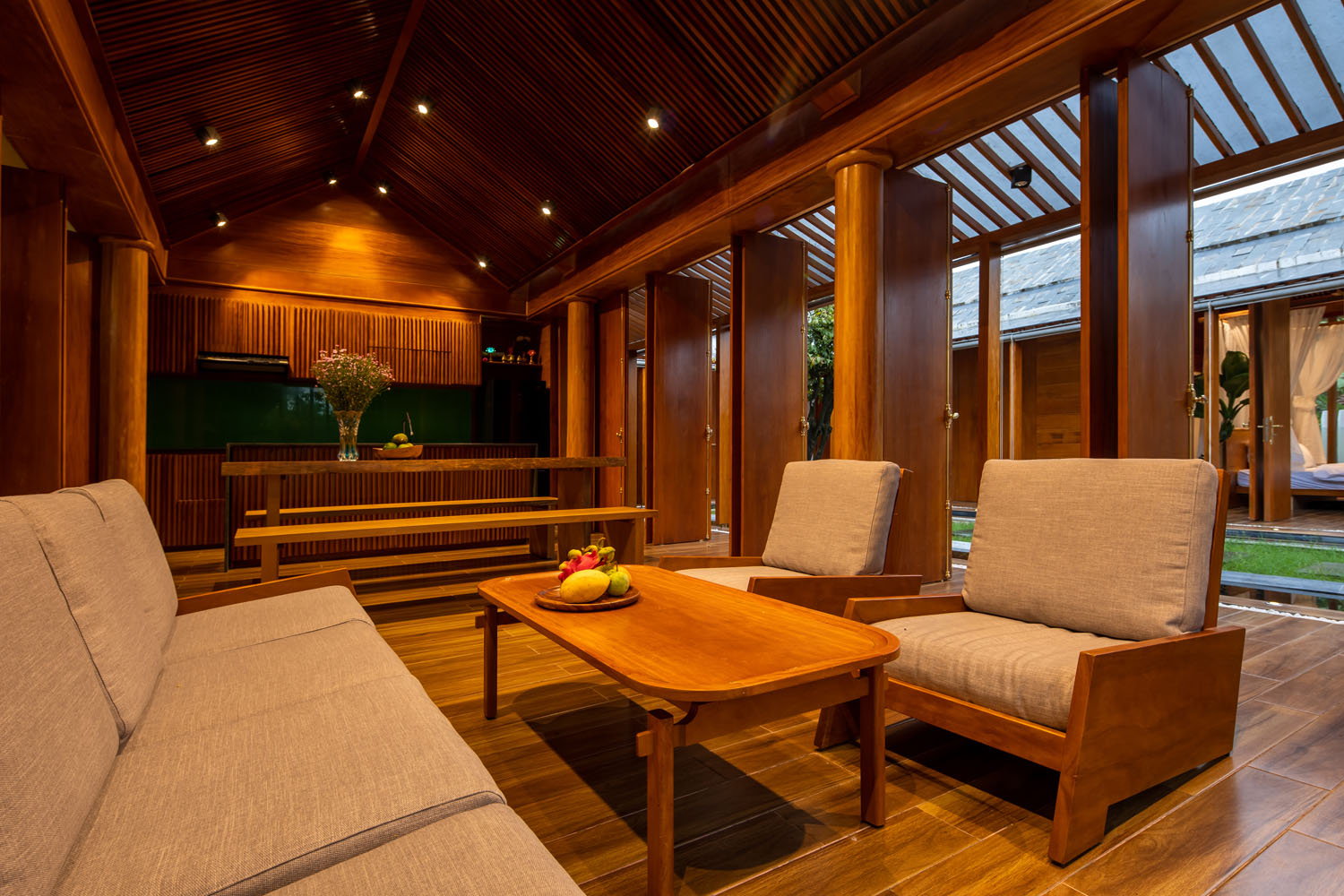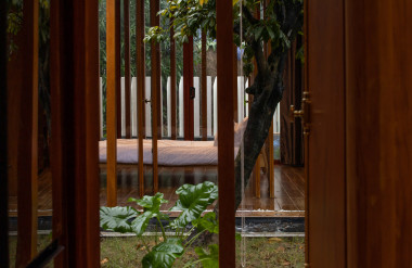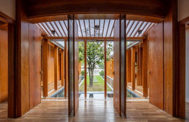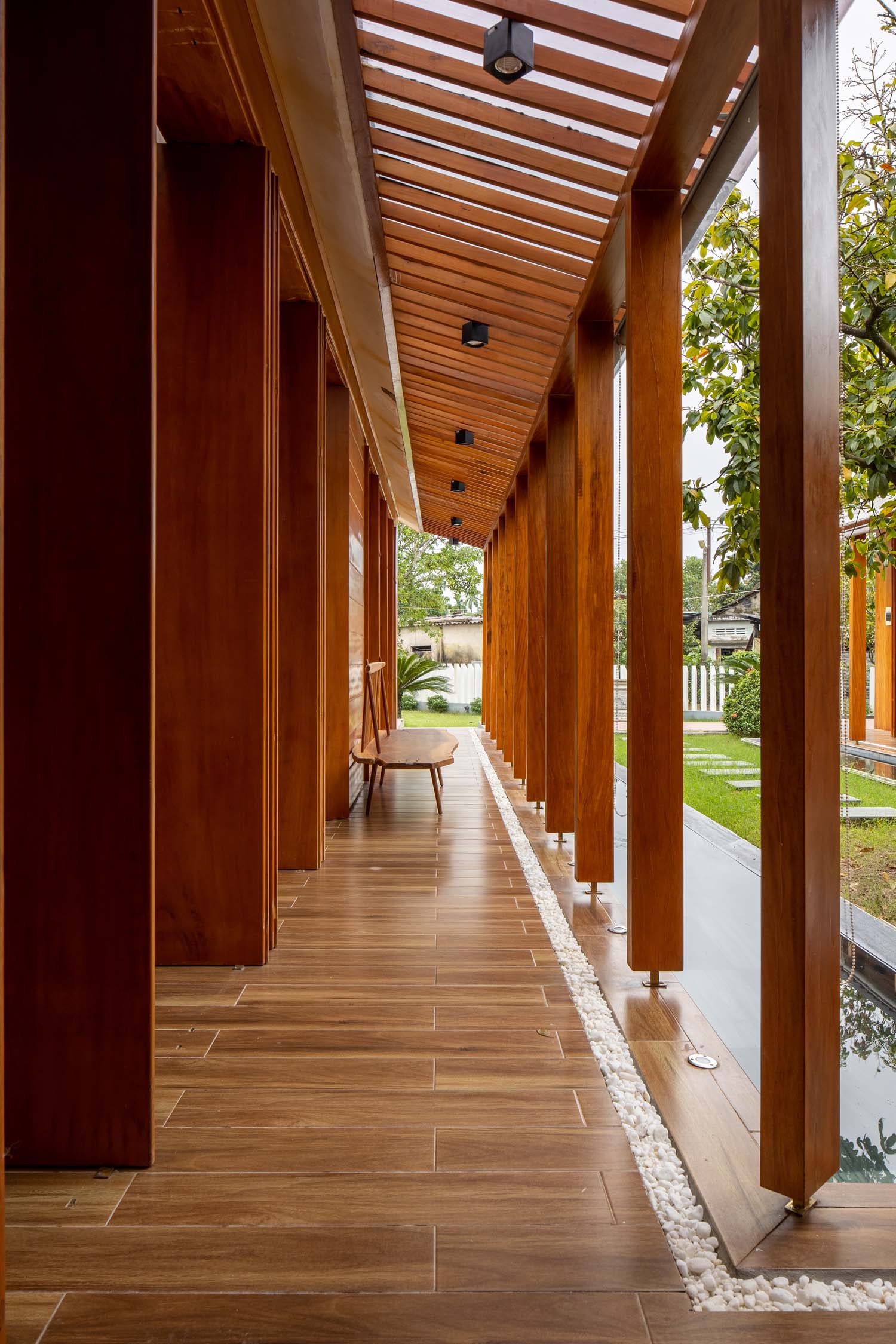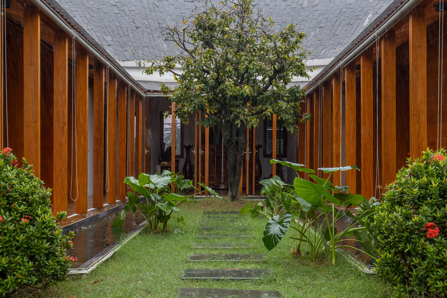 Kết hợp những vật liệu bền vững như bê tông cốt thép chịu lực, lợp mái đá tự nhiên, sử dụng gỗ mít ta để làm tường bao che, vách lam che nắng, vách gỗ, trần đóng gỗ keo vàng , đặc biệt đội ngũ KTS hạn chế xây tường và sử dụng 50 bộ cửa bức bàn , hàng hiên bọc quanh hồ nước trung tâm giúp kết nối các không gian chặt chẽ.