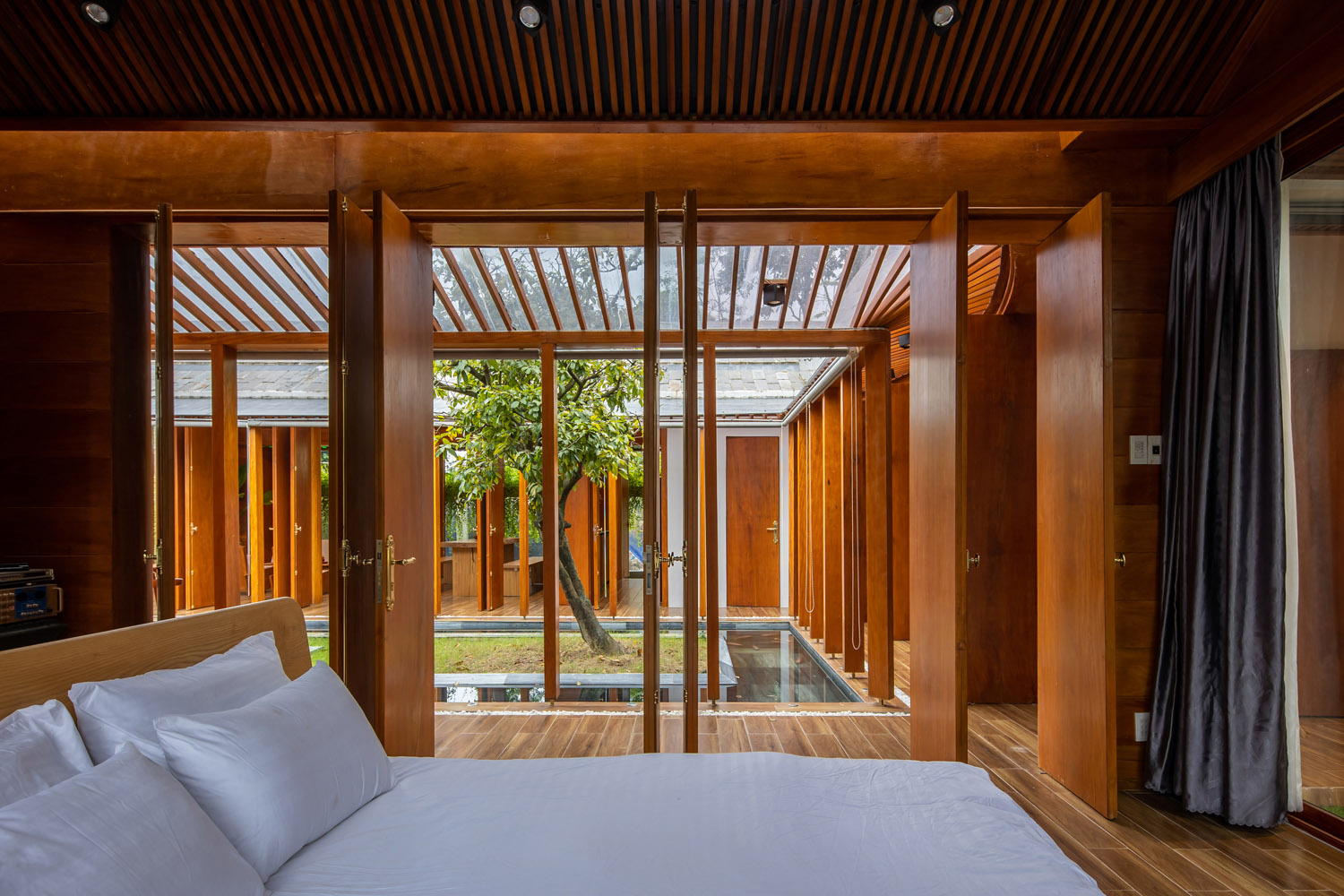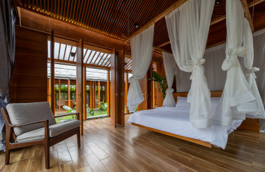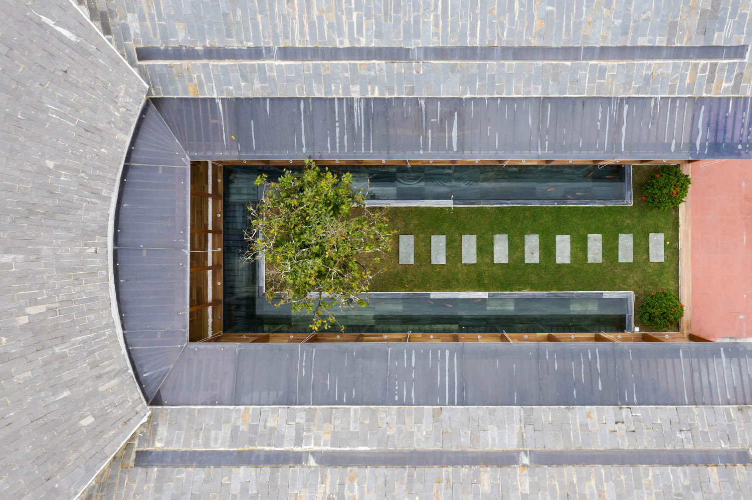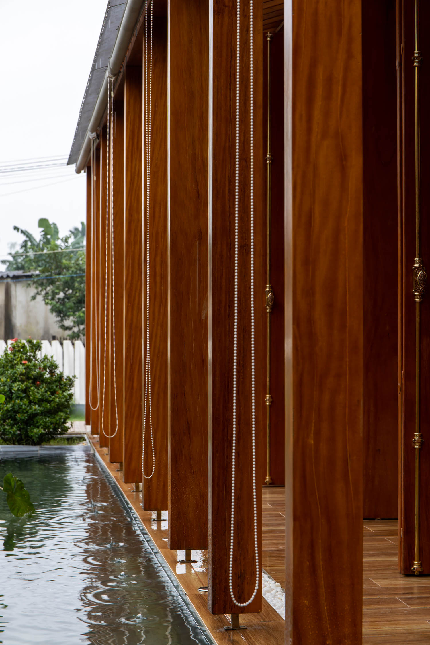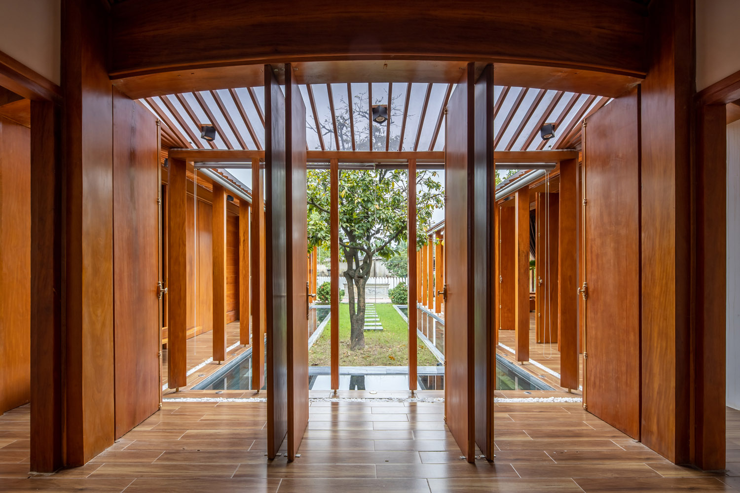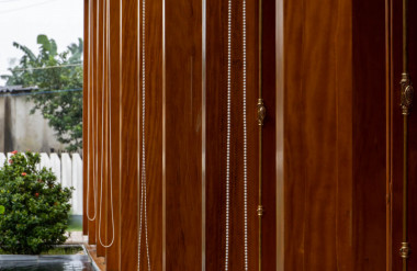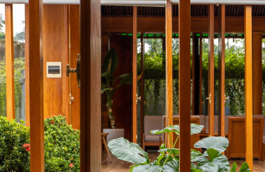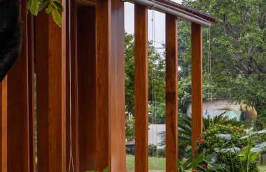 Kết hợp những vật liệu bền vững như bê tông cốt thép chịu lực, lợp mái đá tự nhiên, sử dụng gỗ mít ta để làm tường bao che, vách lam che nắng, vách gỗ, trần đóng gỗ keo vàng , đặc biệt đội ngũ KTS hạn chế xây tường và sử dụng 50 bộ cửa bức bàn , hàng hiên bọc quanh hồ nước trung tâm giúp kết nối các không gian chặt chẽ.