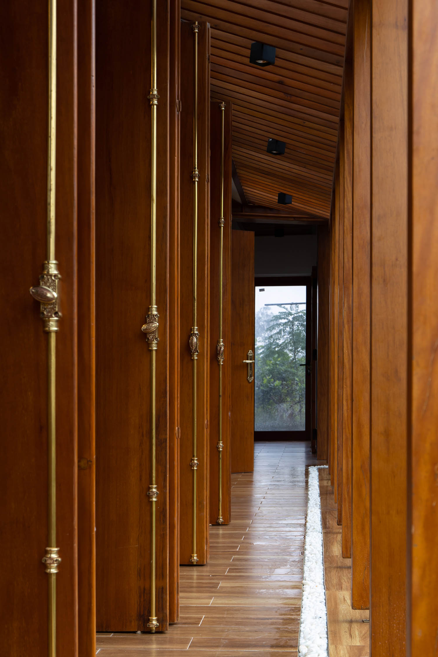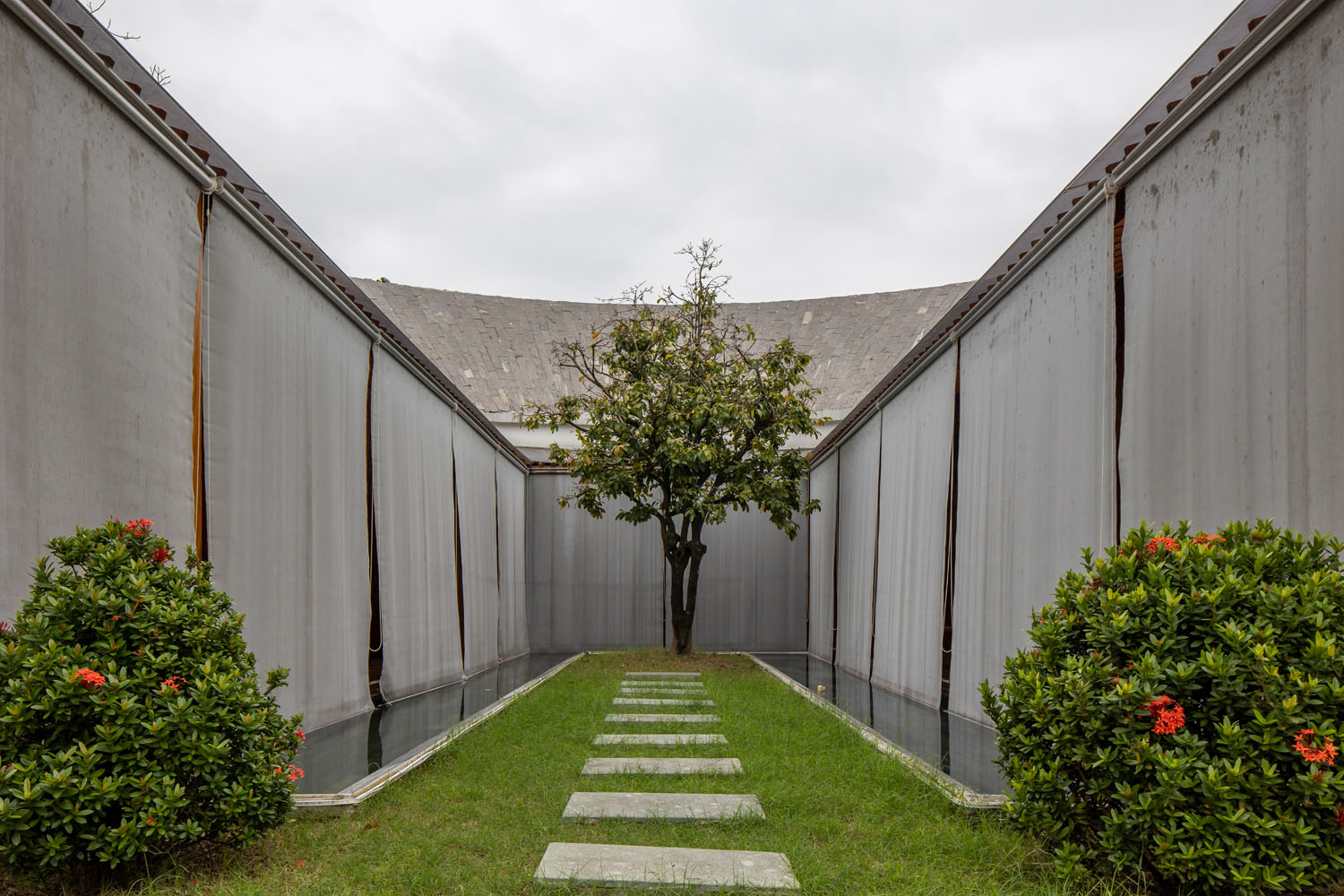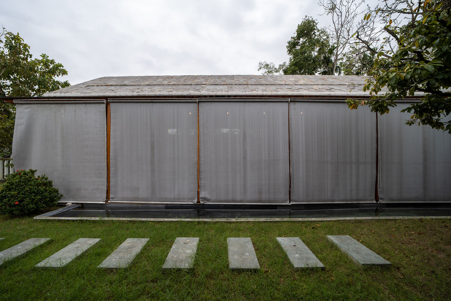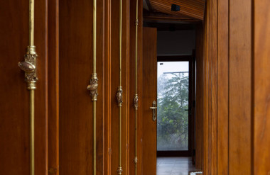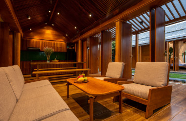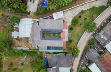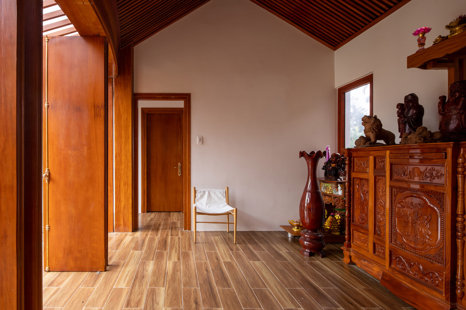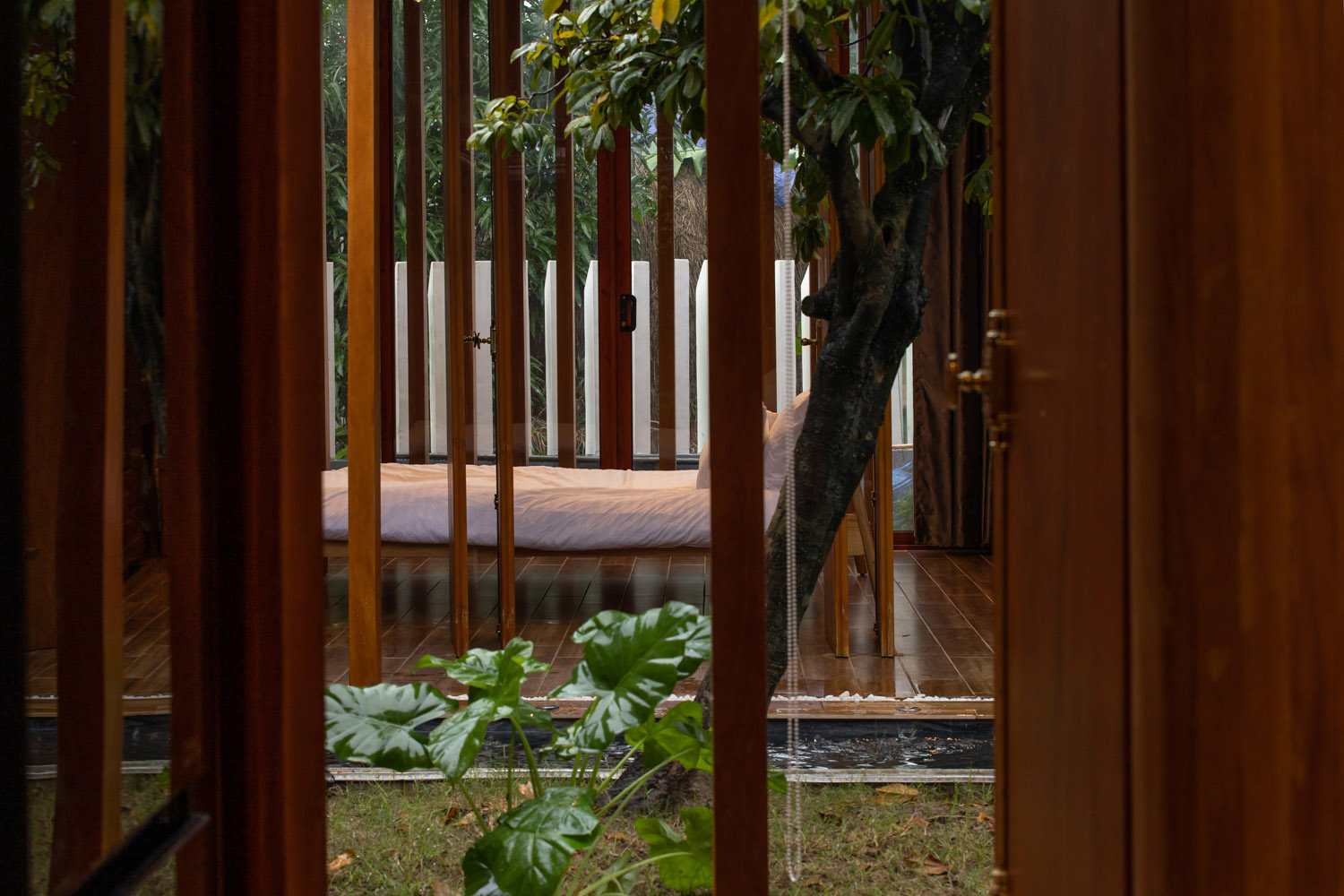 Kết hợp những vật liệu bền vững như bê tông cốt thép chịu lực, lợp mái đá tự nhiên, sử dụng gỗ mít ta để làm tường bao che, vách lam che nắng, vách gỗ, trần đóng gỗ keo vàng , đặc biệt đội ngũ KTS hạn chế xây tường và sử dụng 50 bộ cửa bức bàn , hàng hiên bọc quanh hồ nước trung tâm giúp kết nối các không gian chặt chẽ.