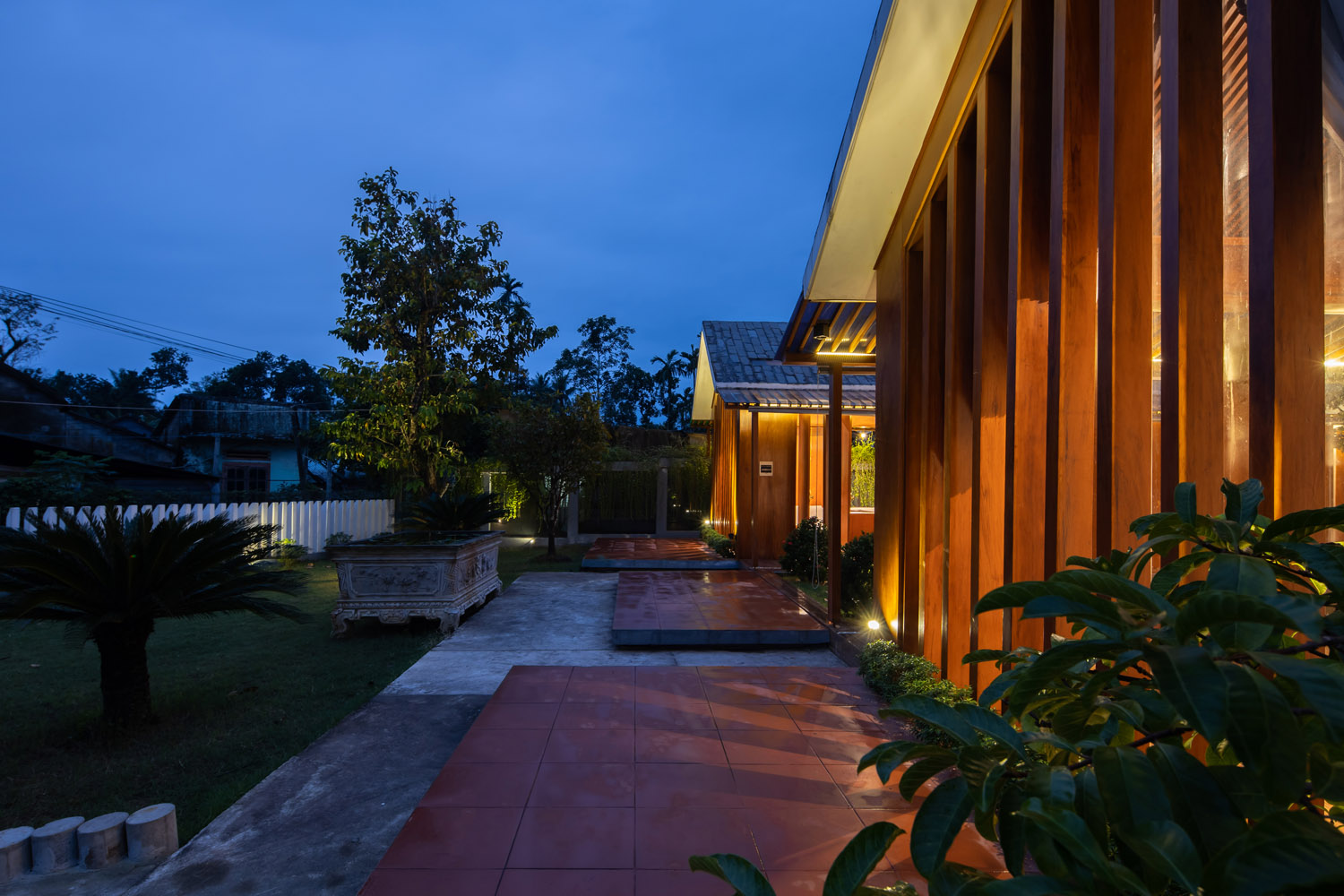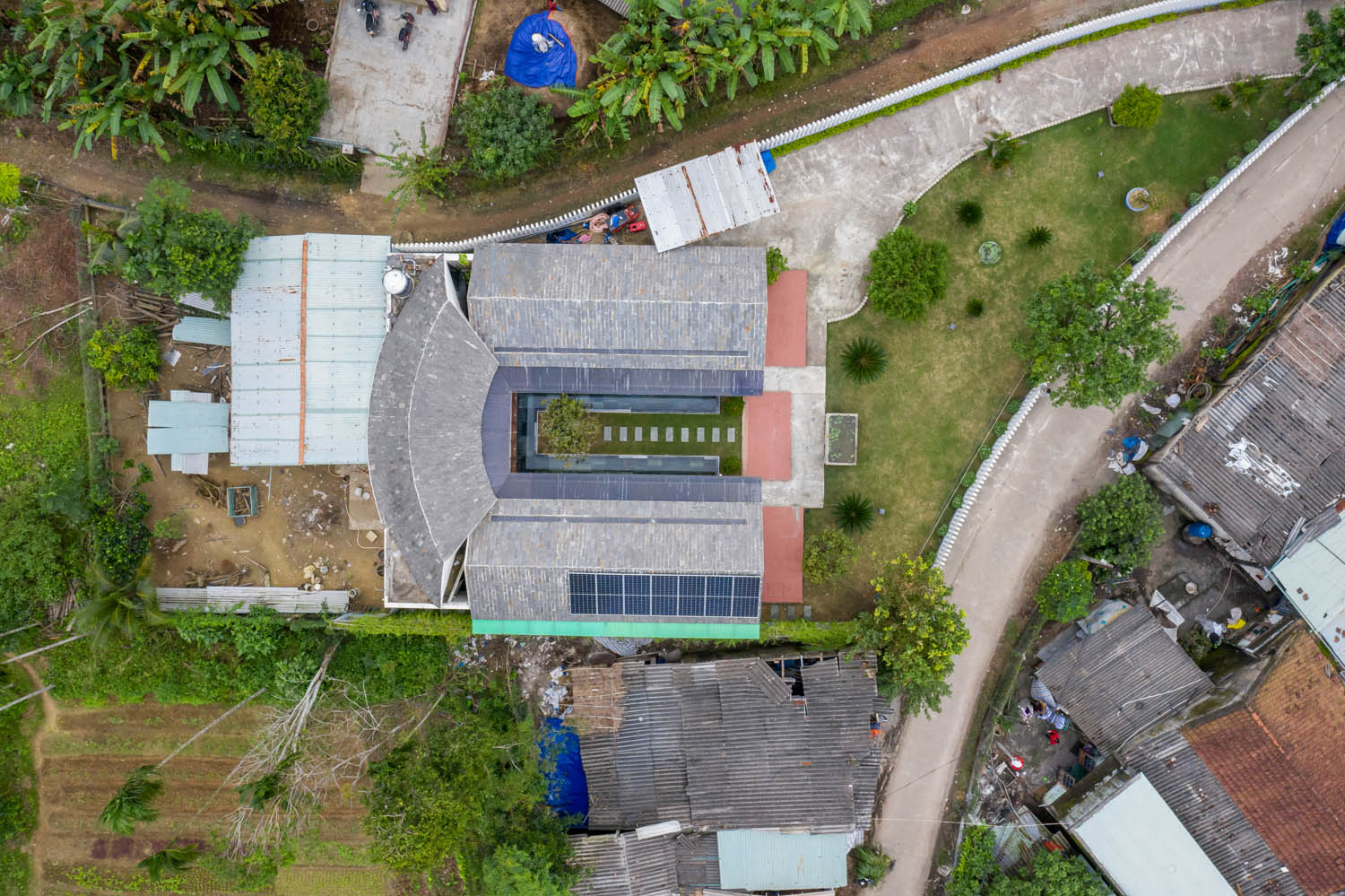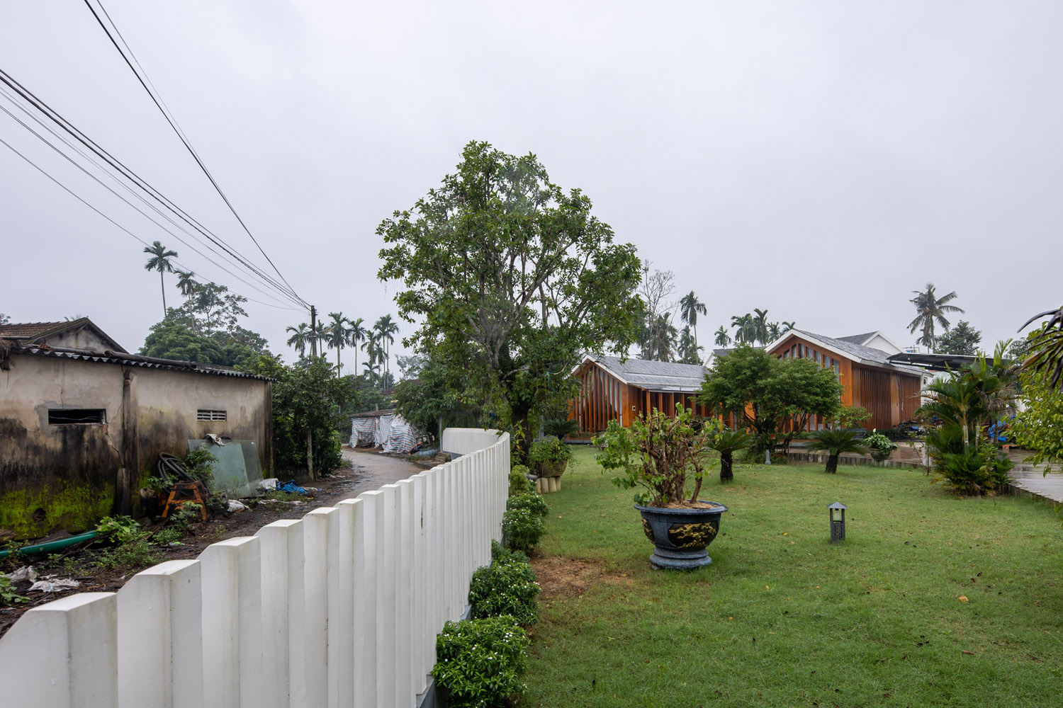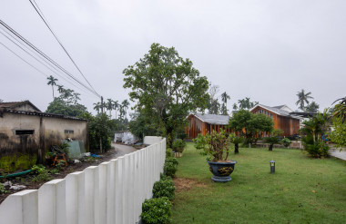 Công trình có khoảng lùi 12m so với đường bê tông chính liên xã, tạo một khoảng sân vườn lớn phía trước nhằm giảm thiểu tác động khói bụi, tiếng ồn, từ xe cộ,có không gian xanh và di dời cổng nhà cũ sang góc bên phải tạo chiều sâu không gian và có khoảng đệm cho công trình.