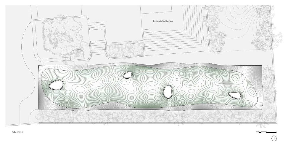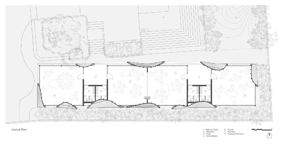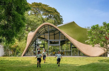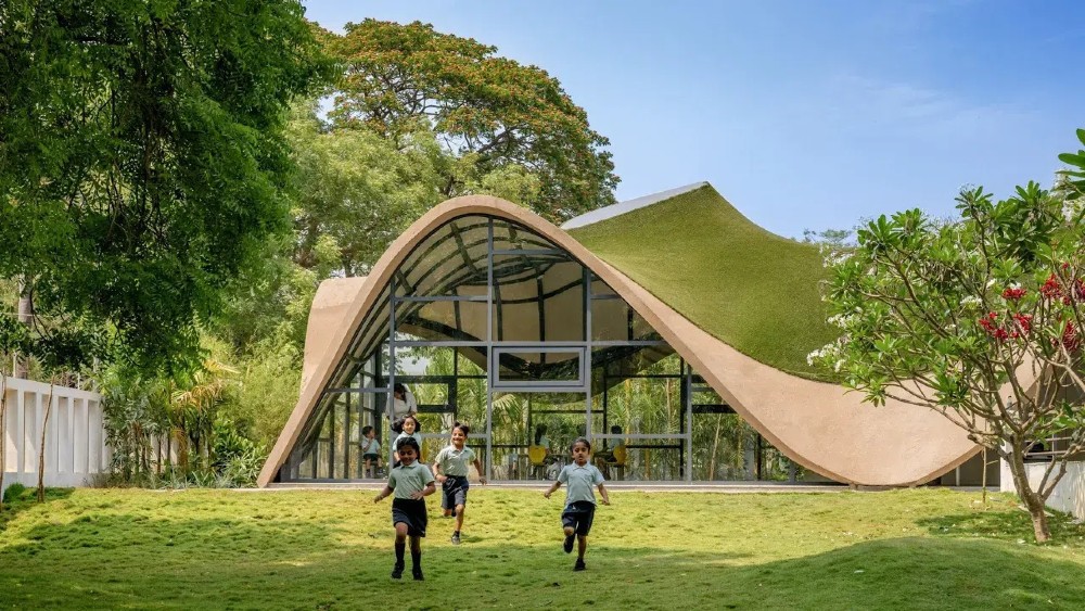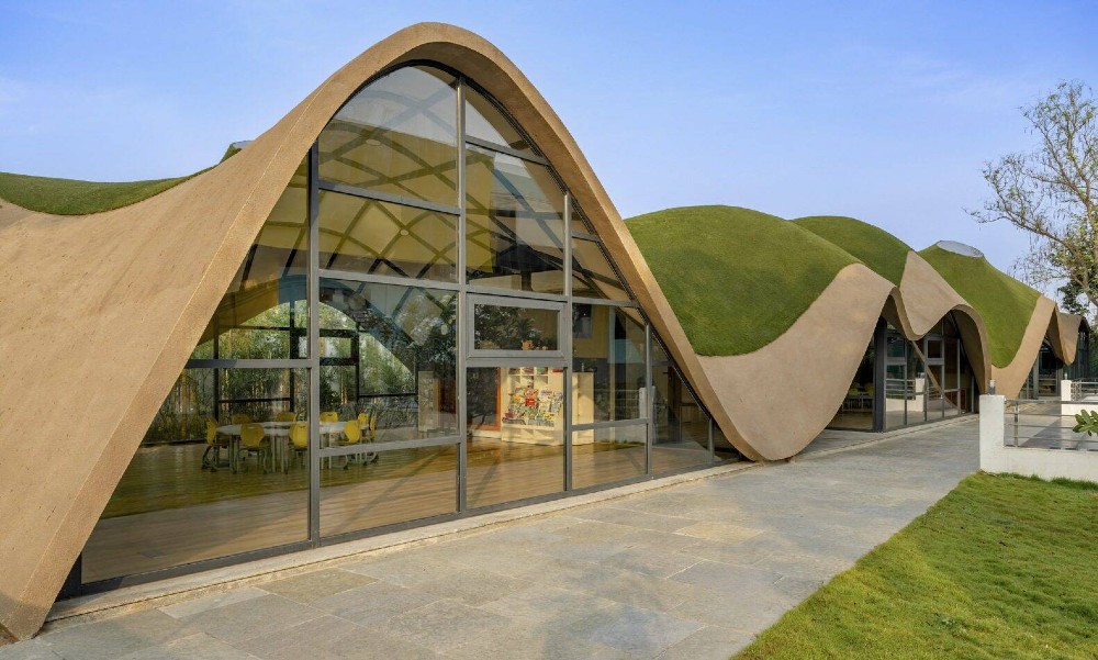 Thay vì chỉ đơn thuần là một công trình kiến trúc trường học thông thường, ngôi trường này được thiết kế trở thành một phần sống động của cảnh quan, dựa trên hình thức kiến trúc thay vì sử dụng các gam màu tươi sáng để tạo ra sự quan tâm trực quan. Điều này được thể hiện rõ nét qua những mái nhà uốn lượn mềm mại, tựa như những con sóng hay những ngọn đồi xanh mát, tạo nên một hình ảnh độc đáo và ấn tượng. Từ xa nhìn lại, tòa nhà như hòa vào thiên nhiên, trở thành một phần không thể thiếu của khung cảnh. Khi đến gần hơn, người ta mới khám phá ra sự tinh tế trong thiết kế, nơi mà các em nhỏ được bao bọc và bảo vệ bên trong những “chiếc kén”.