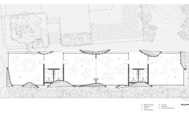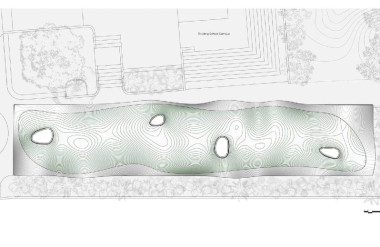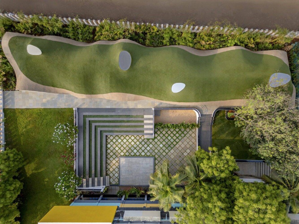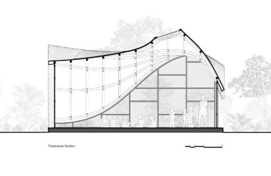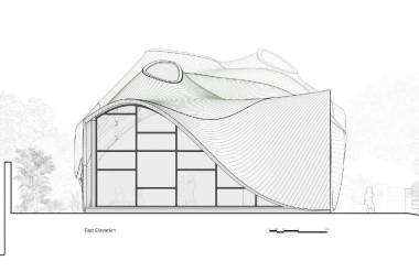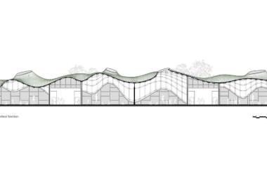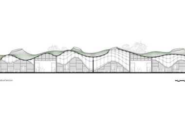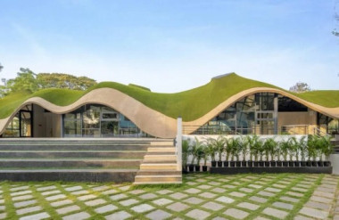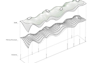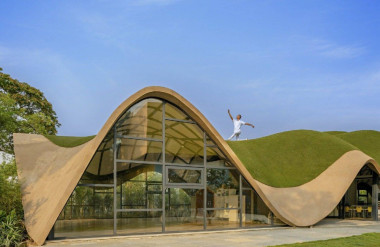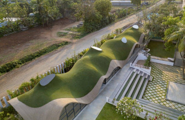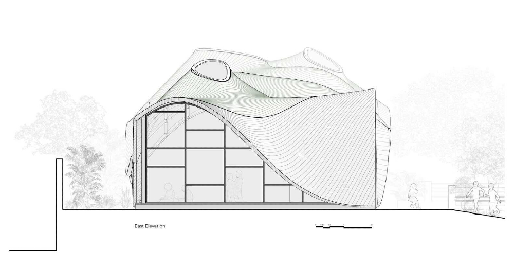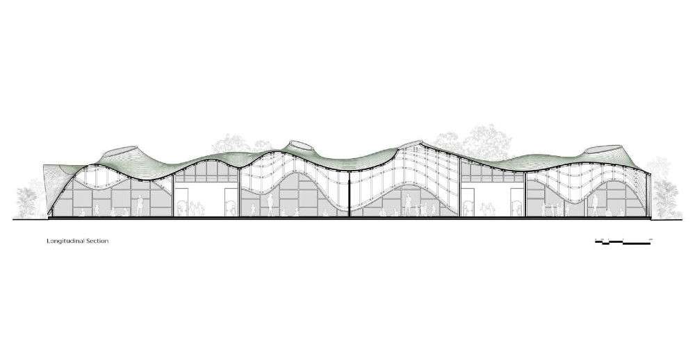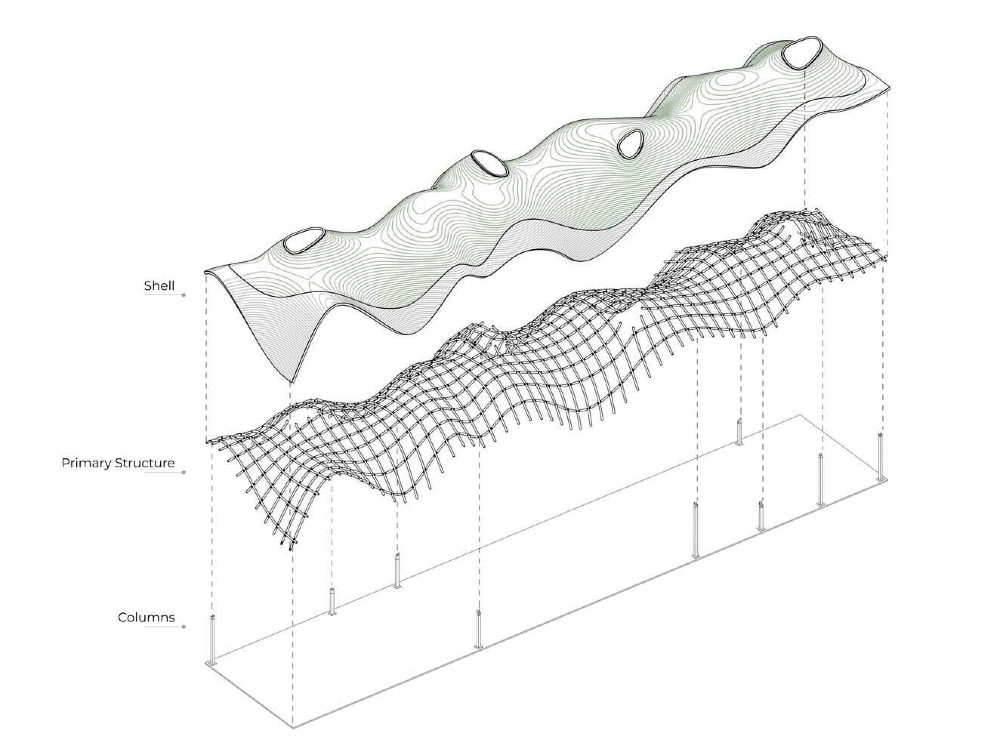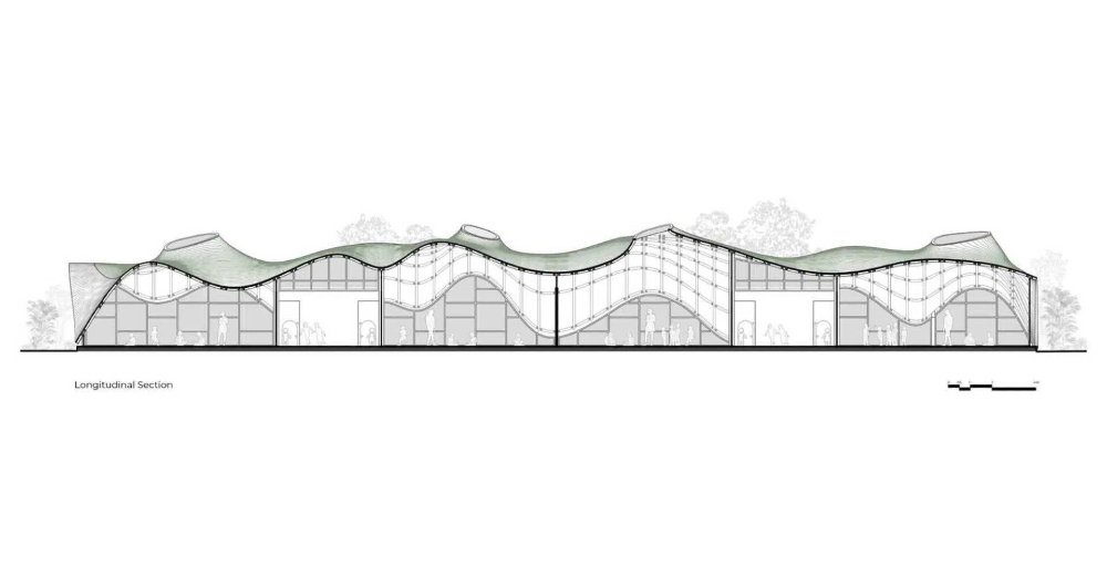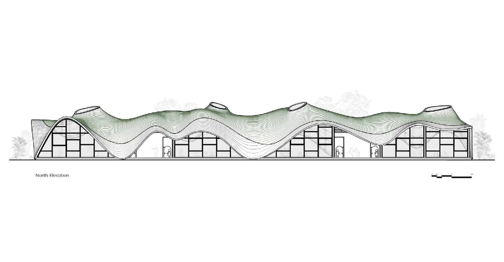 Phần độc đáo nhất của công trình là mái nhà dạng uốn lượn, được phủ xanh bởi thảm cỏ và nằm trên một không gian có cấu trúc thông thoáng, không có bất kỳ điểm tựa bên trong hoặc vách ngăn nào, tất cả được khái niệm hóa bằng các công cụ tính toán. Thiết kế này không chỉ mang đến một vẻ đẹp độc đáo mà còn tạo nên một không gian mở, kết hợp hài hòa giữa kiến trúc và thiên nhiên, tạo nên một điểm nhấn ấn tượng trong khu vực. Điều đáng ngạc nhiên hơn là cấu trúc độc đáo này được hiện thực hóa với nguồn ngân sách hạn chế bằng cách áp dụng một quy trình xây dựng hiệu quả, xét đến các nguồn tài nguyên và công nghệ sẵn có.