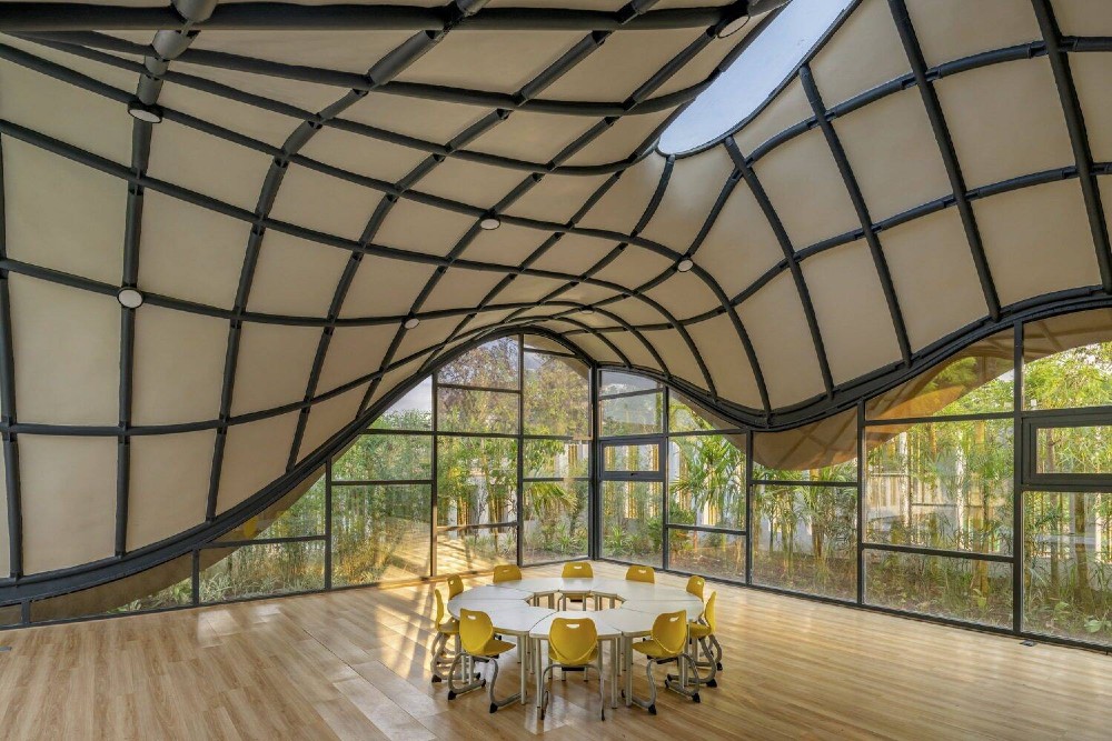 Khi nhìn từ bên trong, mái nhà như một tác phẩm nghệ thuật trừu tượng. Những yếu tố cấu trúc lộ ra dọc theo trần nhà tạo nên sự tương phản đẹp mắt với bề mặt phủ cỏ xanh bên ngoài, làm tôn lên vẻ đẹp của từng chất liệu. Hiệu ứng thị giác của không gian bên trong càng thêm ấn tượng nhờ ánh sáng tự nhiên phân tán qua giếng trời, nổi bật những đường cong liền mạch và tạo ra điểm neo trong mỗi phòng học. Ánh sáng và bóng đổ luân phiên trên trần nhà, như một bức tranh sống động, kích thích trí tò mò và sự sáng tạo của người nhìn.