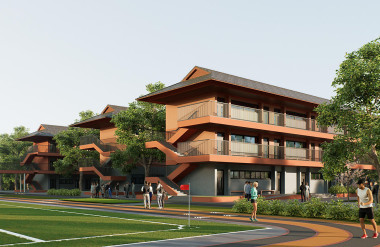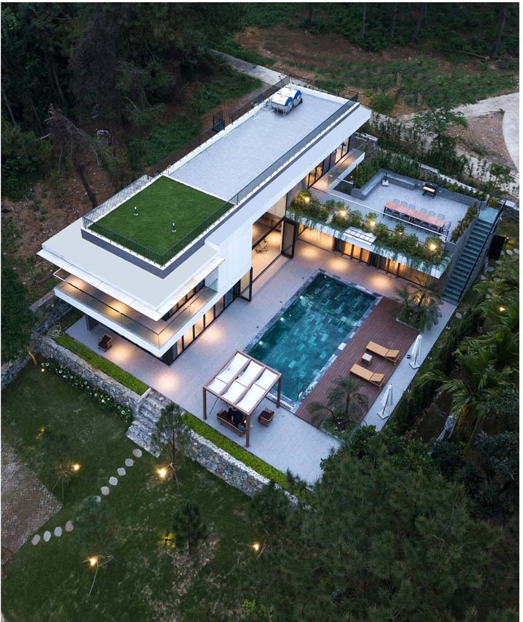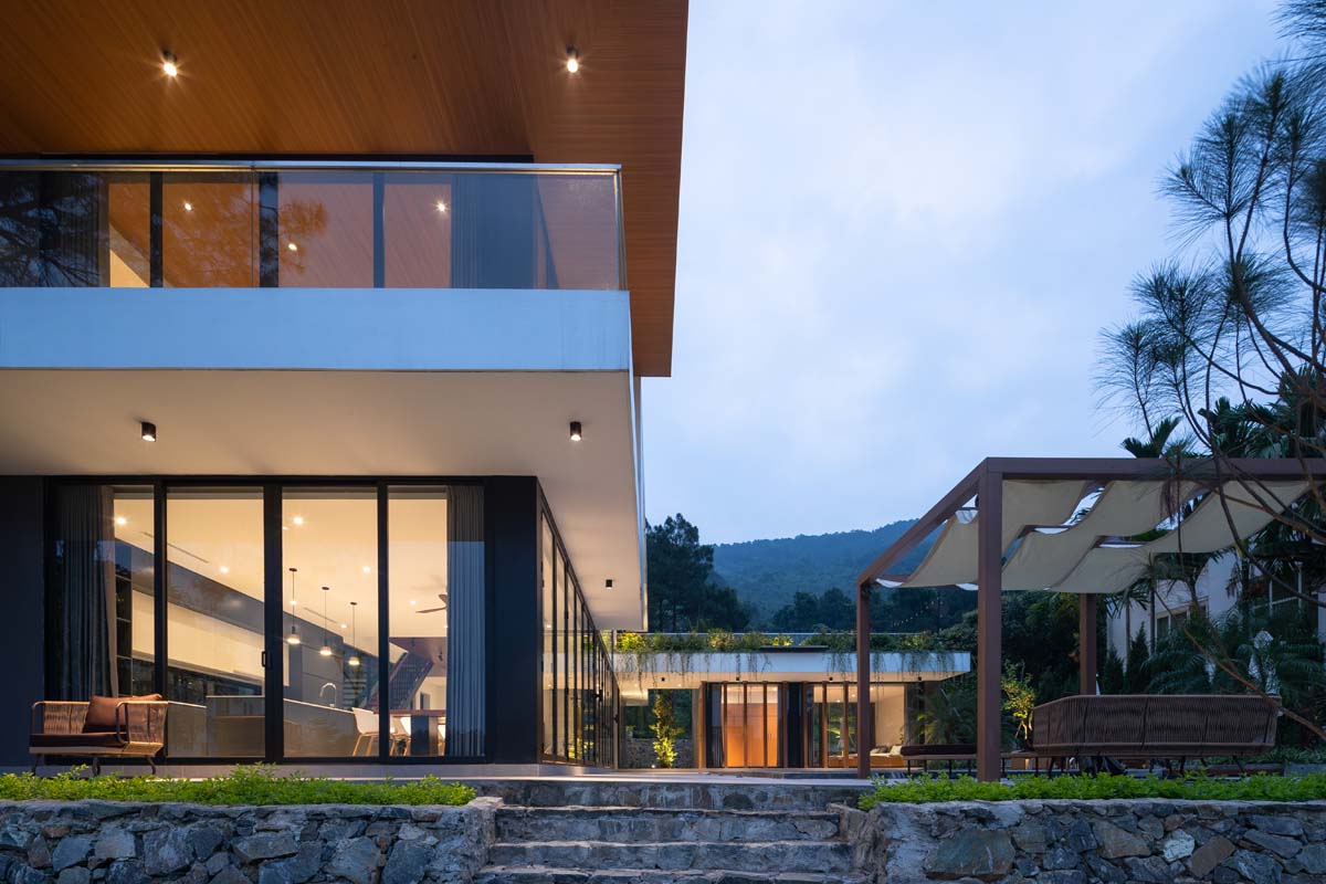 KTS thiết kế một cấu trúc hành lang trong suốt ở giữa 2 góc nhìn này, để không gian có thể kéo dài liên tục về các hướng. Công trình bao gồm khối nhà 1 tầng và 2 tầng vuông góc và đan vào nhau, bố cục các khối nhà được tính toán để các luồng gió có thể thổi xuyên qua toàn bộ khu nhà, che nắng vào buổi chiều và tận hưởng khung cảnh đẹp phía trên núi ở buổi bình minh.