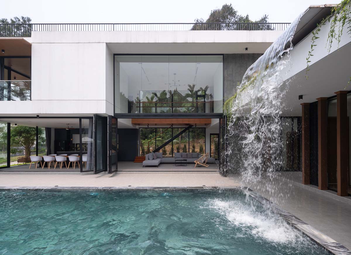 Một bể bơi rộng được bố trí giữa sân chung này, kết nối với một sàn gỗ, sân thượng của khối nhà thấp có thể được kết nối với sân dưới bằng một cầu thang ngoài. Nơi đây là một sân ăn tối ngoài nhà, có một thác nước lớn đổ xuống bể bơi tạo ra cảnh quan ngoạn mục, là điểm nhấn chính cho căn nhà.