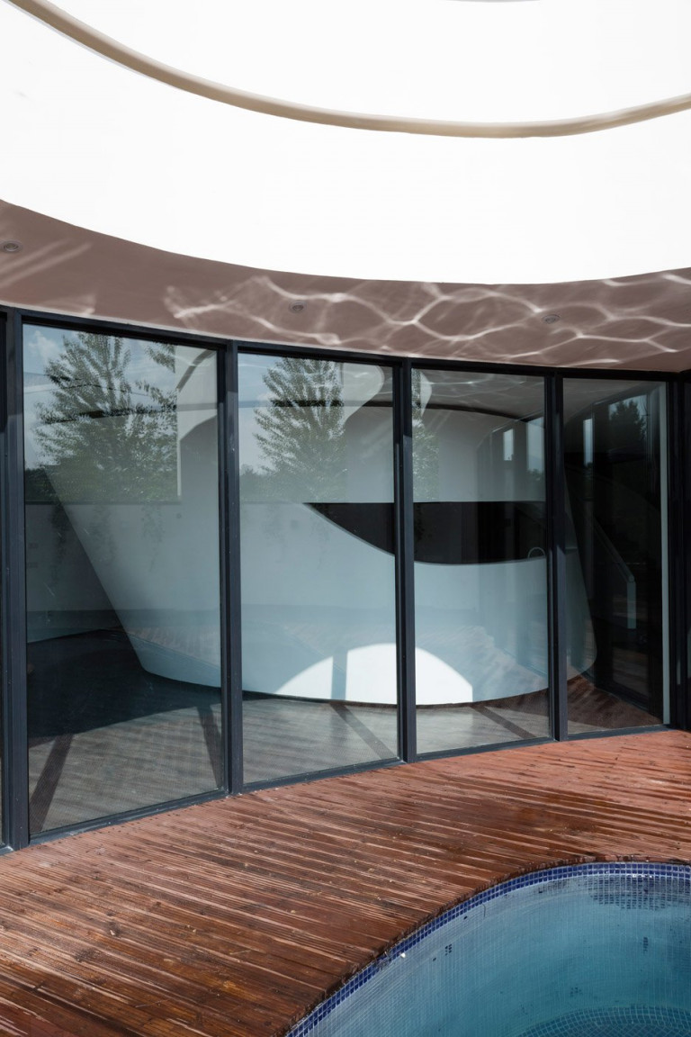 Những chiếc cửa kính trượt cũng có độ cong nhất định khi uốn quanh sân sau