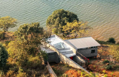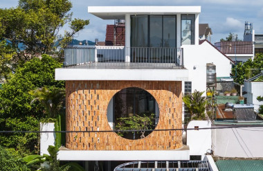 Ngôi nhà có hệ vách bê tông treo và tường gạch ngoài mặt tiền nhằm che mưa nắng trực tiếp,…