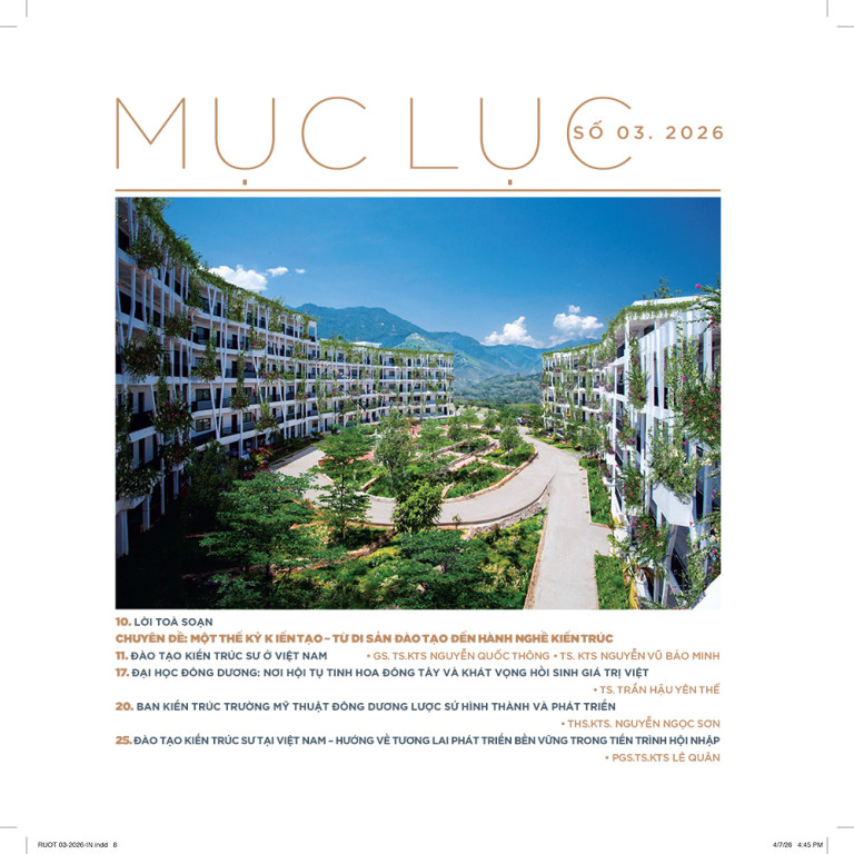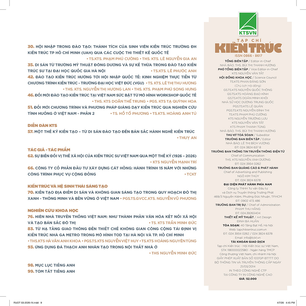 Tạp chí Kiến trúc số tháng Ba/2026 trân trọng giới thiệu với bạn đọc Chuyên đề: “Một thế kỷ kiến tạo – Từ di sản đào tạo đến bản sắc hành nghề kiến trúc” với những bài viết gợi mở sự đối thoại giữa các thế hệ, nhìn nhận những giá trị nội tại của giới nghề, tái định nghĩa vị thế của KTS trong hệ sinh thái sáng tạo hiện đại – Để nghề Kiến trúc tiếp tục sứ mệnh dẫn dắt trong công cuộc kiến tạo bản sắc, xây dựng hệ sinh thái sáng tạo trong kỷ nguyên mới. Đó cũng là một trong những nội dung thiết thực hướng tới Ngày Kiến trúc Việt Nam – 27/04/2026.