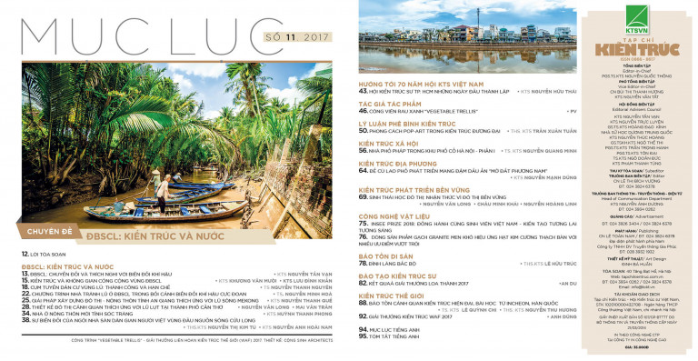 Trong bối cảnh ấy, TCKT số 11/2017 mong muốn giới thiệu những trăn trở và sáng tạo của KTS trong Chuyên đề: “ĐBSCL: Kiến trúc và Nước” với mục tiêu khai thác yếu tố nước trong kiến trúc để định cư thích ứng, bền vững mà vẫn giữ được nét riêng của văn hóa ĐBSCL. Đó cũng là chủ đề của “Gặp gỡ Mùa thu 2017” diễn ra tại TP Tân An, Long An – một hoạt động chuyên môn đã trở thành truyền thống của Hội KTS Việt Nam. Trong đó 2 nội dung chính được các bài viết đi sâu, là: Nhìn nhận lại những thành công và hạn chế trong công tác tôn nền vượt lũ và xây dựng nông thôn mới ở ĐBSCL.